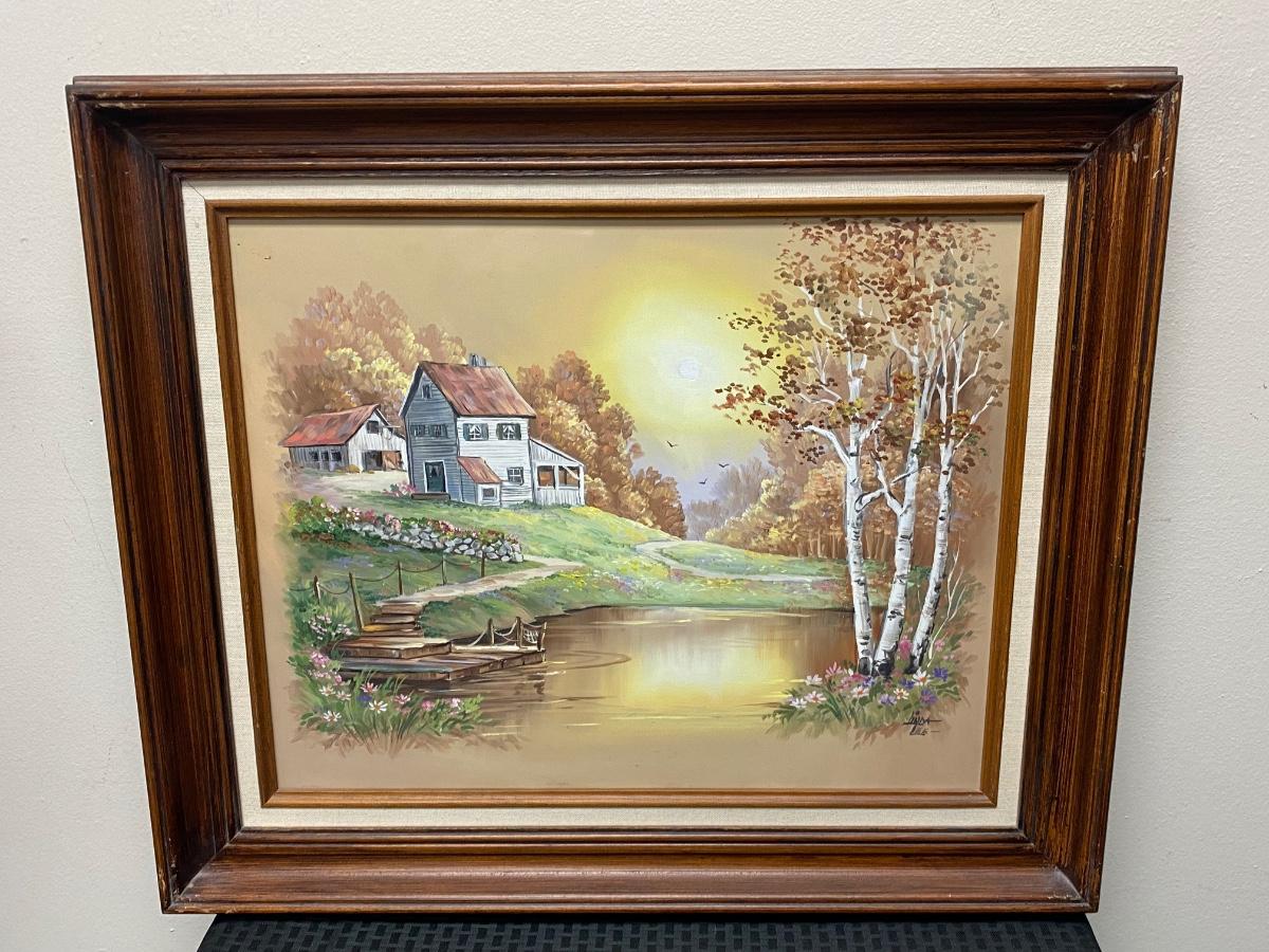Framed Painting Cottage Farmhouse by Pond Artist Signed