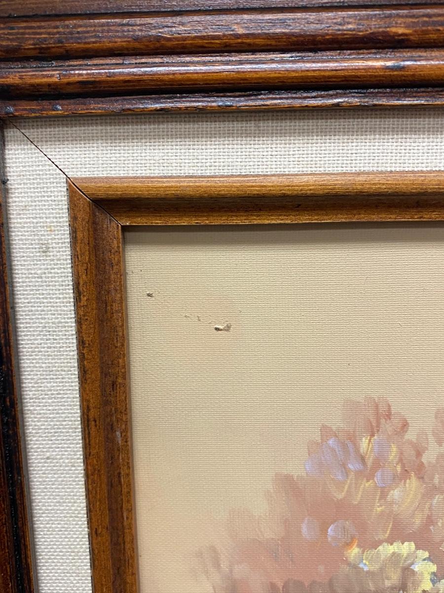 Framed painting of a farmhouse next to pond. Nicely done. Artist signed in lower right corner. Small spots of damage on upper left corner. About 26"x22" size.