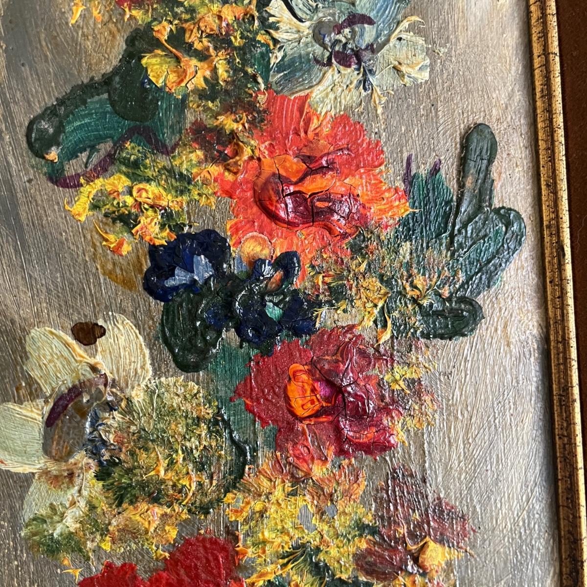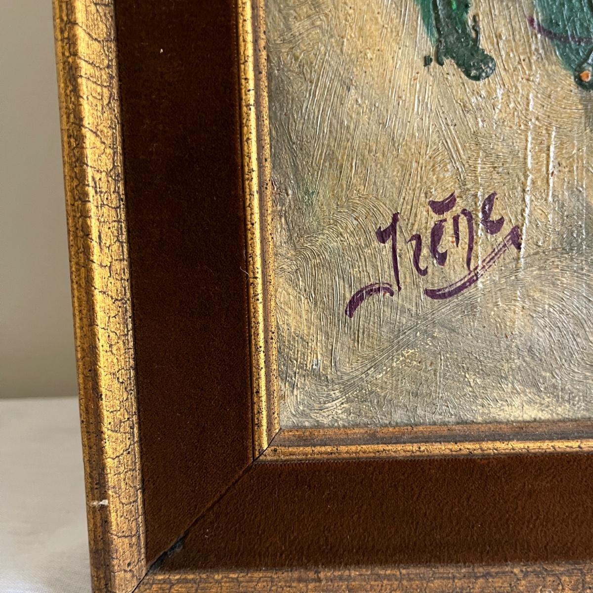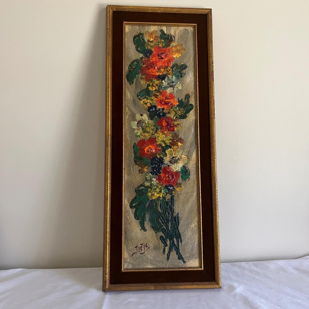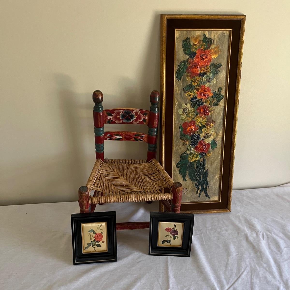 Lot includes a wooden framed signed painting, two plastic framed floral pieces of art, and a wooden framed woven seat doll chair. Largest frame with the painting measures 10” x 25”H. Painting has some cracks and there is a piece missing from paint, see pictures.