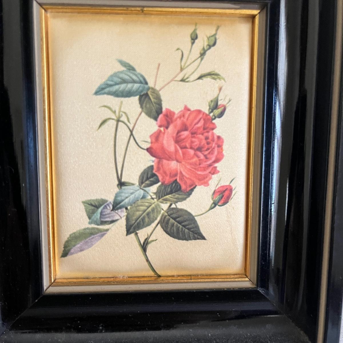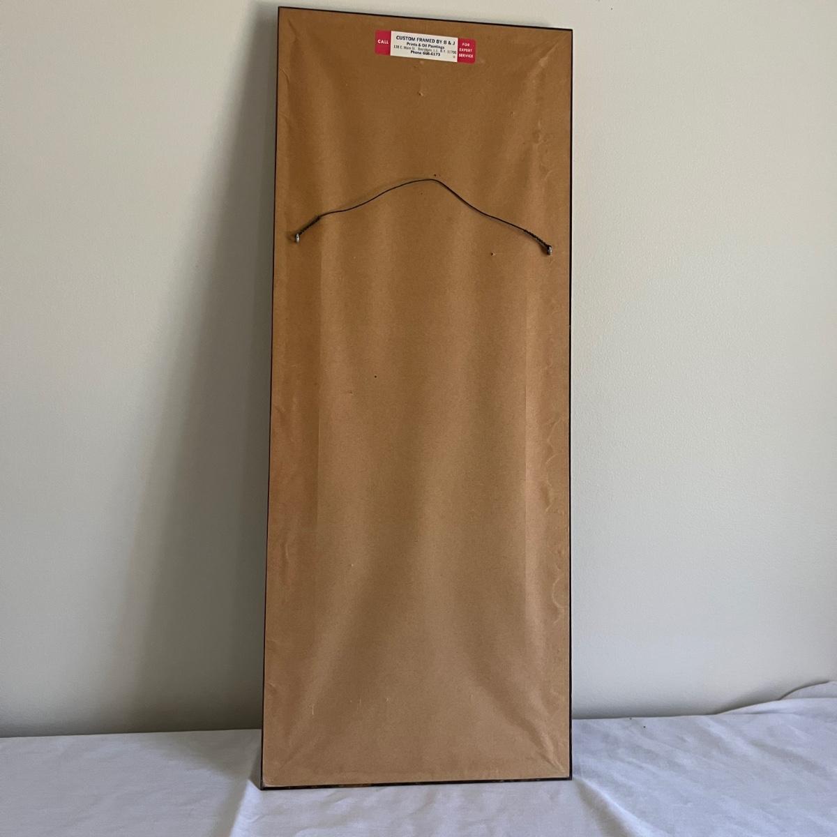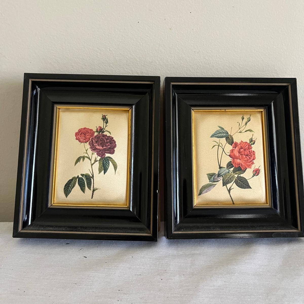 Lot includes a wooden framed signed painting, two plastic framed floral pieces of art, and a wooden framed woven seat doll chair. Largest frame with the painting measures 10” x 25”H. Painting has some cracks and there is a piece missing from paint, see pictures.