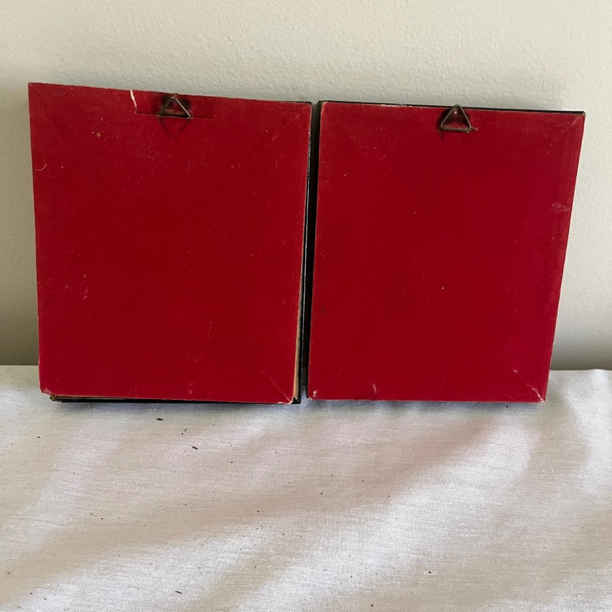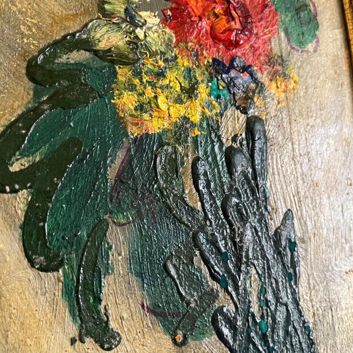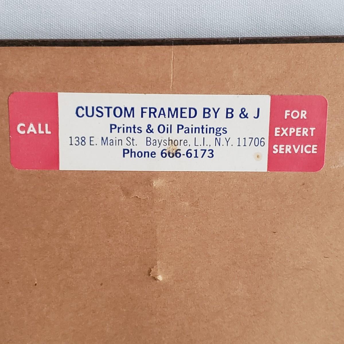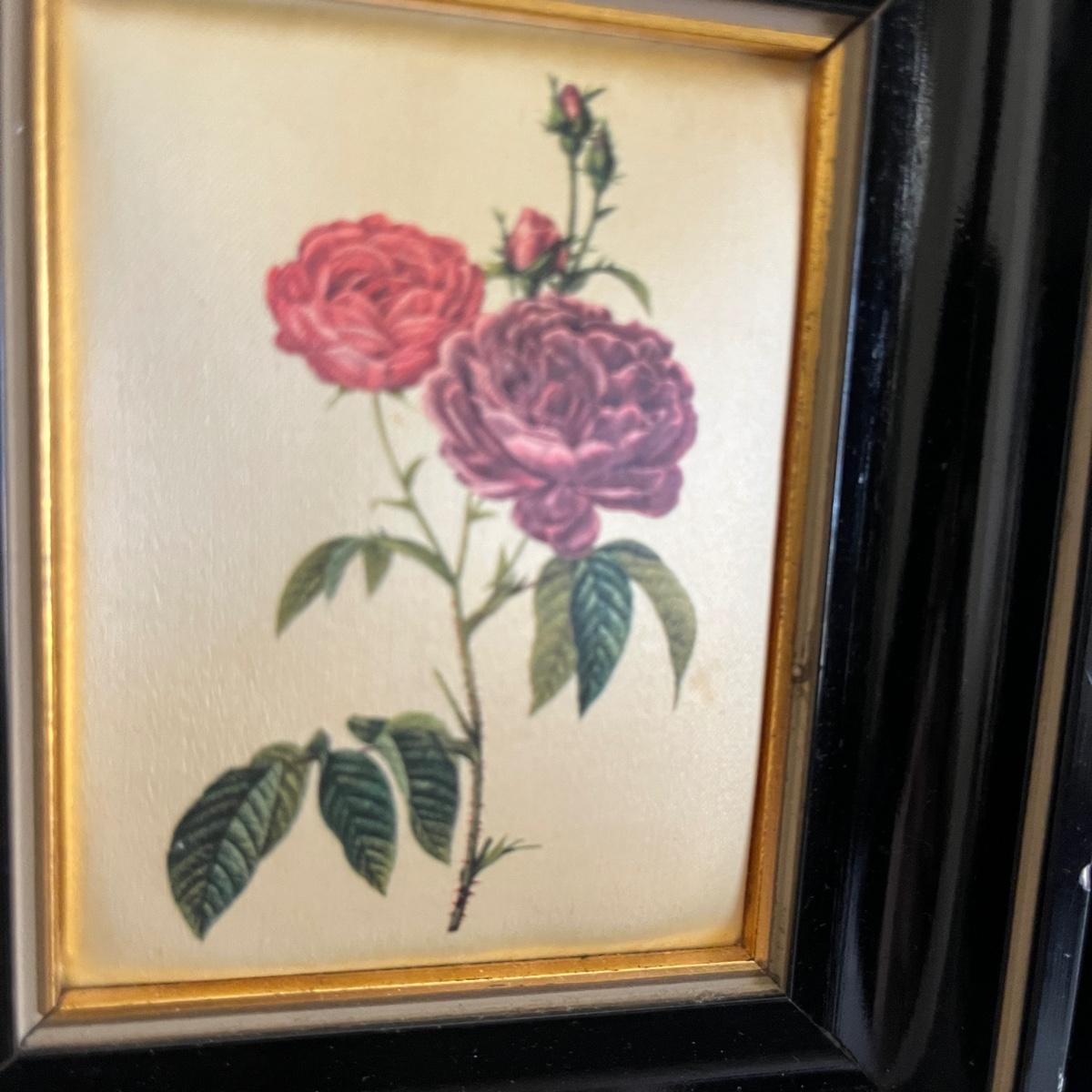 Lot includes a wooden framed signed painting, two plastic framed floral pieces of art, and a wooden framed woven seat doll chair. Largest frame with the painting measures 10” x 25”H. Painting has some cracks and there is a piece missing from paint, see pictures.