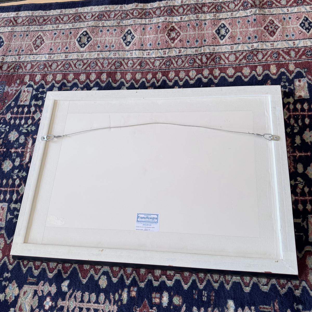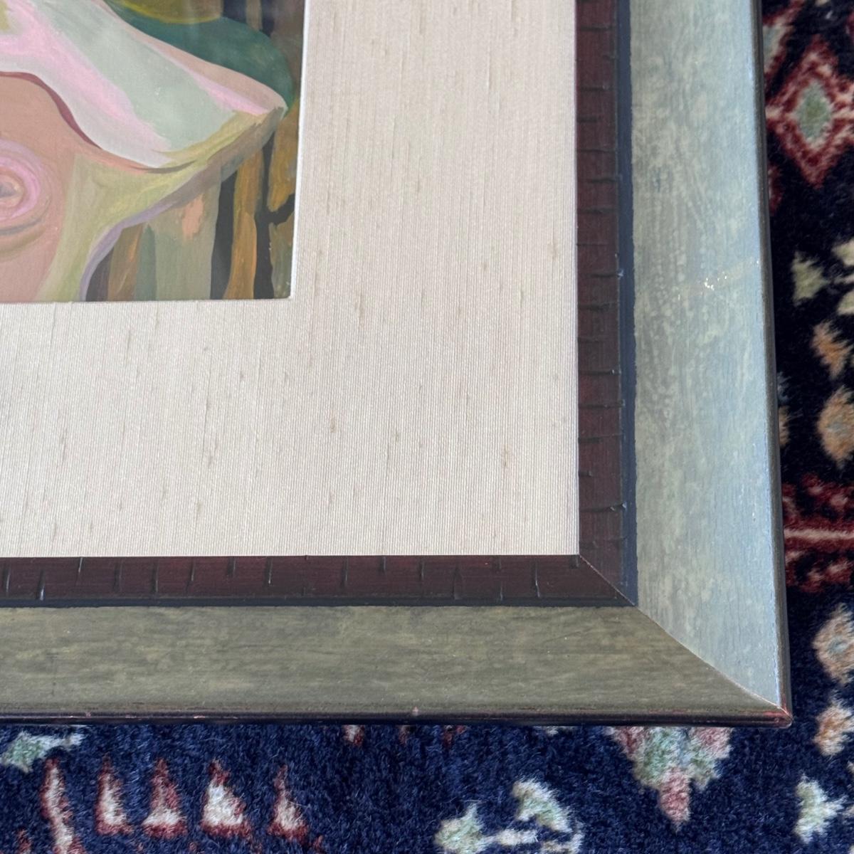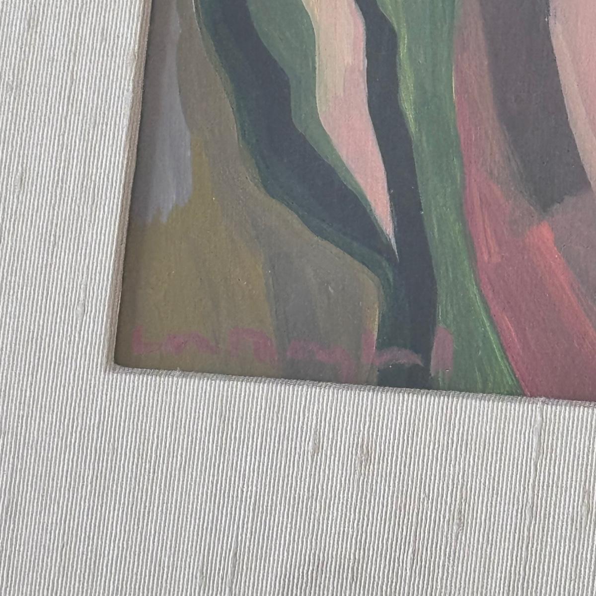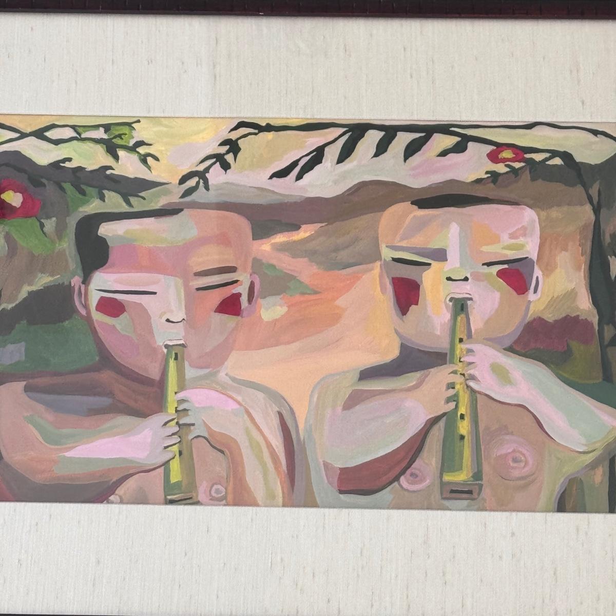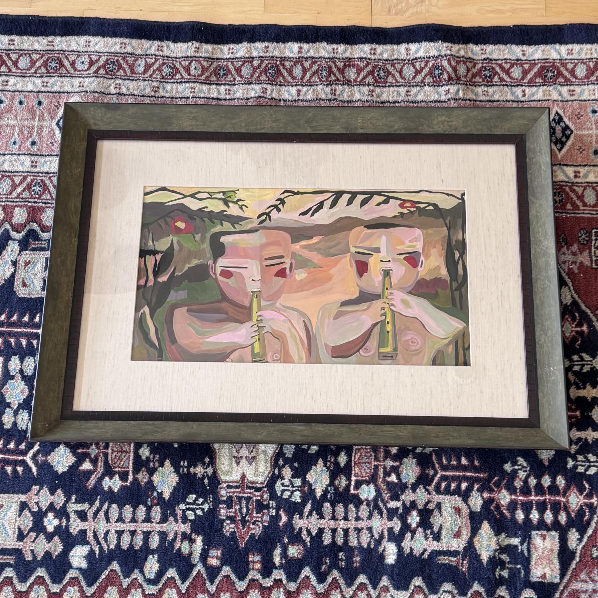 This lot includes one painting of two flute players in a nature setting. The art appears to be signed in the bottom left and on the back is written "Our Fire on Earth". The art is protected with a layer of glass, matting, and a wooden frame that’s been painted a light green colored. The frame measures 31” x 22”H. Shipping available.