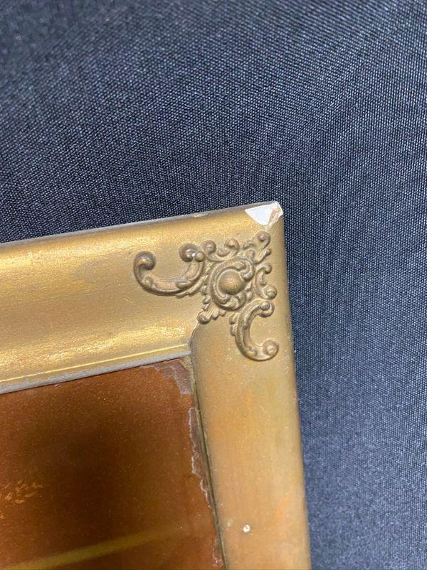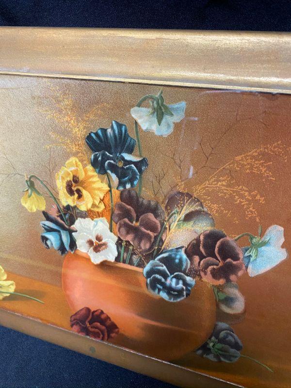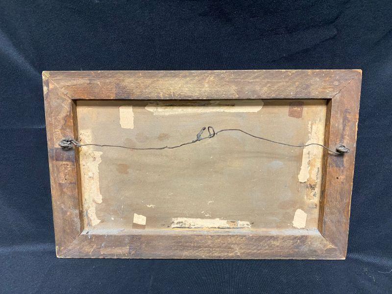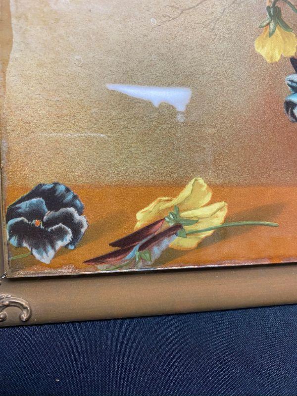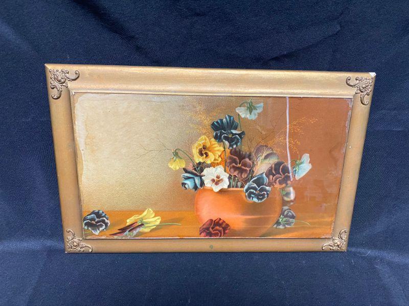 Pansy flowers in a pot painting. Art work is under glass. Some damage to the frame corners. About 10.5"x16.5".