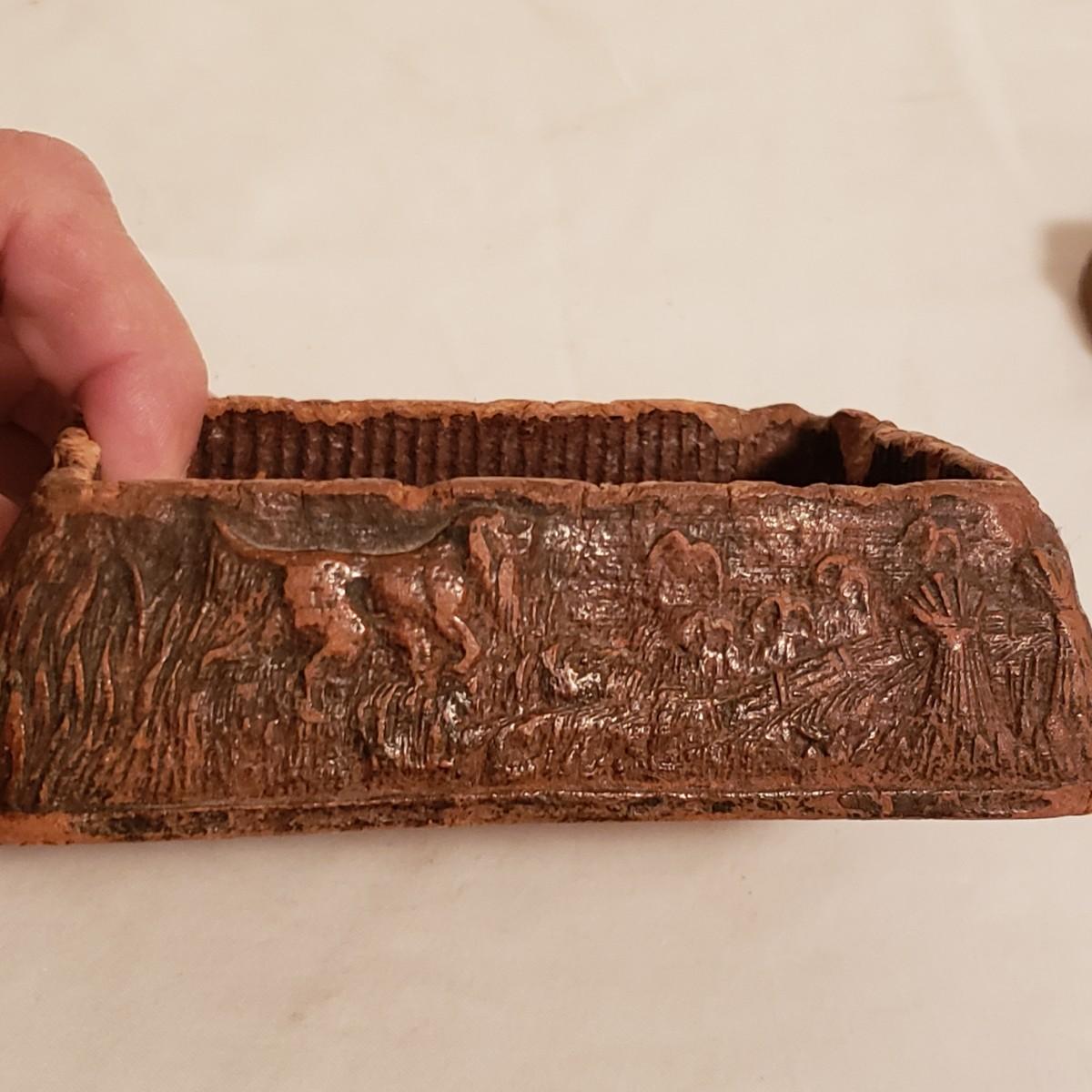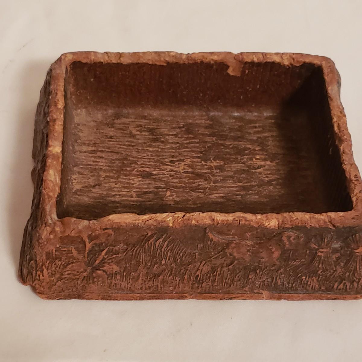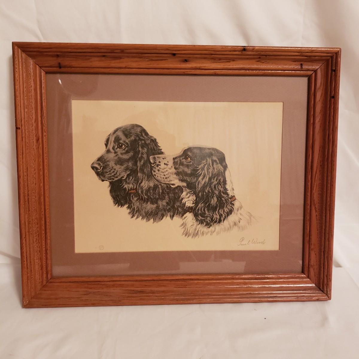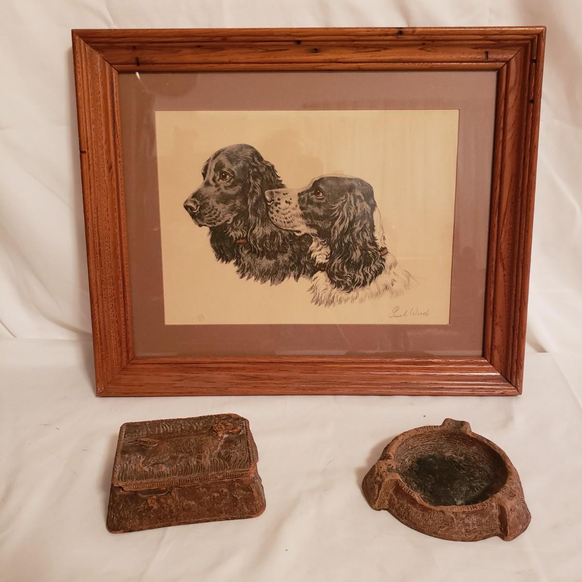 This lot has a wooden frame print by Paul Wood. The signed picture is matted behind glass measures 16" x 13"H. There are matching trinket box and ashtray. Both pieces appear to be a composite wood. They are both well loved. See pictures for details.