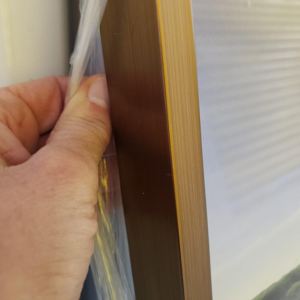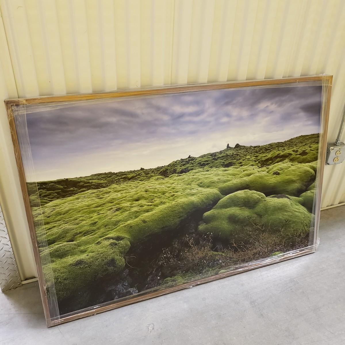 This gold metal framed photograph is of a landscape in Iceland. The large frame measures approximately 60" x 48". We photographed it with the wrapping still on the frame for protection, see picture of frame for details.