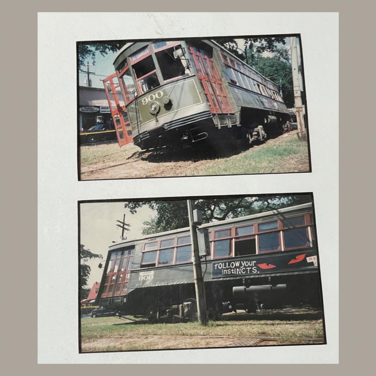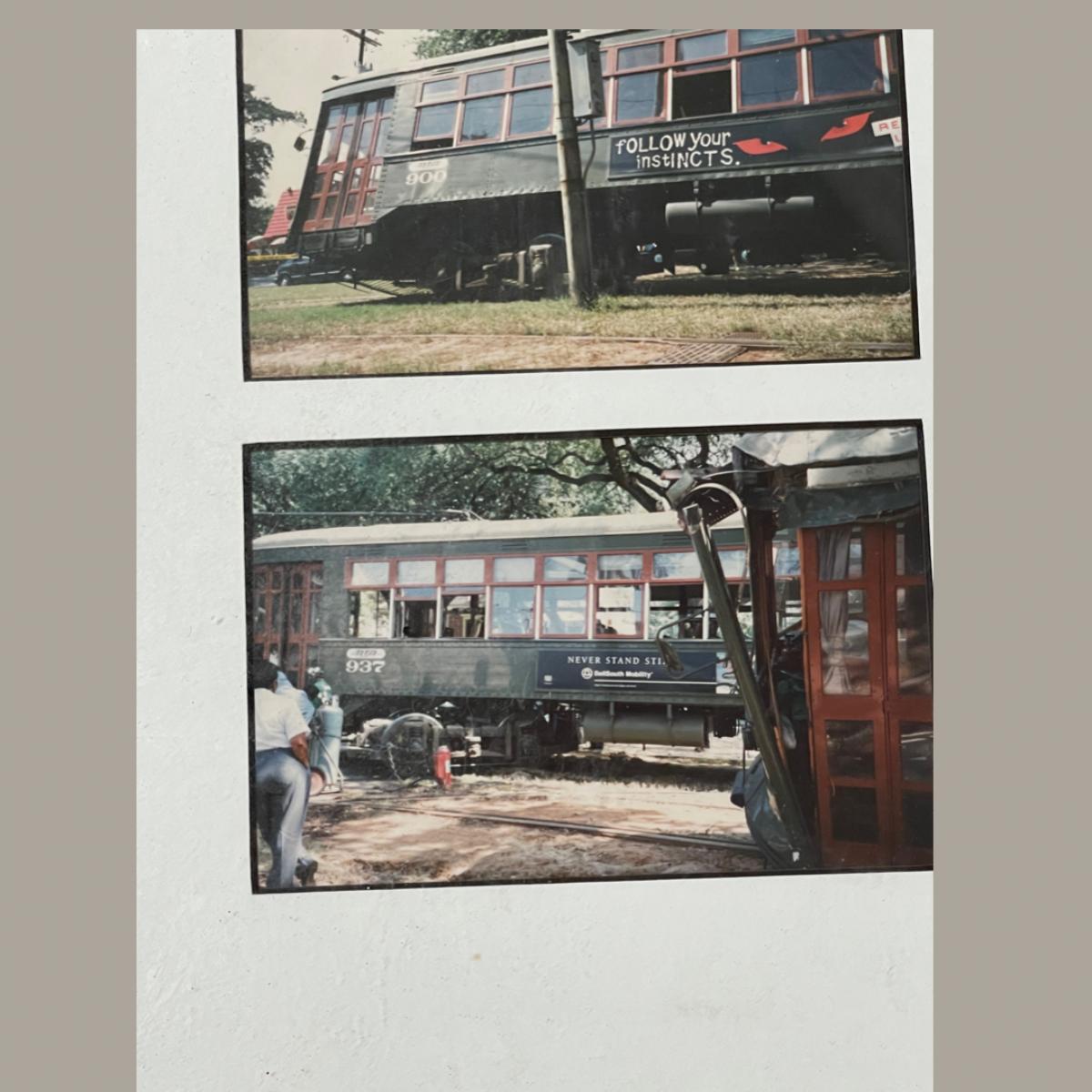 This is an historical piece of wall art. It shows the damage from Katrina that some of the street cars in New Orleans received.