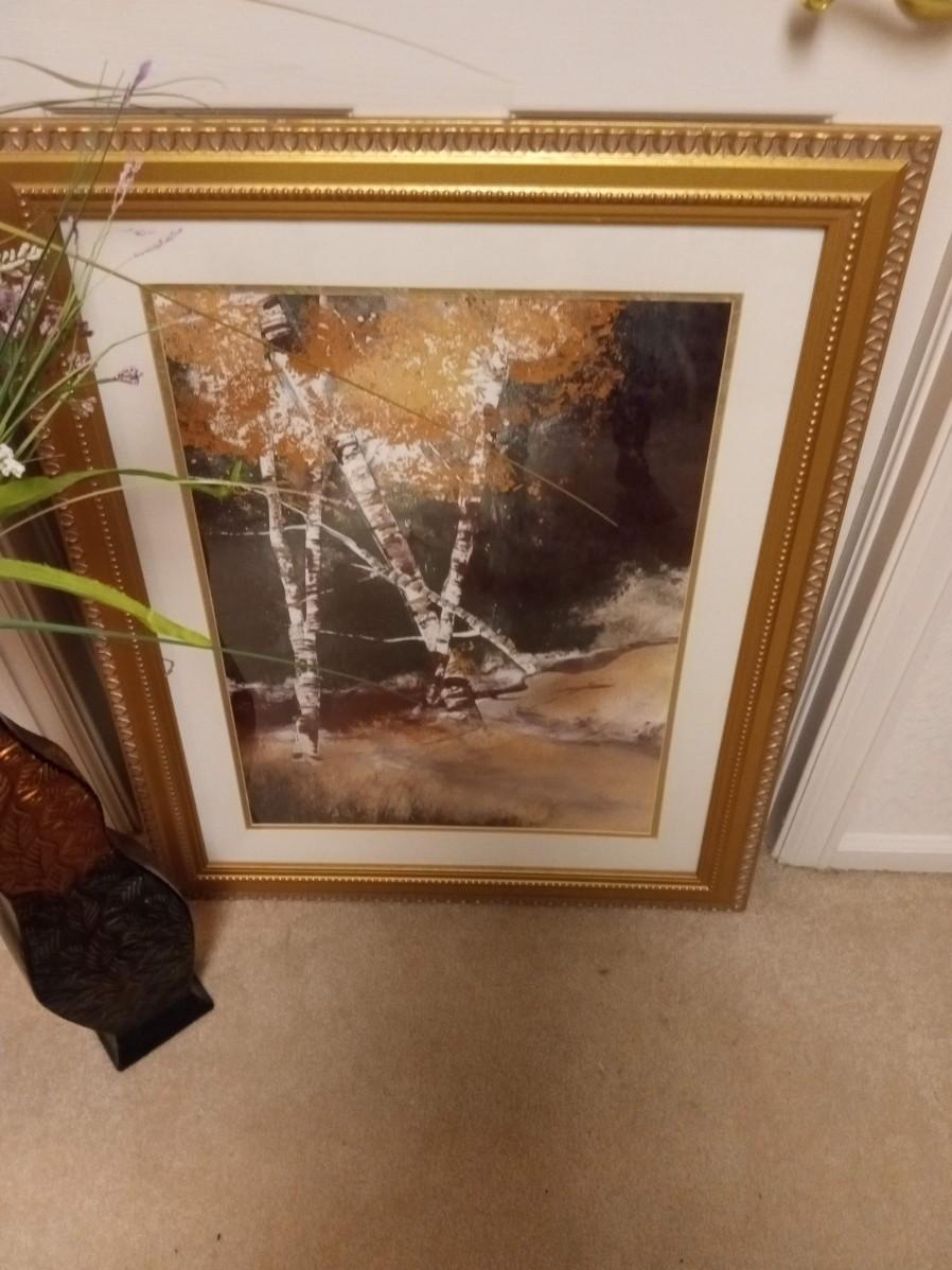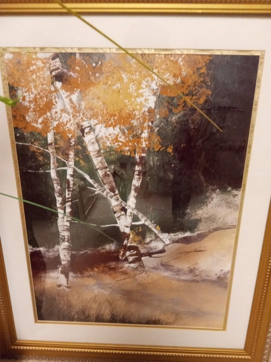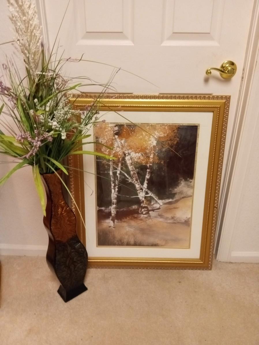 FRAMED PICTURE OF ASPENS IN THE FALL AND A METAL VASE WITH FAUX FOLIAGE