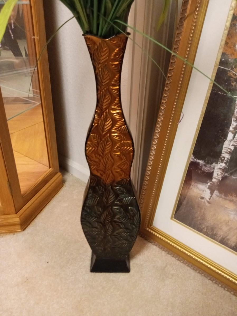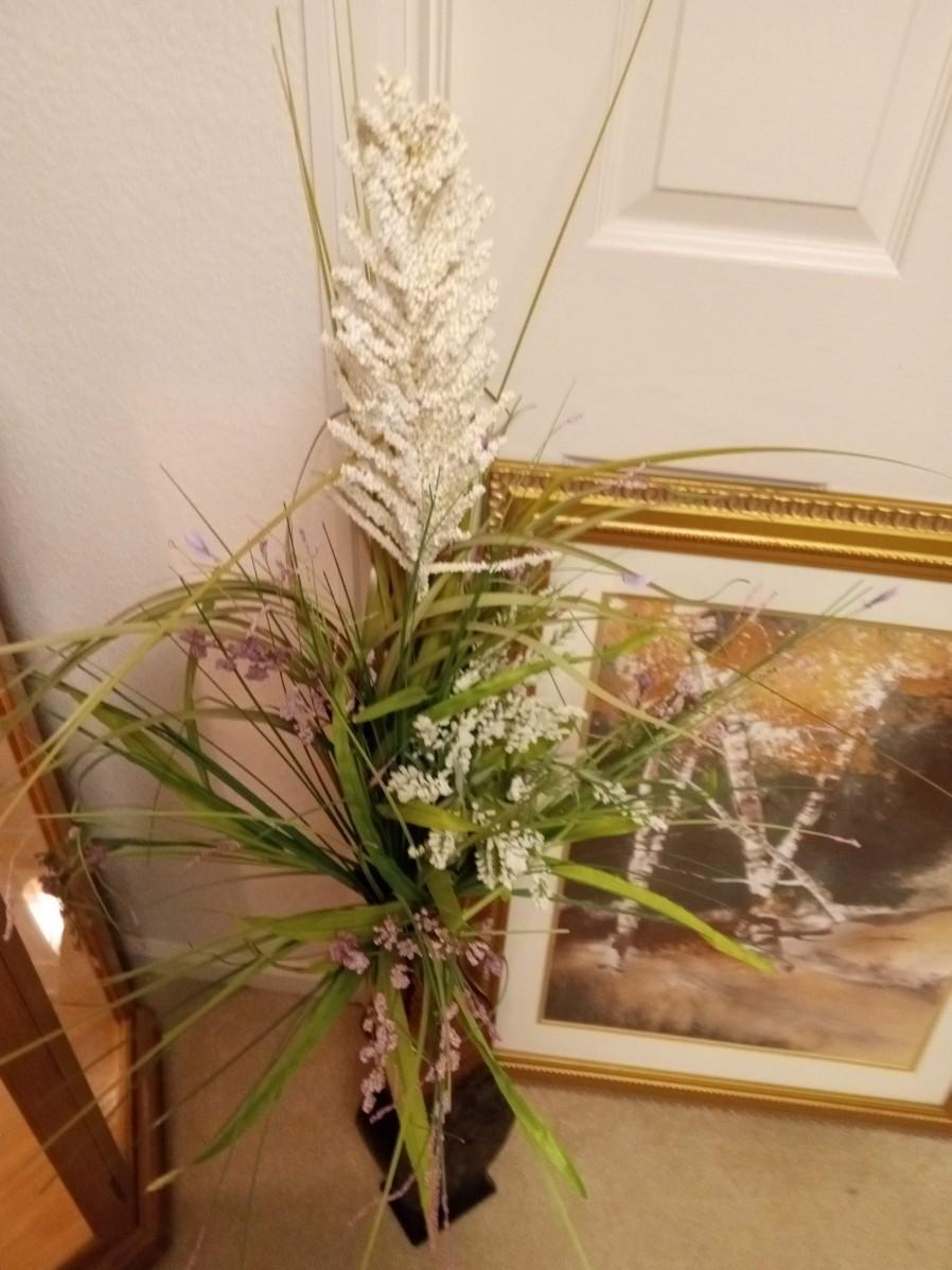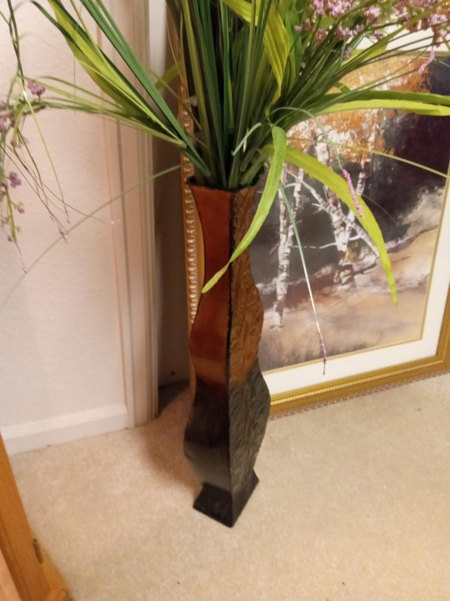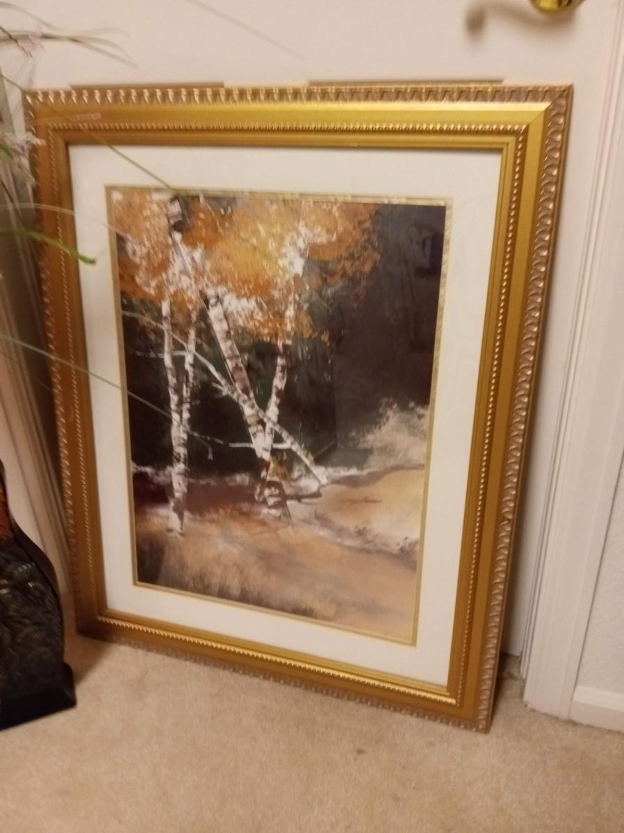 FRAMED PICTURE OF ASPENS IN THE FALL AND A METAL VASE WITH FAUX FOLIAGE