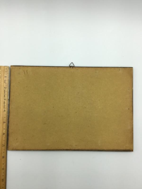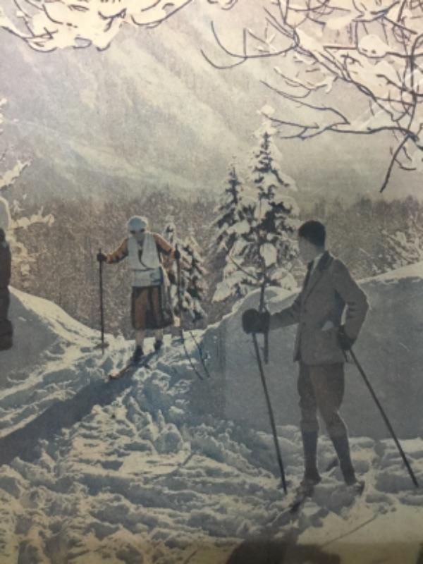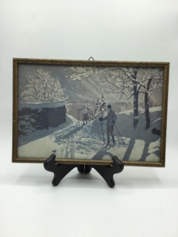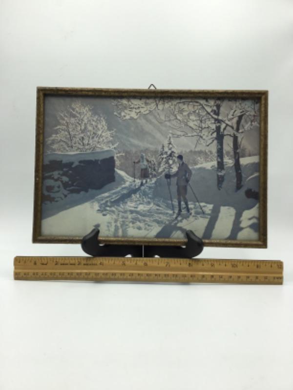 Vintage framed print picture of a couple skiing in the snow. Picture measures 10 3/4 x 7 1/2.