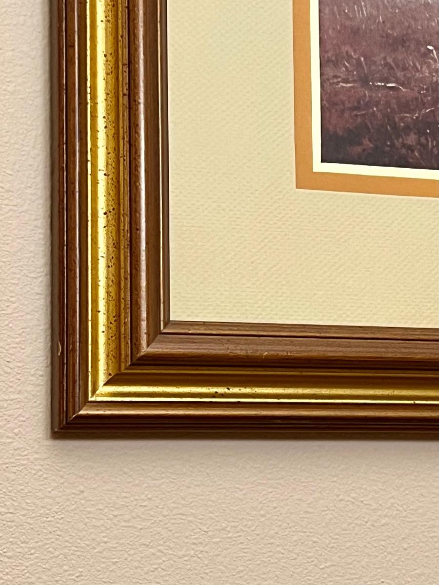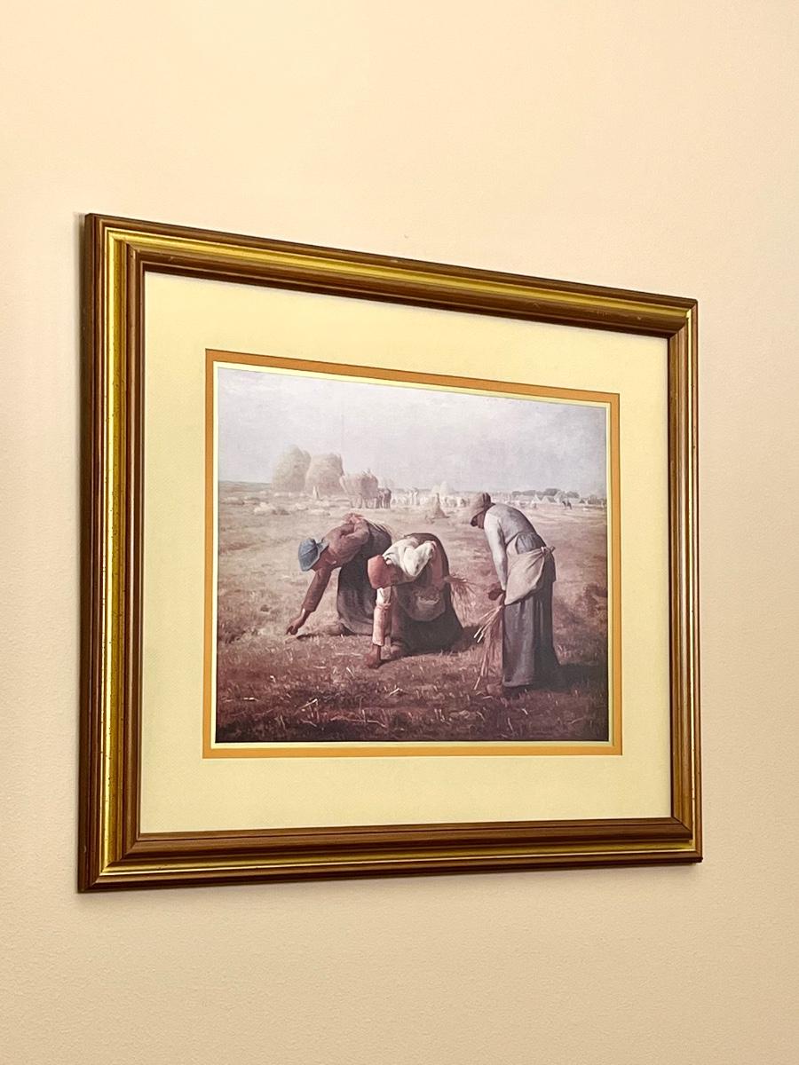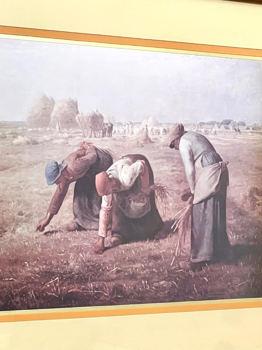 It depicts three peasant women gleaning a field of stray stalks of wheat after the harvest. ~ 30.25” H x 36.25” W