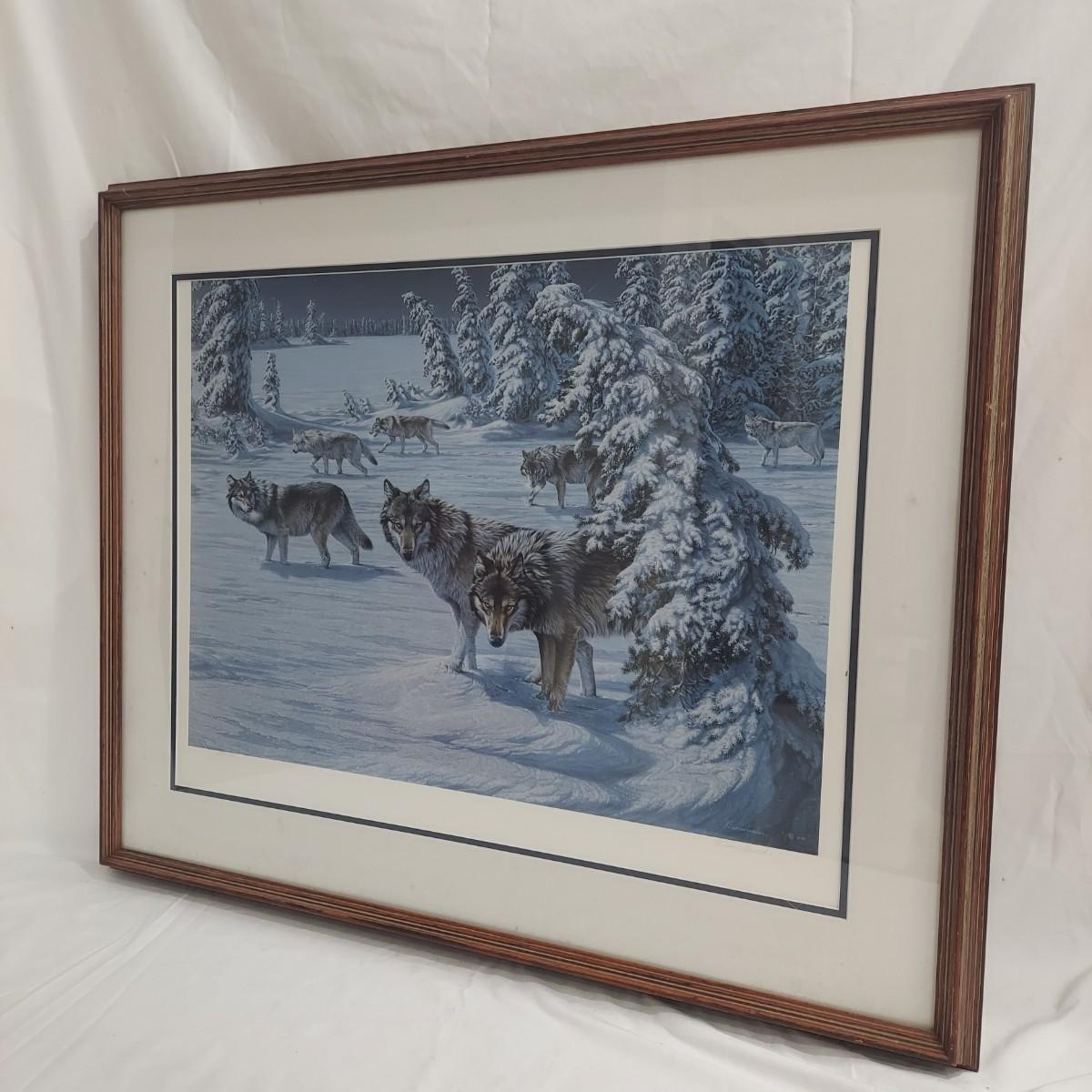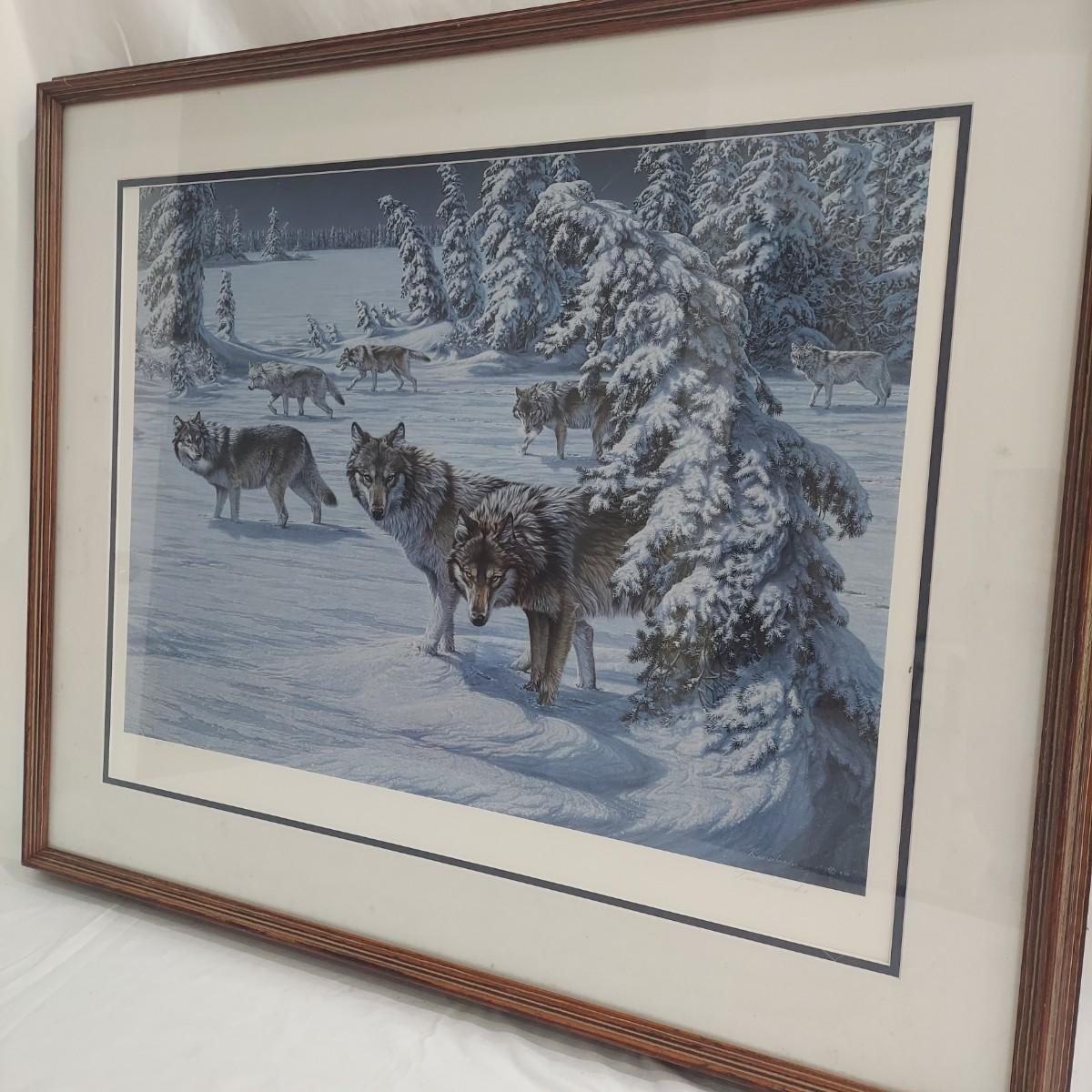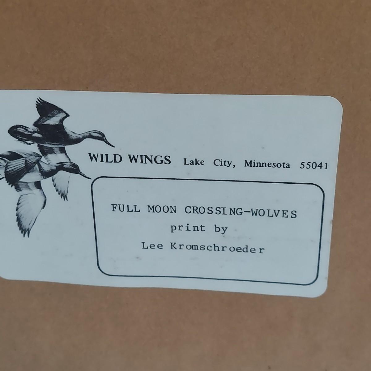 Print of Full Moon Crossing–Wolves by Lee Kromschroeder is under glass and in a large wooden frame that measures 32” x 26"H. Please see photos for details. Shipping available. Shipping certain items can be costly. We suggest contacting our preferred local shipping provider, Postage Express, with dimensions and getting an estimate before bidding: (828) 255-9250 or shipping@postageexpressnc.com