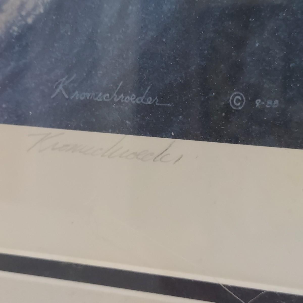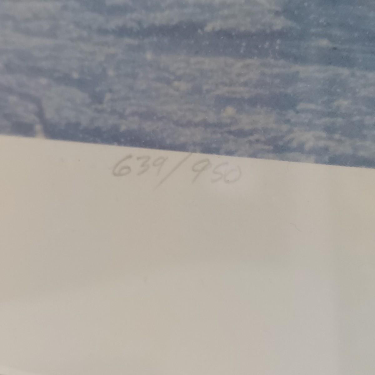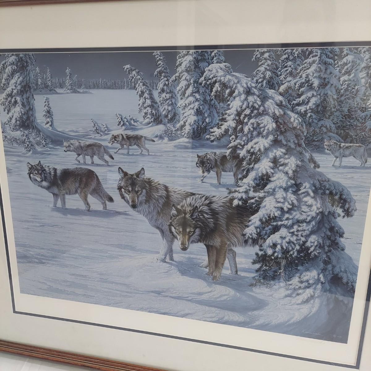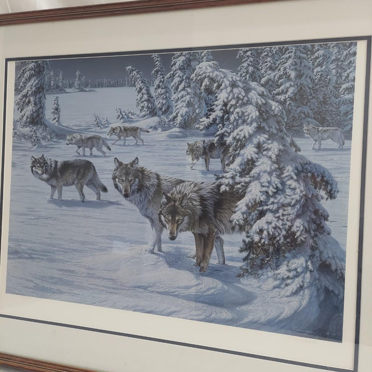 Print of Full Moon Crossing–Wolves by Lee Kromschroeder is under glass and in a large wooden frame that measures 32” x 26"H. Please see photos for details. Shipping available. Shipping certain items can be costly. We suggest contacting our preferred local shipping provider, Postage Express, with dimensions and getting an estimate before bidding: (828) 255-9250 or shipping@postageexpressnc.com