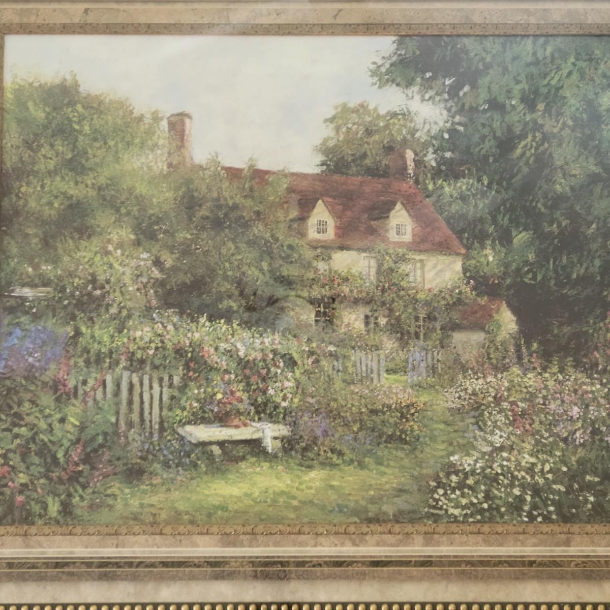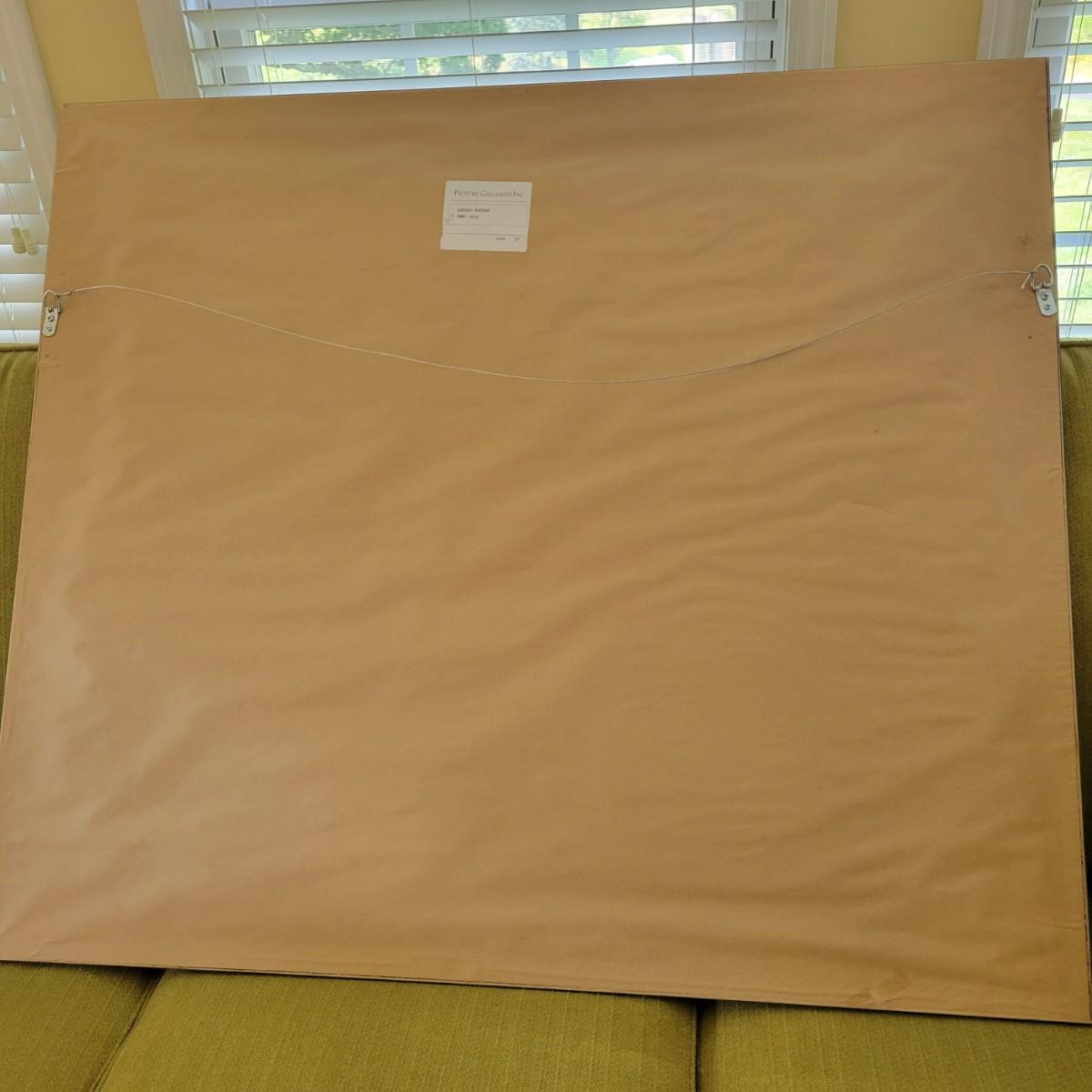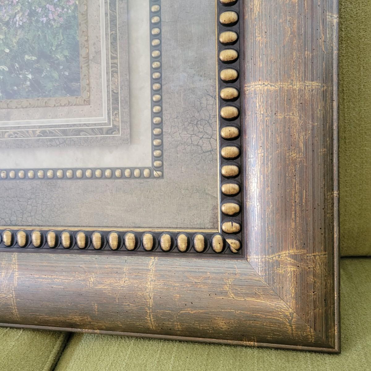 A framed print titled "Garden Retreat" that measures approximately 46" x 40"H. It has six mat layers with two fillets and an antiqued gold wood frame. Shipping available. Shipping can be costly. We suggest contacting our preferred local shipping provider, Postage Express, with dimensions and getting an estimate before bidding: (828) 670-5501 or postageexpress@yahoo.com.