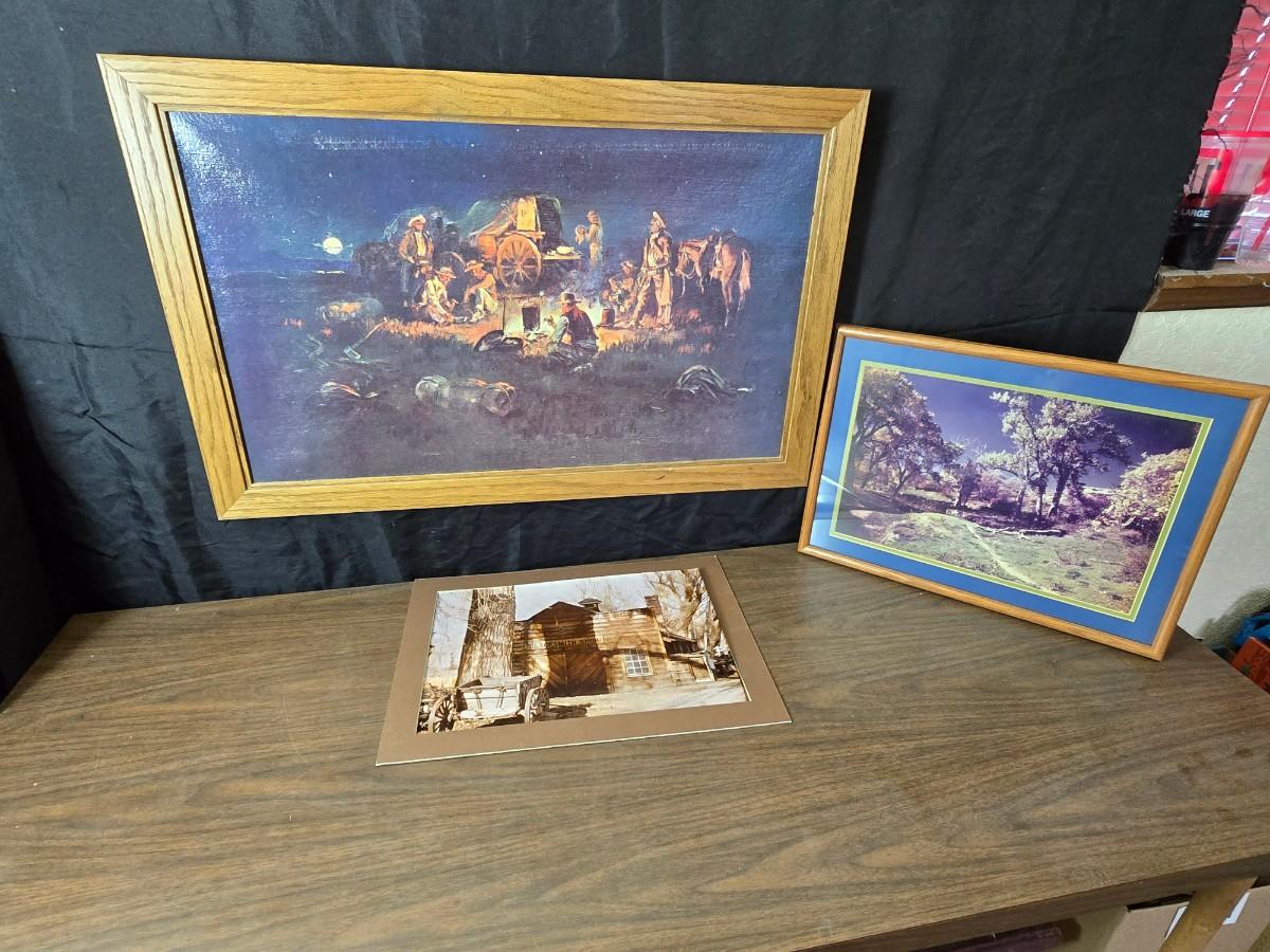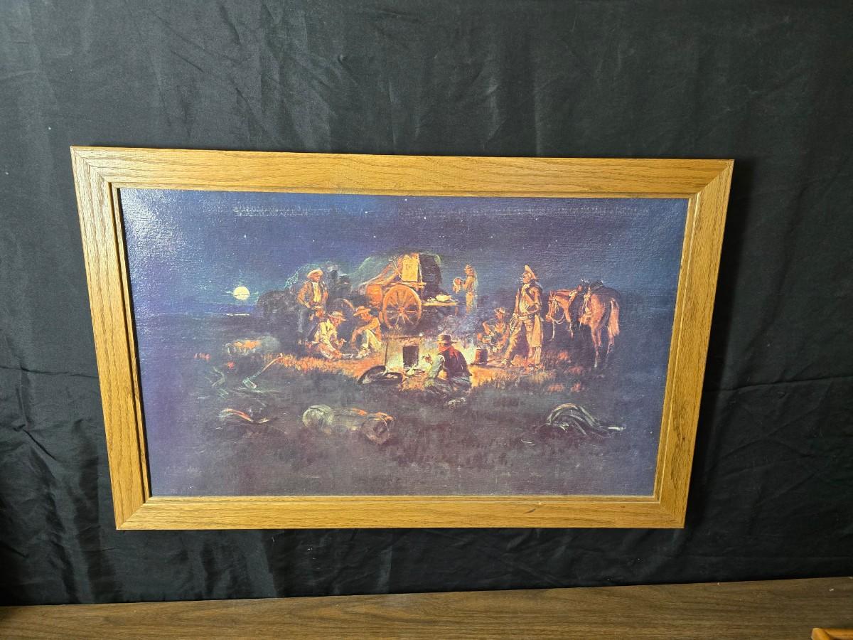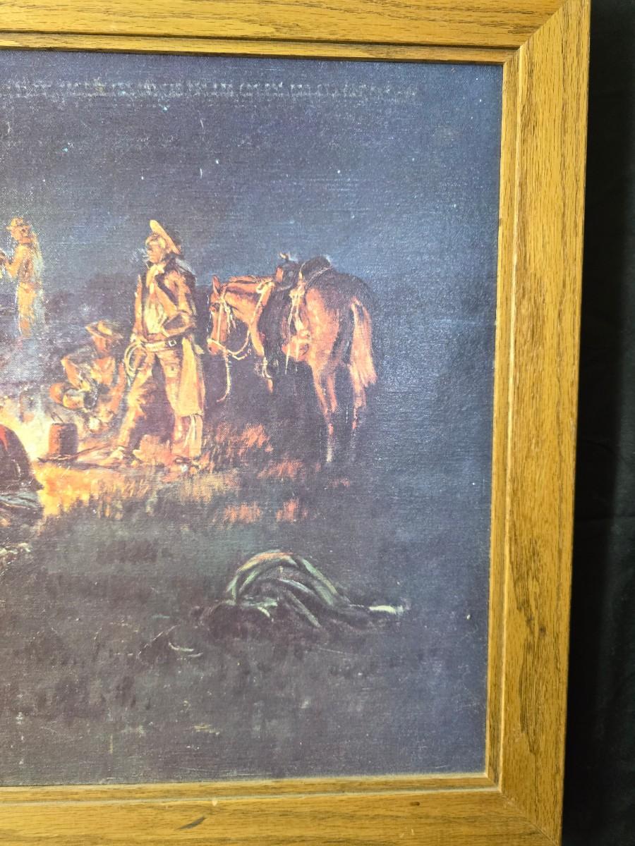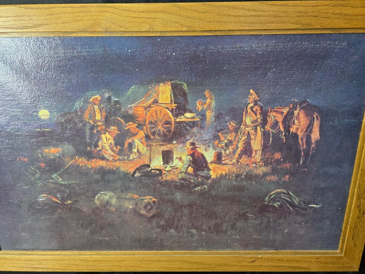 Framed print Laugh Kills Lonesome by artist Charles Marion Russell. with two other pieces of artwork