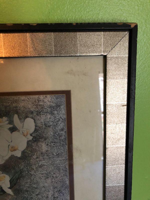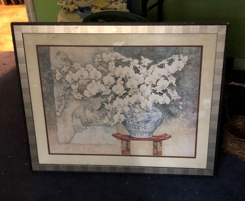 This is a pretty print of flowers on a stool and it is in great condition. It measures about 30.5" x 24".
