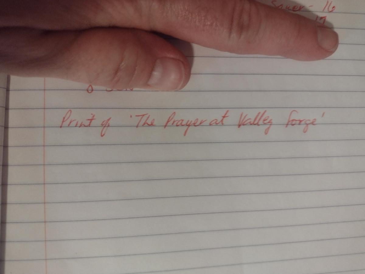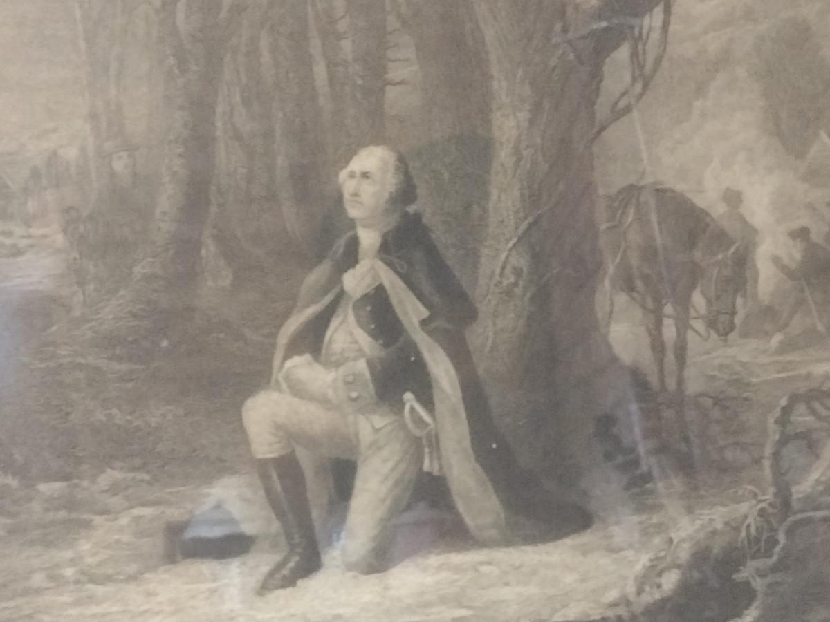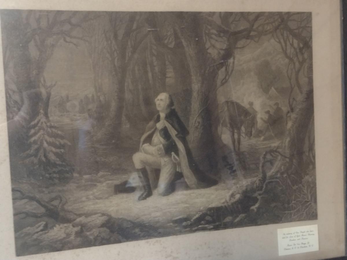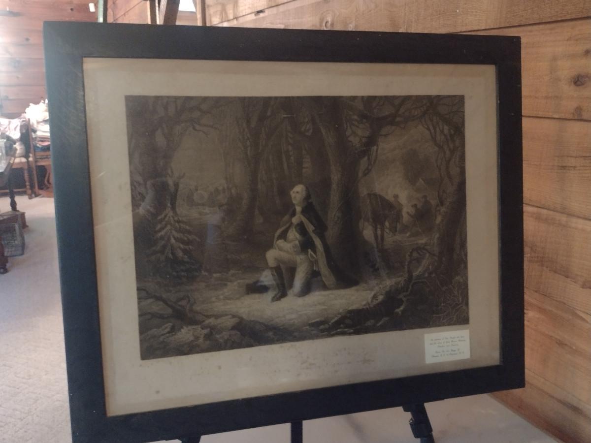 Framed Print of 'Prayer at Valley Forge'- Approx 30" x 24 1/2". Item has some foxing/discoloration- please see all pictures. Shipping is by third party only such as UPS Store. Auction firm will make sure item is available for buyer's shipper of choice to pick item up and who will do all packing and shipping for the buyer. Buyer agrees to pay all fees associated with the shipping of this item.
