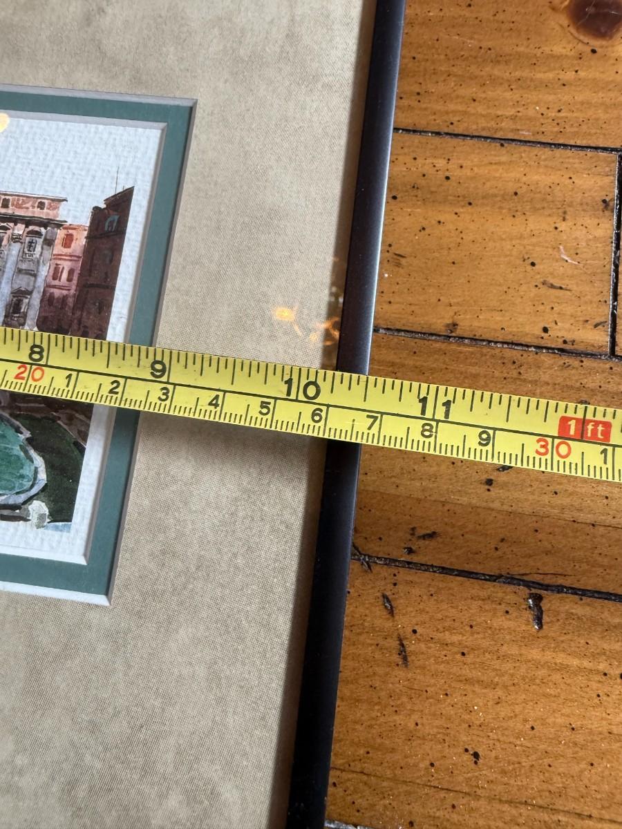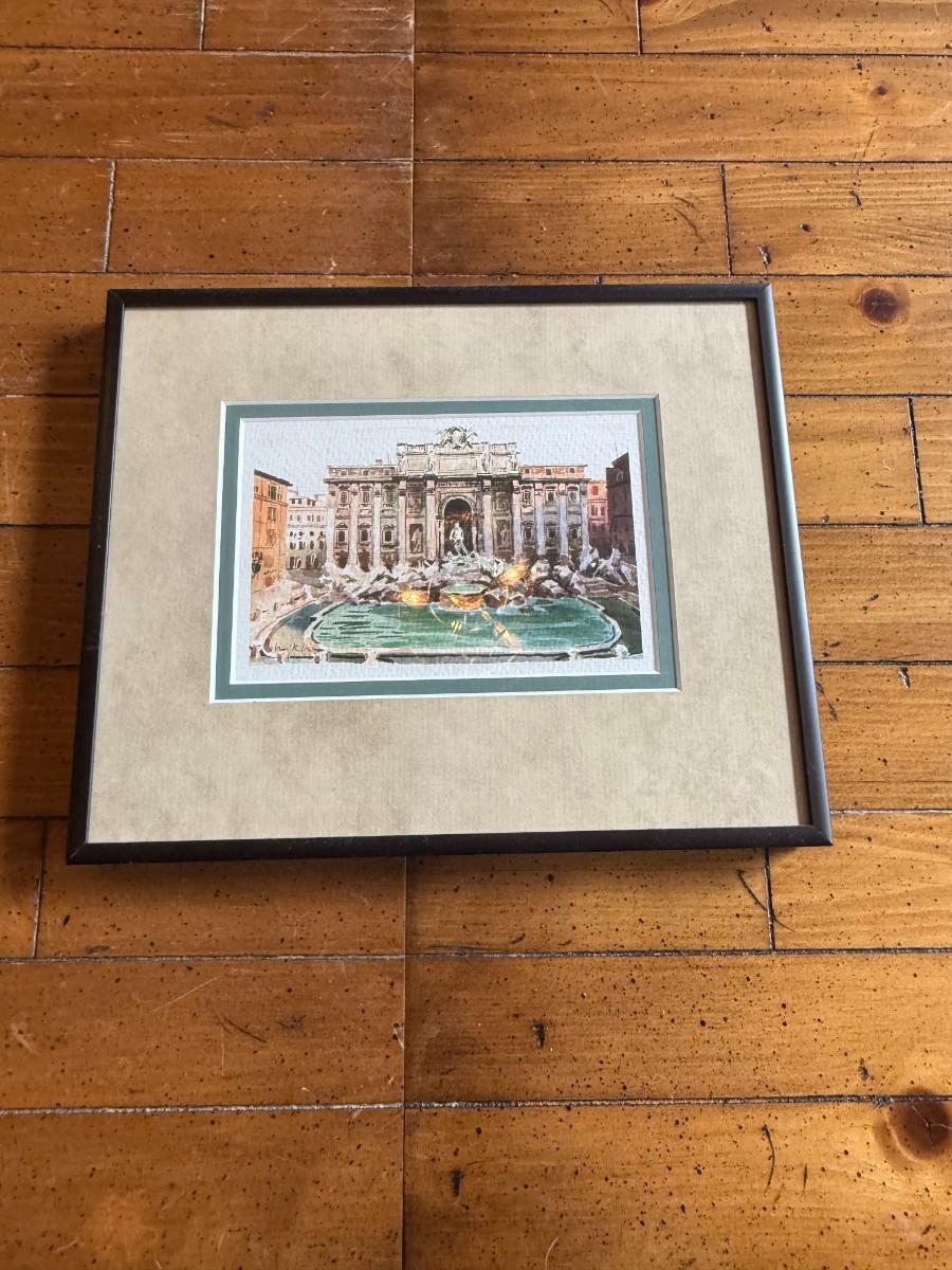 Description: Framed art print of the Trevi Fountain in Rome. Double matted with a light beige and green border. Classic tourist scene, likely a reproduction print.