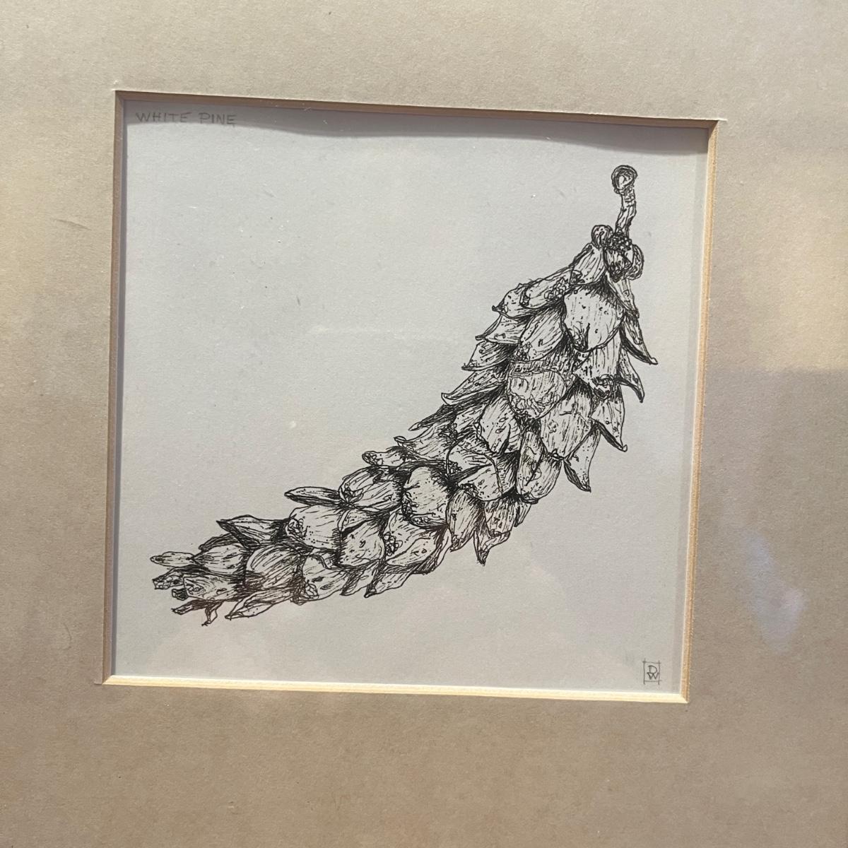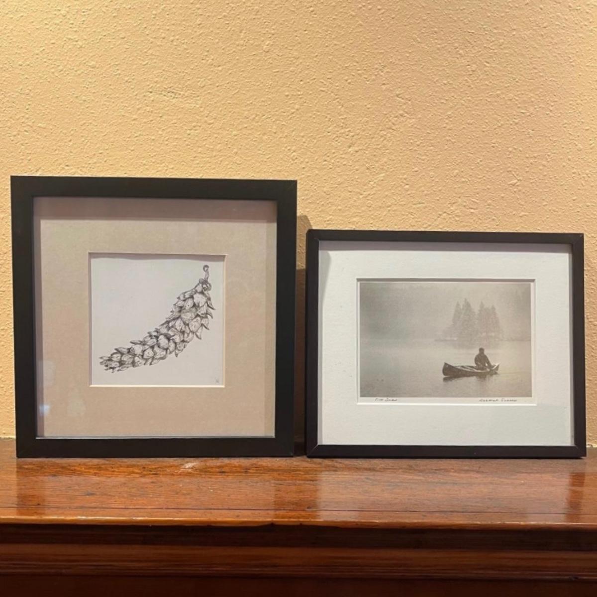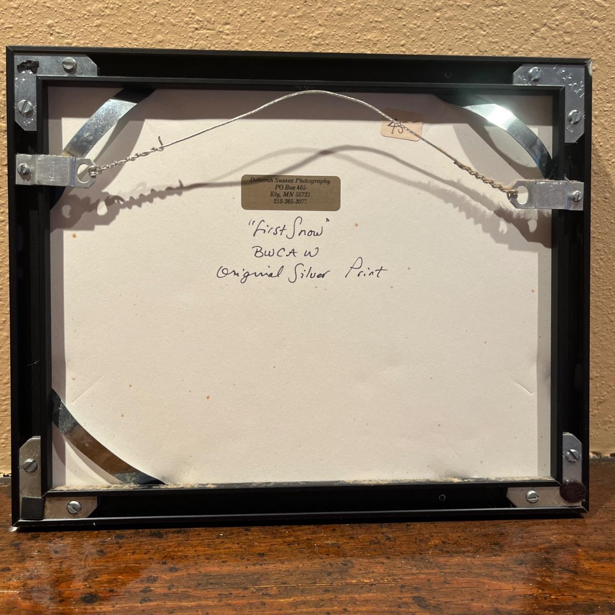 Lot includes a metal framed silver print by Deborah Sussex titled “First Snow" and a plastic framed printed drawing by Donna Wahmann titled “White Pine”. This piece is pencil-signed. Both are under glass. Largest frame measures 10” x 1.75” x 10”H.