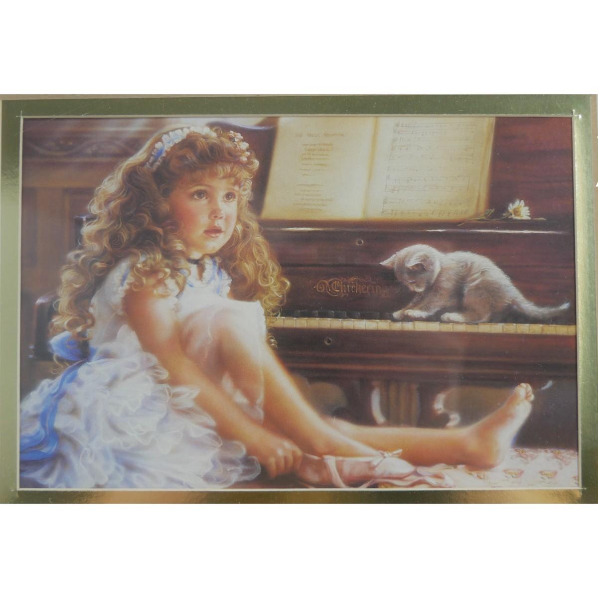 Two matted and framed prints of woman sitting with piano and young girl and cat with piano. Print of woman with piano has some wear (see photo). Good condition. Each artwork measures 6" x 4" and total frame measures L 11.5" x H 9.5" x D 0.75". Lot weighs 2 lbs. (A8)