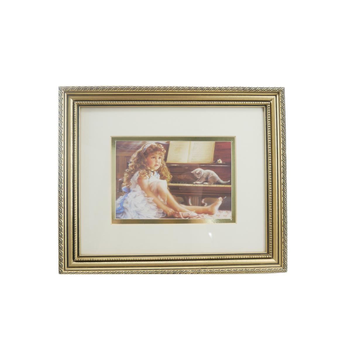 Two matted and framed prints of woman sitting with piano and young girl and cat with piano. Print of woman with piano has some wear (see photo). Good condition. Each artwork measures 6" x 4" and total frame measures L 11.5" x H 9.5" x D 0.75". Lot weighs 2 lbs. (A8)