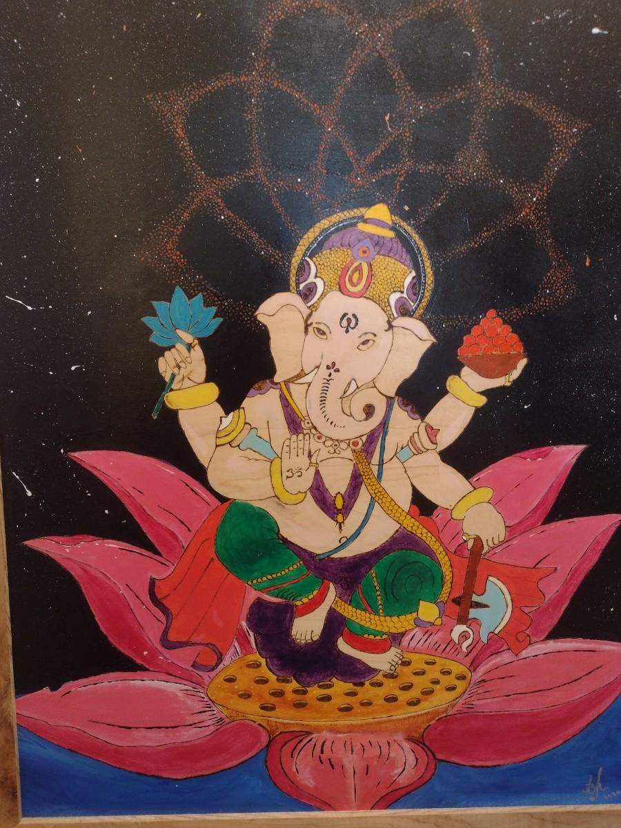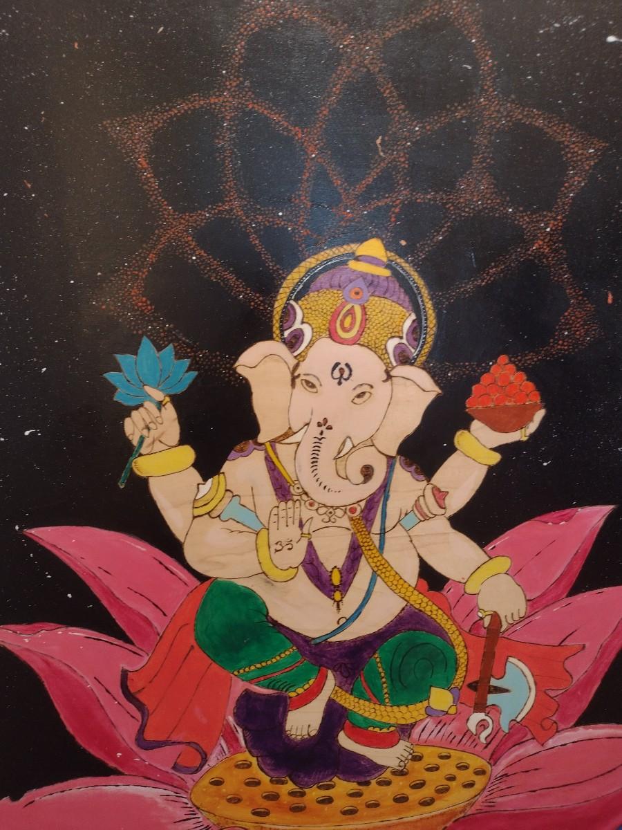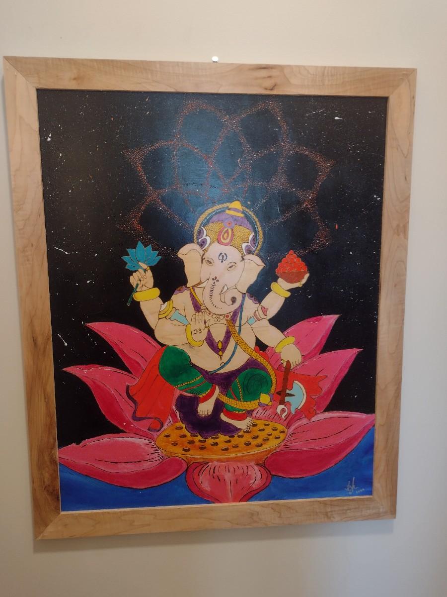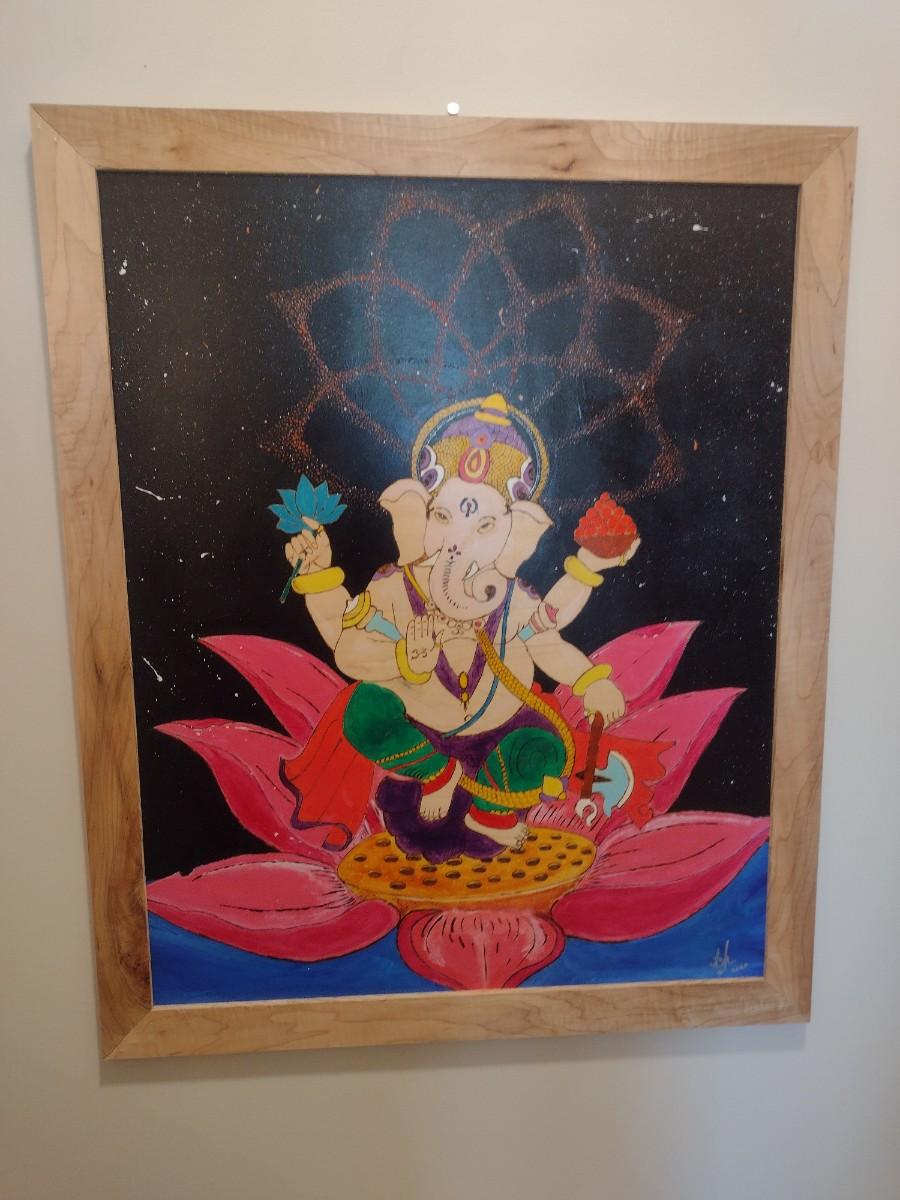 Framed Pyrographic Hand Painted Ganesha by Asheville Artist Jahn Morrison