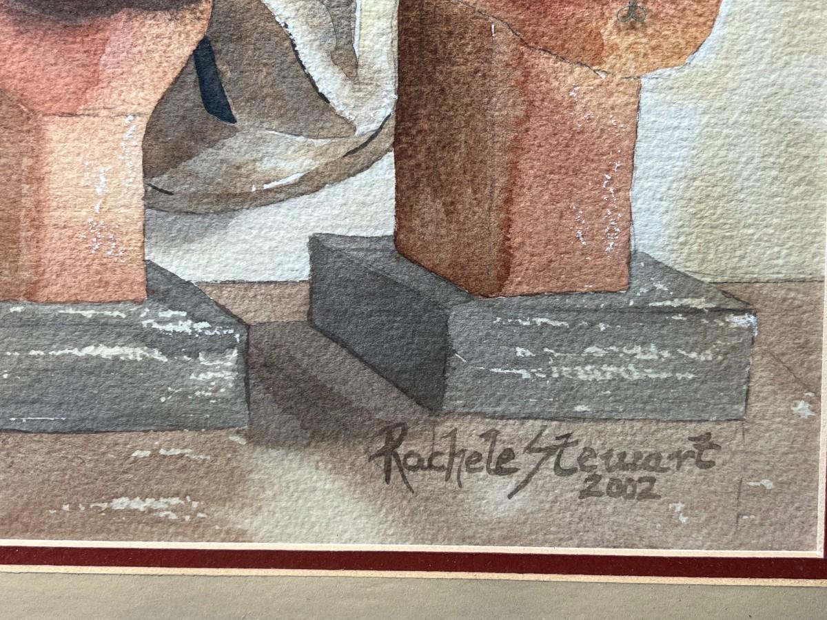 Framed Rachele Stewart Home Decor Art Watercolor of Hat Display, there is no significant damage to the frame or protect glass and is in good displayable condition. Check pictures for more details and for sizing.