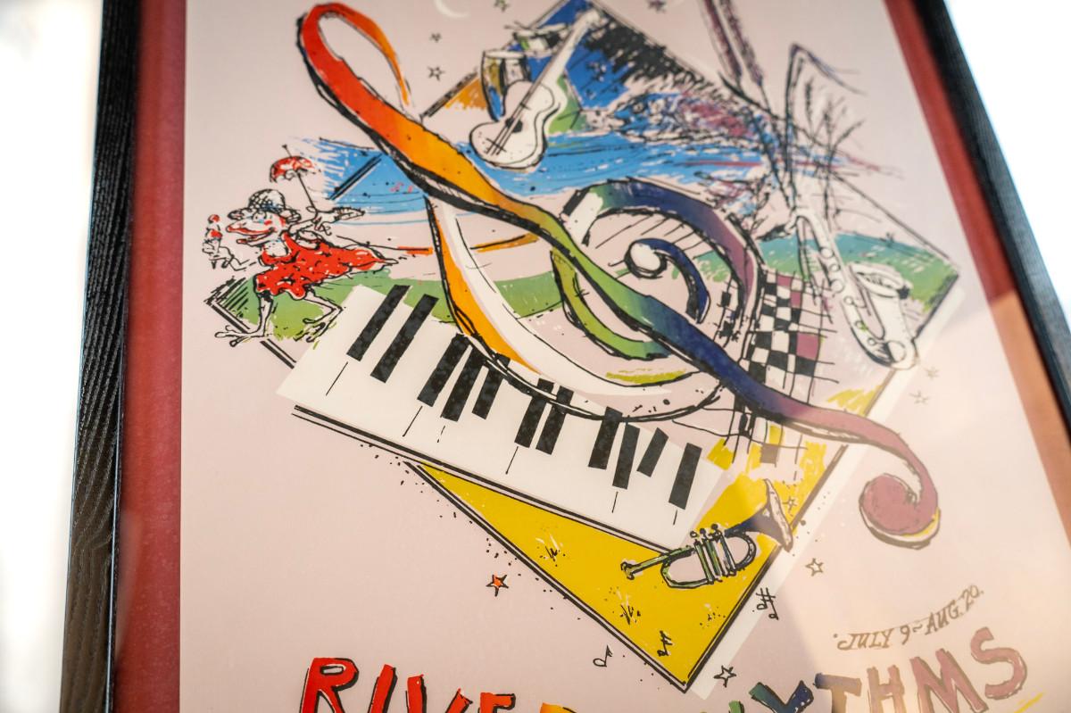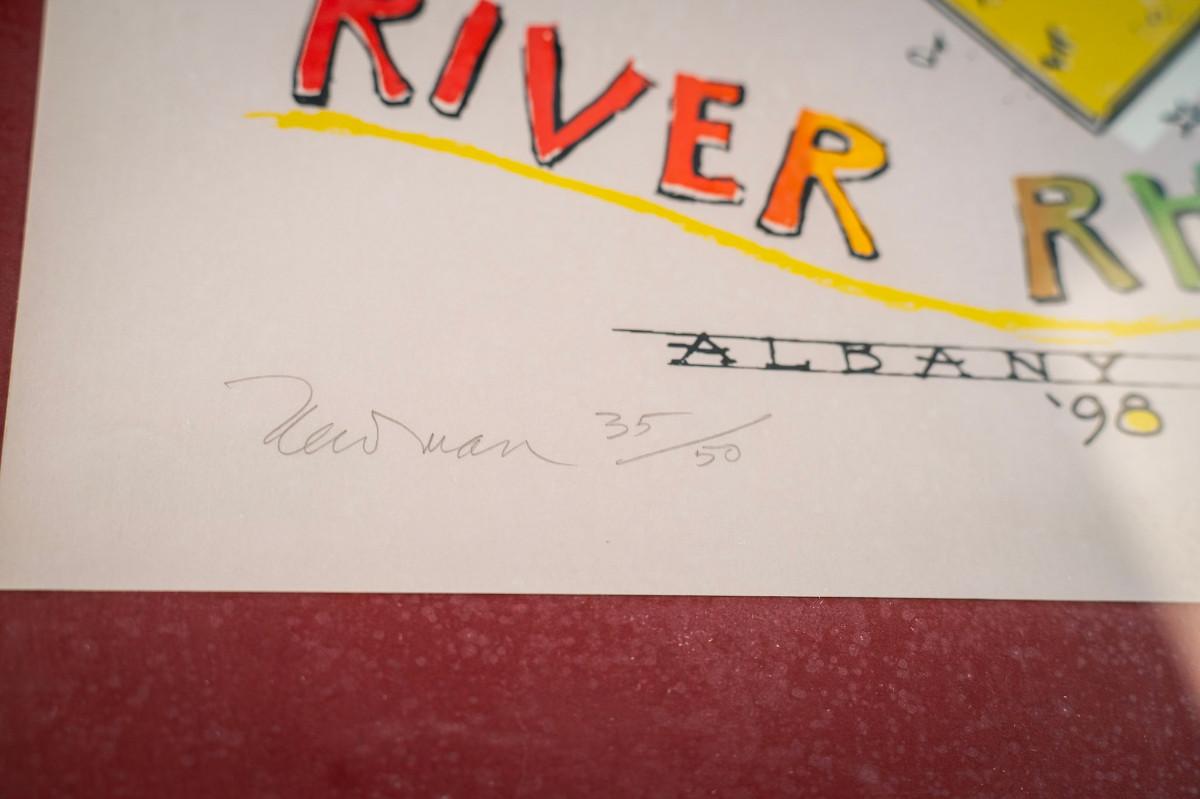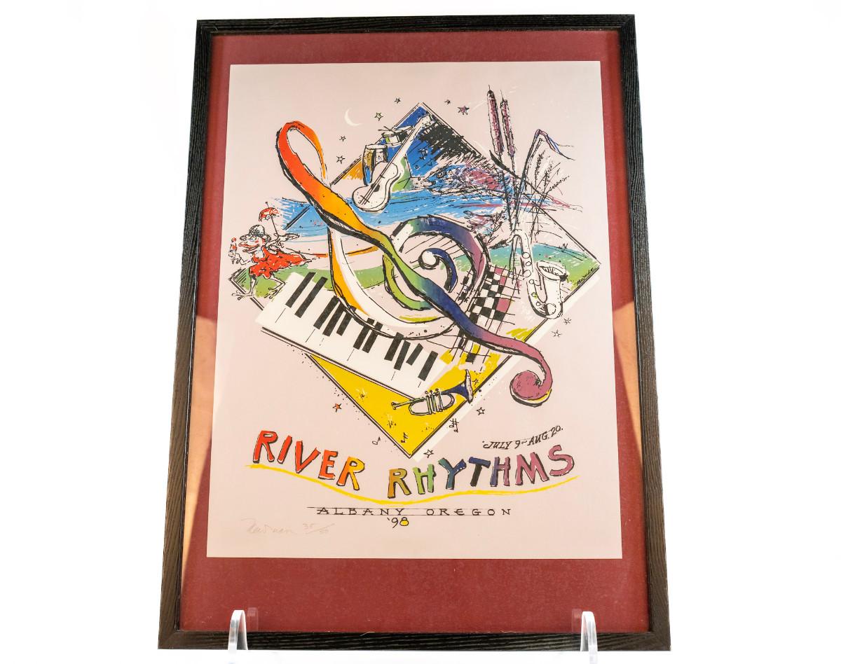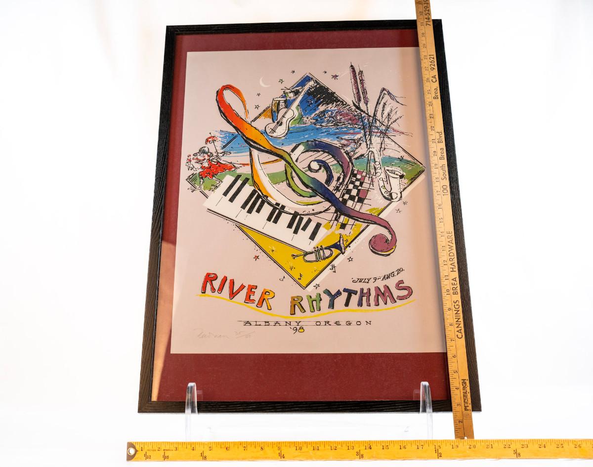 Vintage framed poster music festival in Albany, Oregon created. by Earl Newman. It features musical imagery.