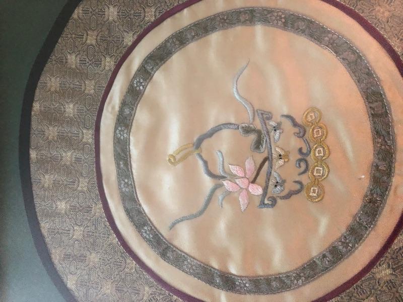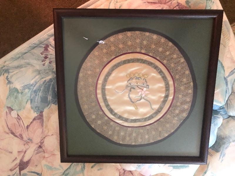 Framed and matted round cloth material with green matting in a wood frame