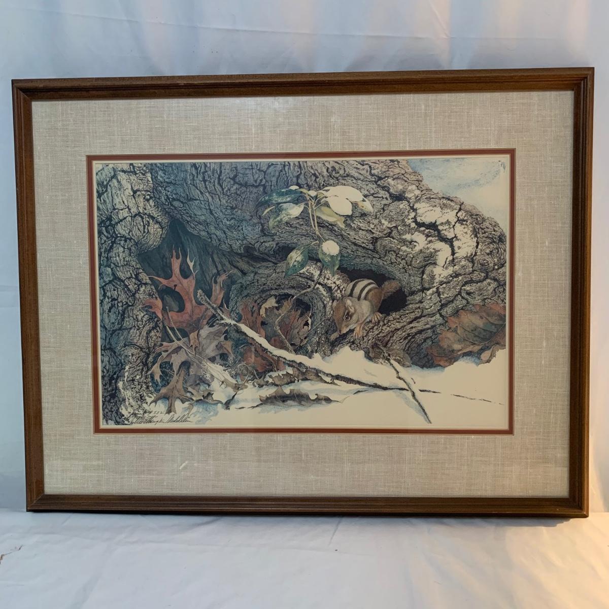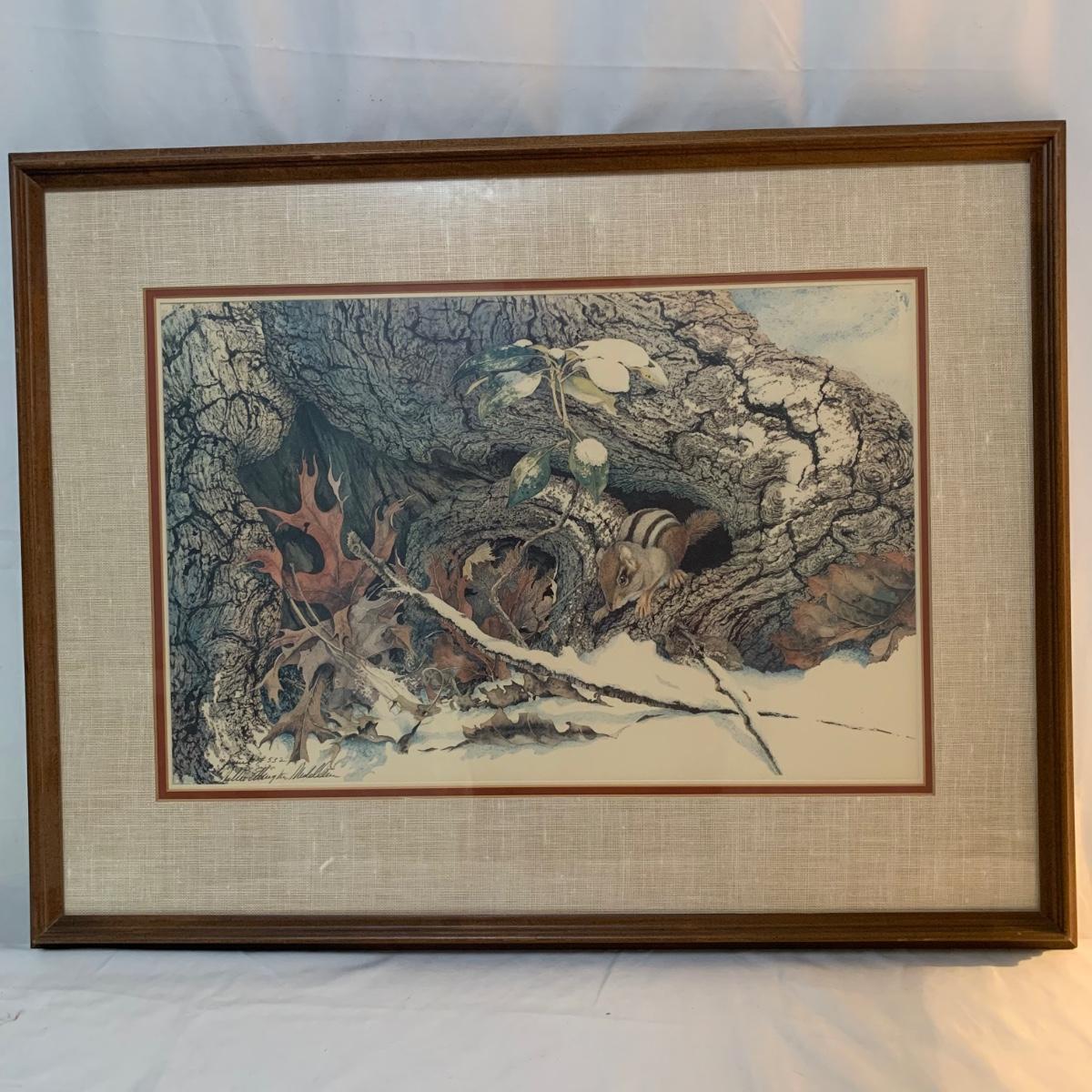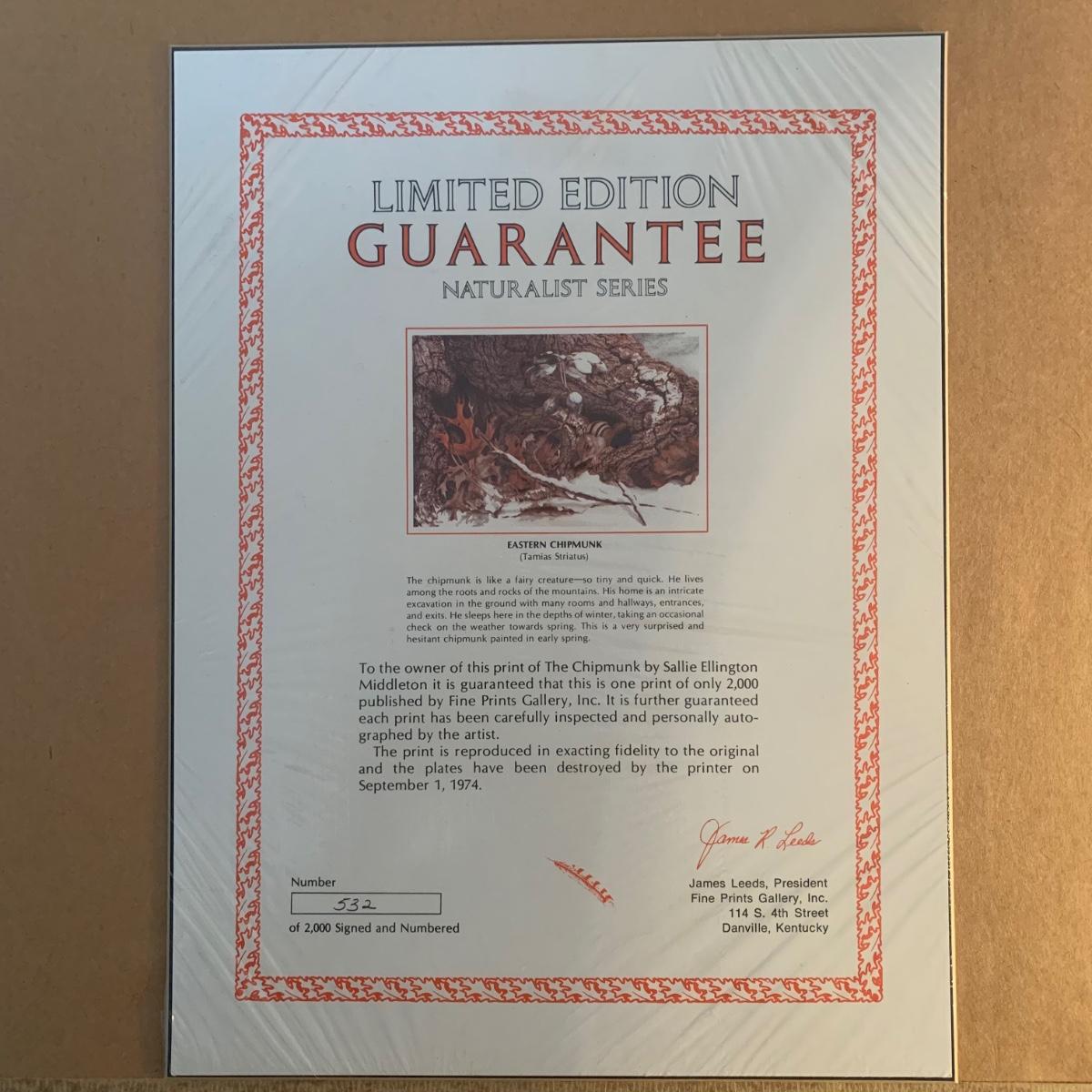 Framed Sallie Middleton Chipmunk print behind glass. This piece boasts a certificate of authenticity. It is one of two-thousand prints to be sold to the public. This frame is in good condition and the print is perfect for any naturalist trying to bring the natural world into their home. Frame measures, 29.5”L x 22.5”W.