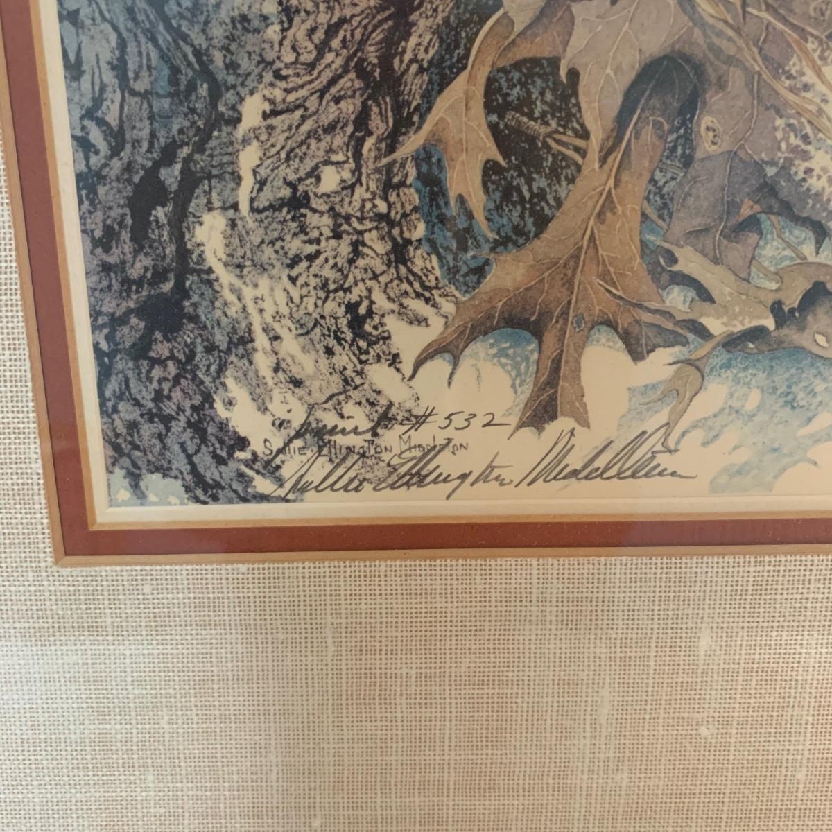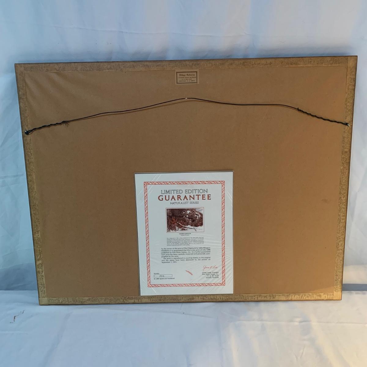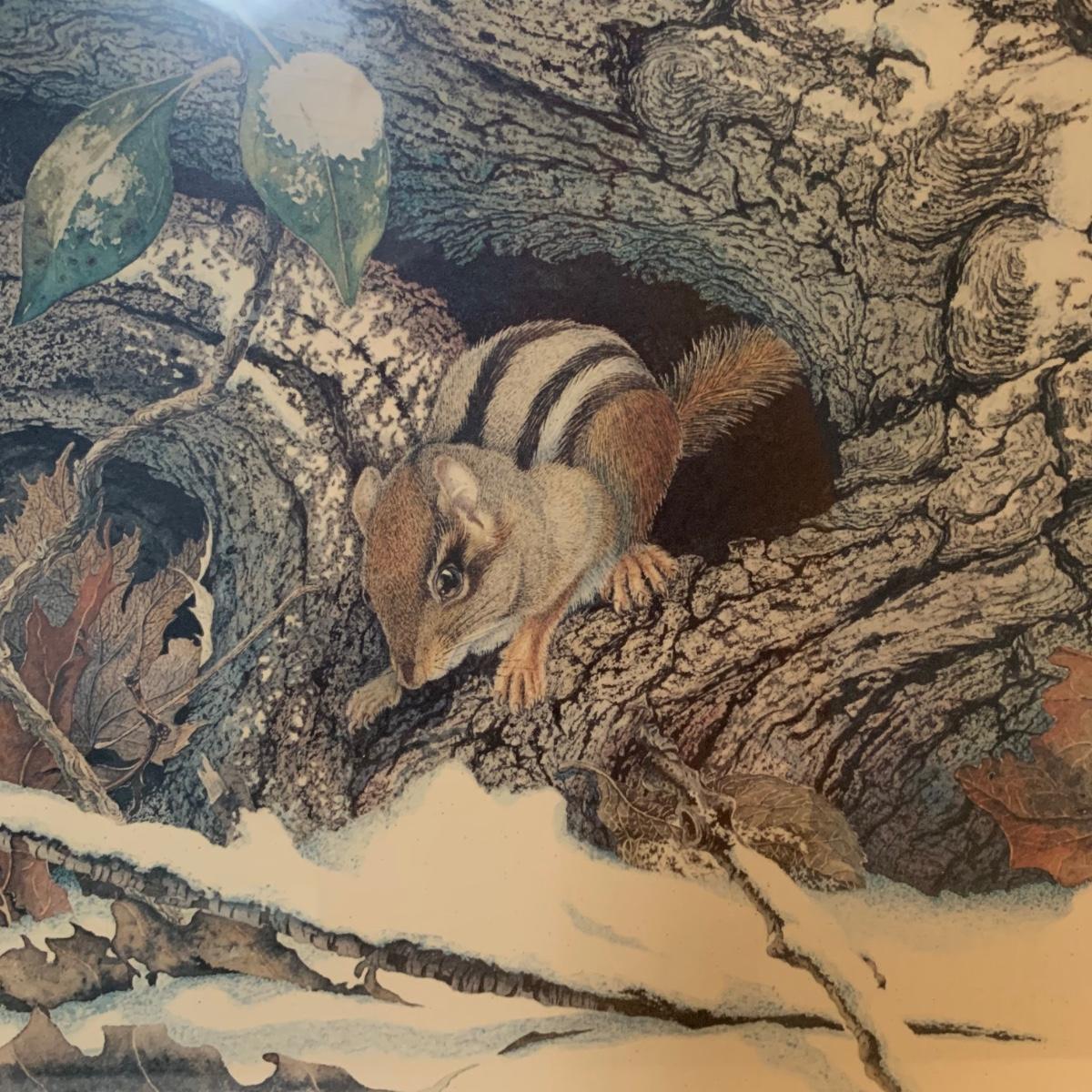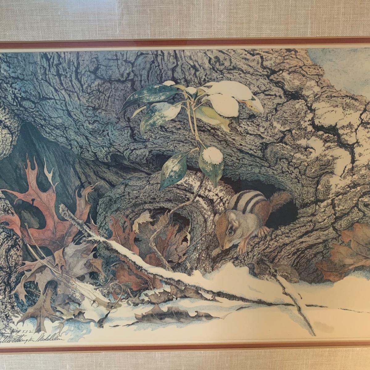 Framed Sallie Middleton Chipmunk print behind glass. This piece boasts a certificate of authenticity. It is one of two-thousand prints to be sold to the public. This frame is in good condition and the print is perfect for any naturalist trying to bring the natural world into their home. Frame measures, 29.5”L x 22.5”W.