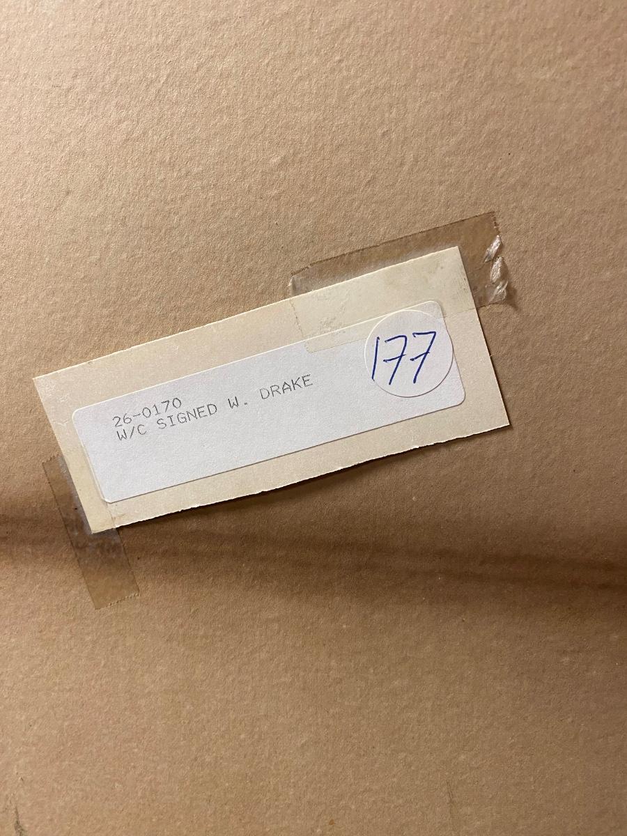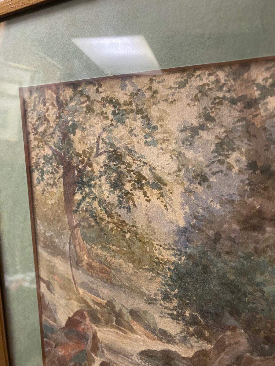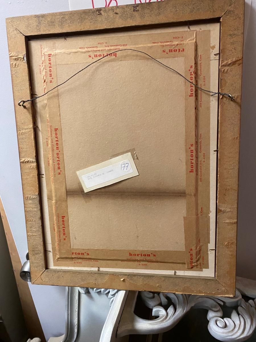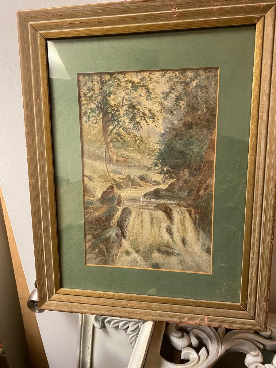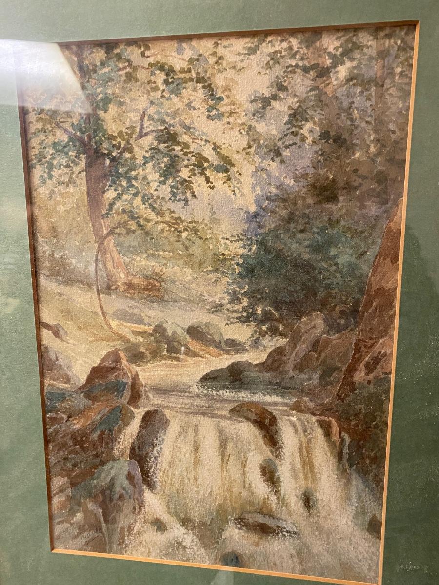 Framed and matted waterfall watercolor , labeled by W.. Drake. Approx 14x16
