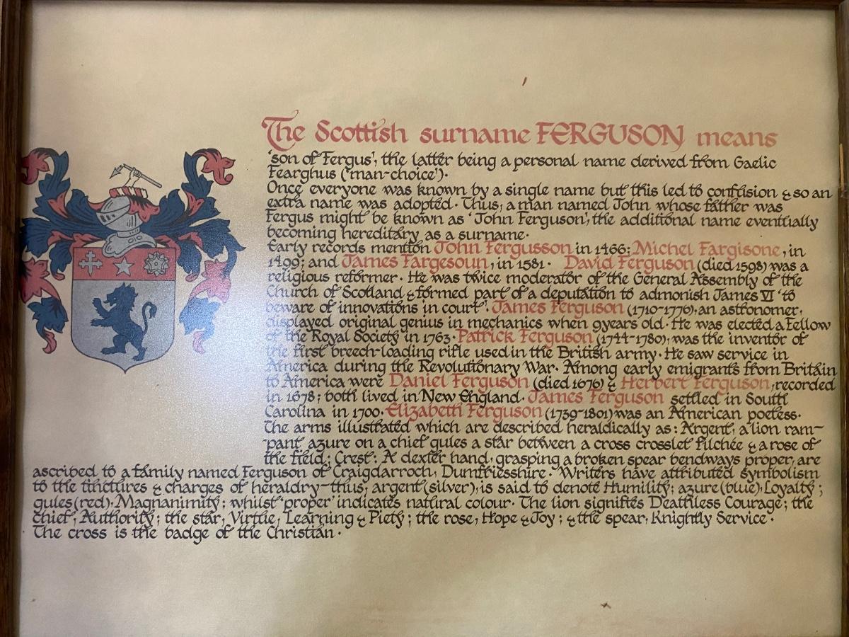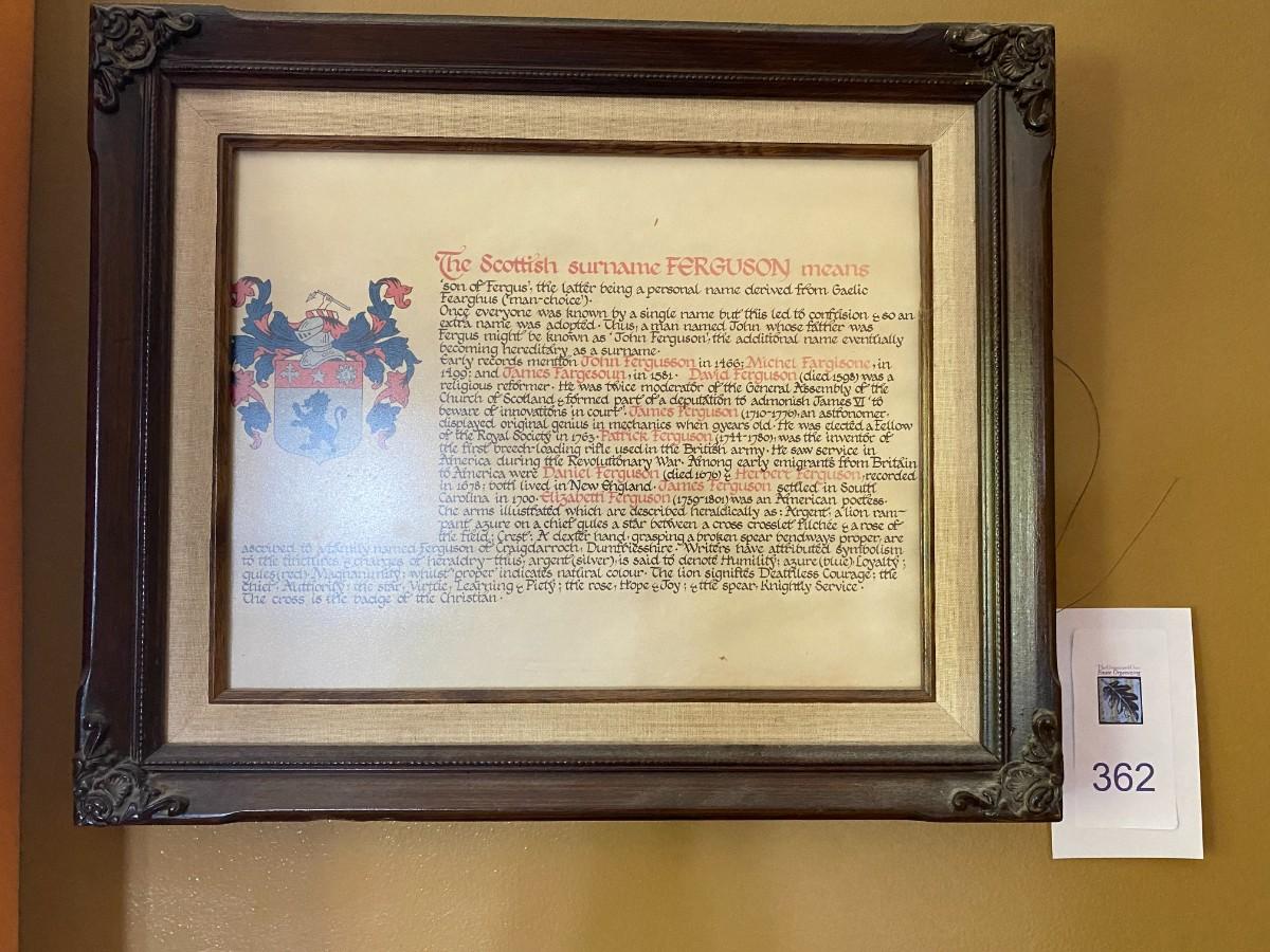 Surname Ferguson. Beautiful carved wood frame. 18" x 14"