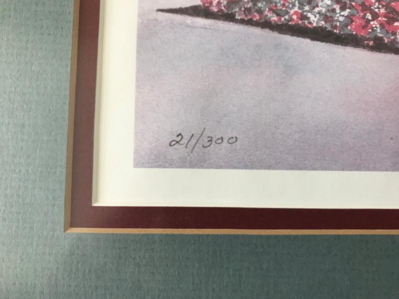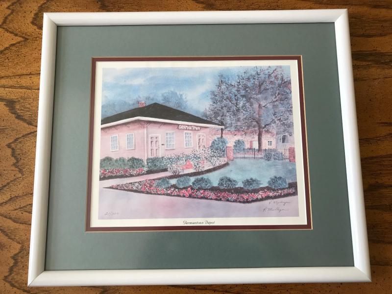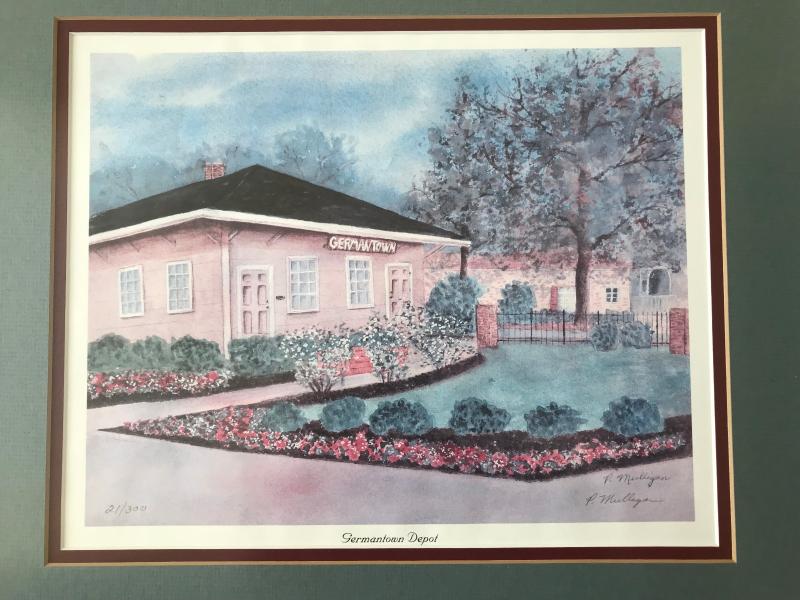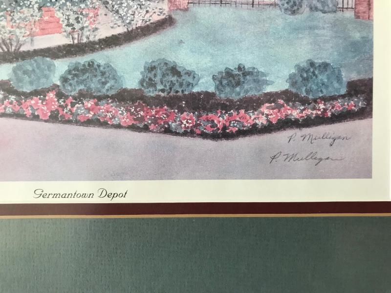 Very nice framed and matted print "Germantown Depot" by P. Mulligan, #21/300. Lovely scene of the Germantown, Tennessee railroad depot with flowers blooming in the yard. Green and burgundy mat. White Frame. 17 1/2" x 15" H