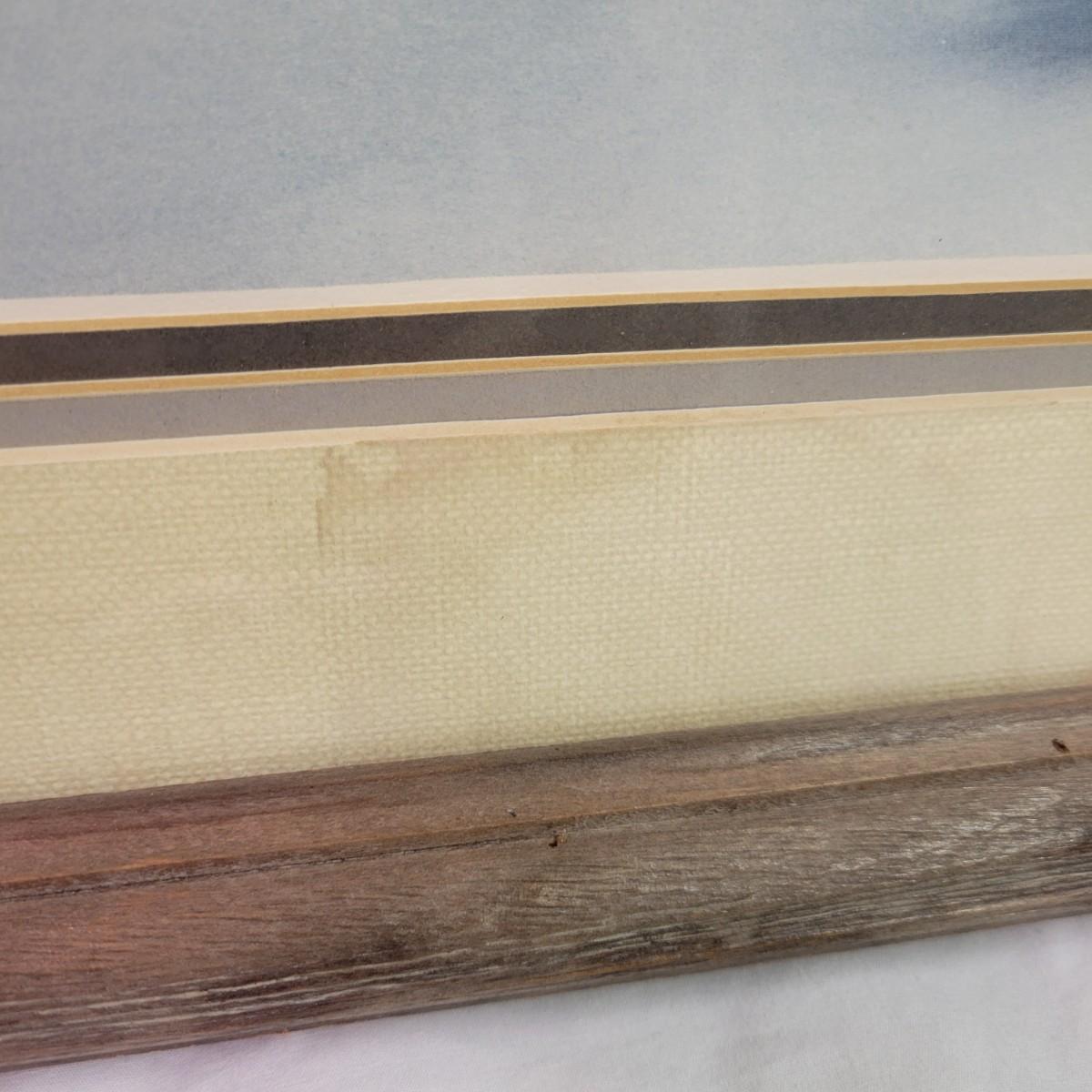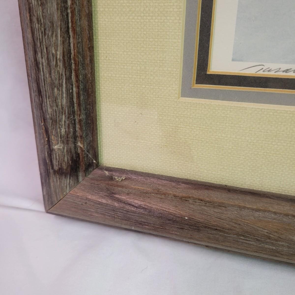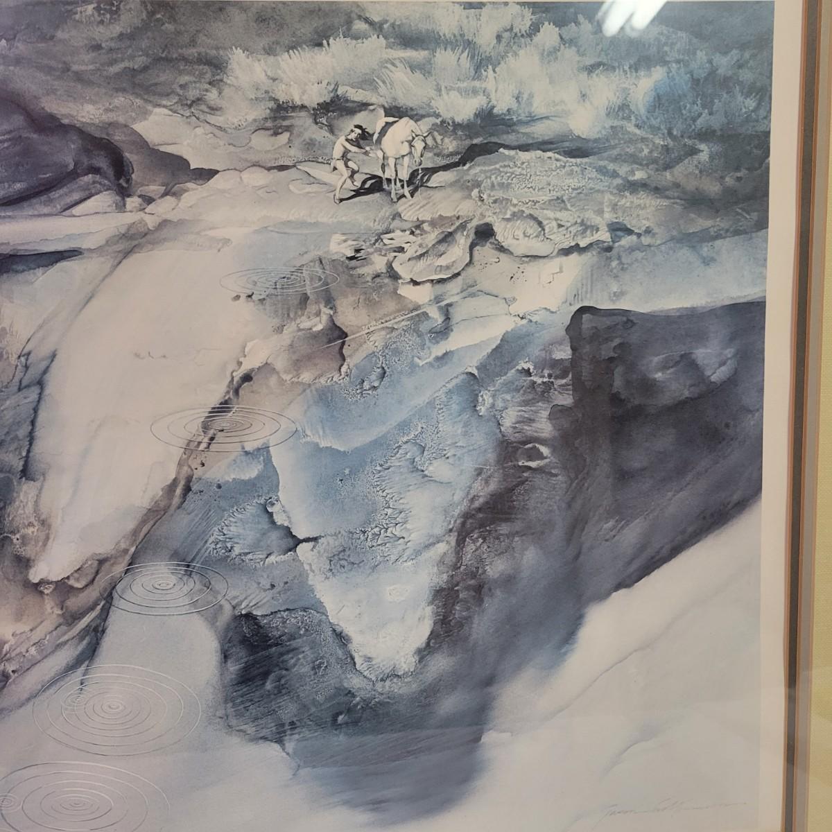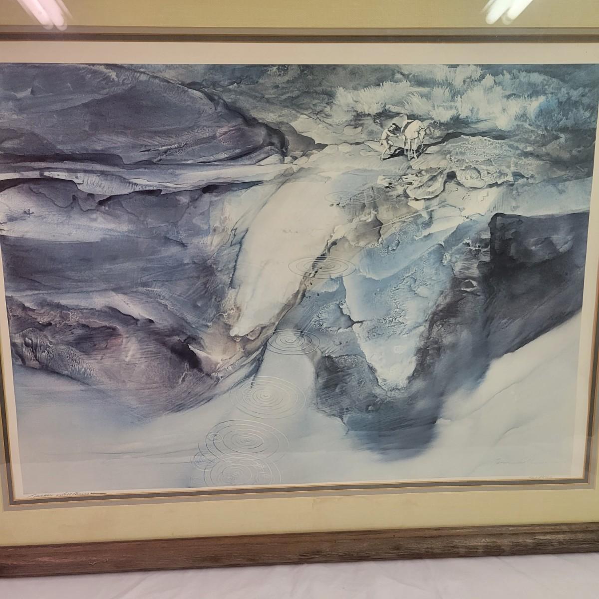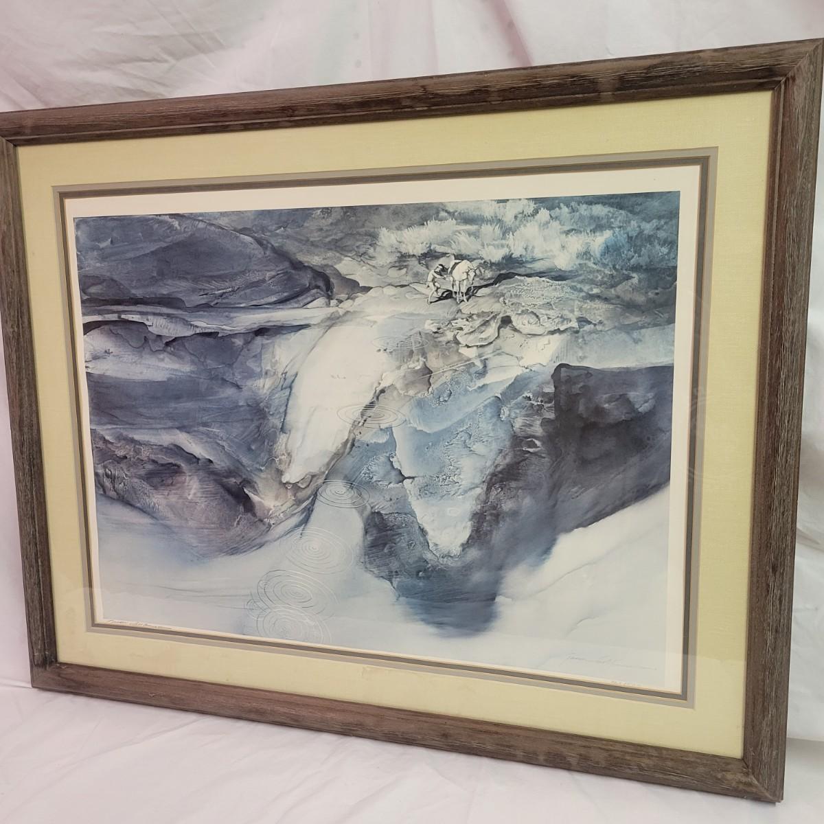A pencil signed and numbered print by Jason Williamson that features what appears to be of a native American and horse skipping a rock across a body of water. It is in a weathered wooden frame with a triple matting and measures approximately 34" x 1" x 27"H. There are indications of some water damage to the piece. Shipping available. Shipping can be costly. We suggest contacting our preferred local shipping provider, Postage Express, with dimensions and getting an estimate before bidding: (828) 670-5501 or postageexpress@yahoo.com.
