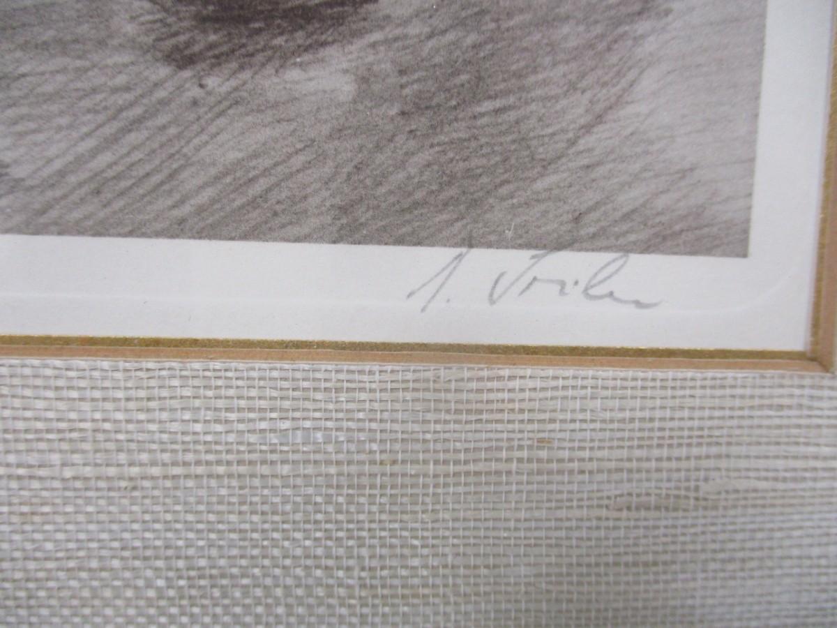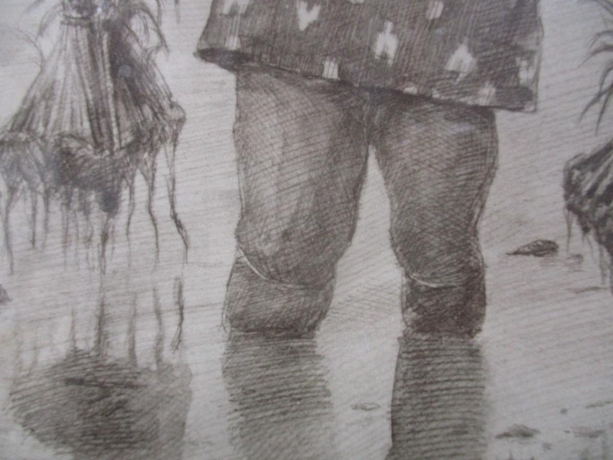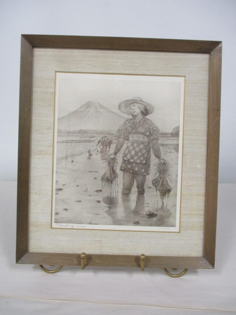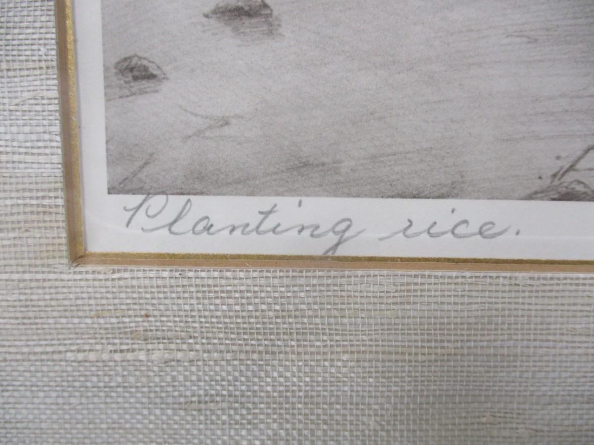 Framed & Signed Asian Drawing "Planting Rice" Artwork 15 1/8" x 17 1/4"