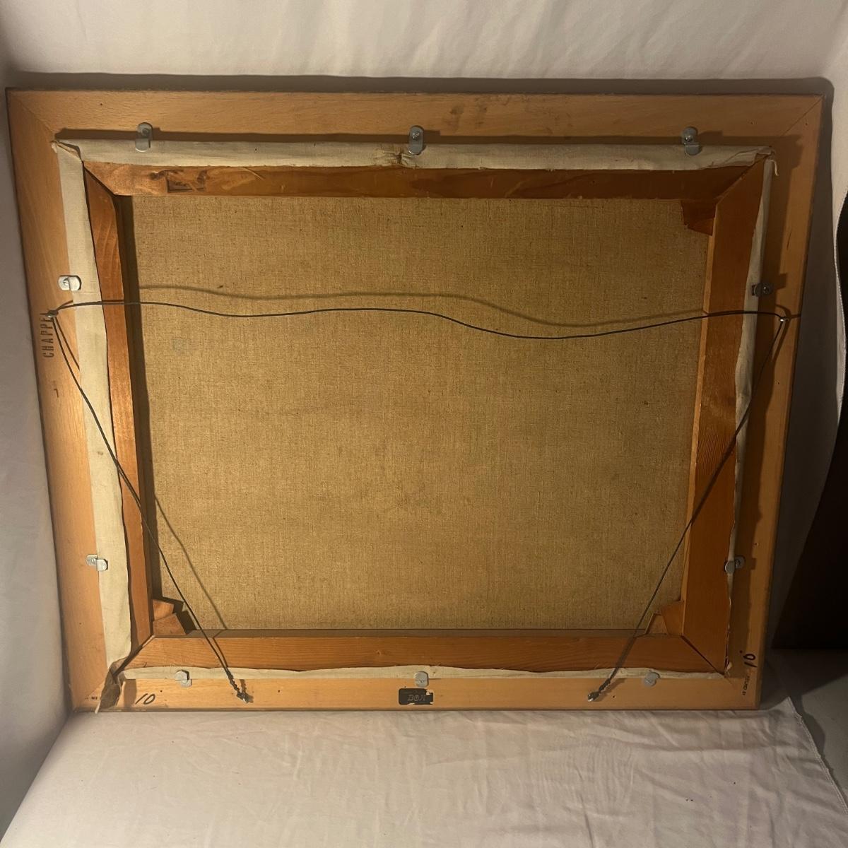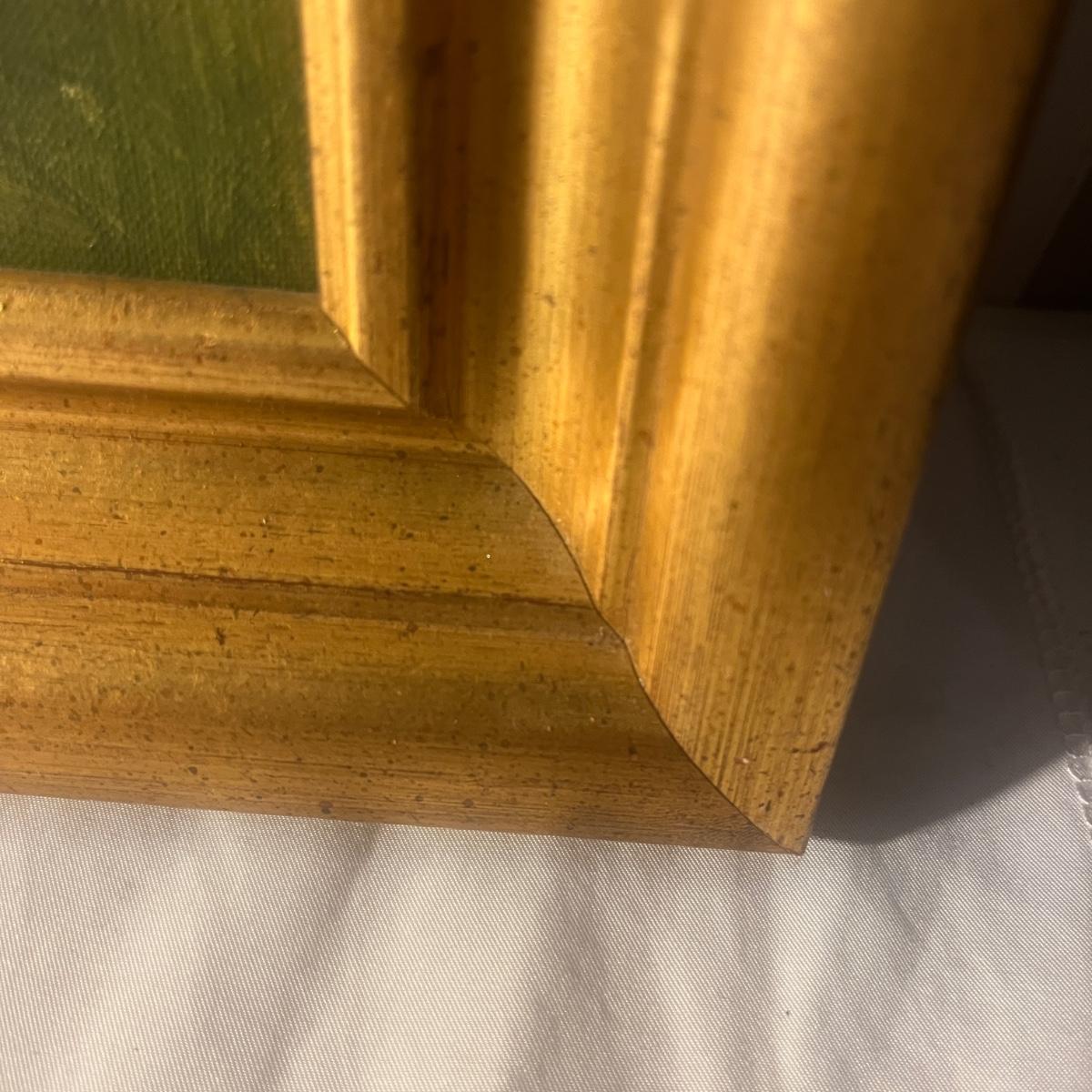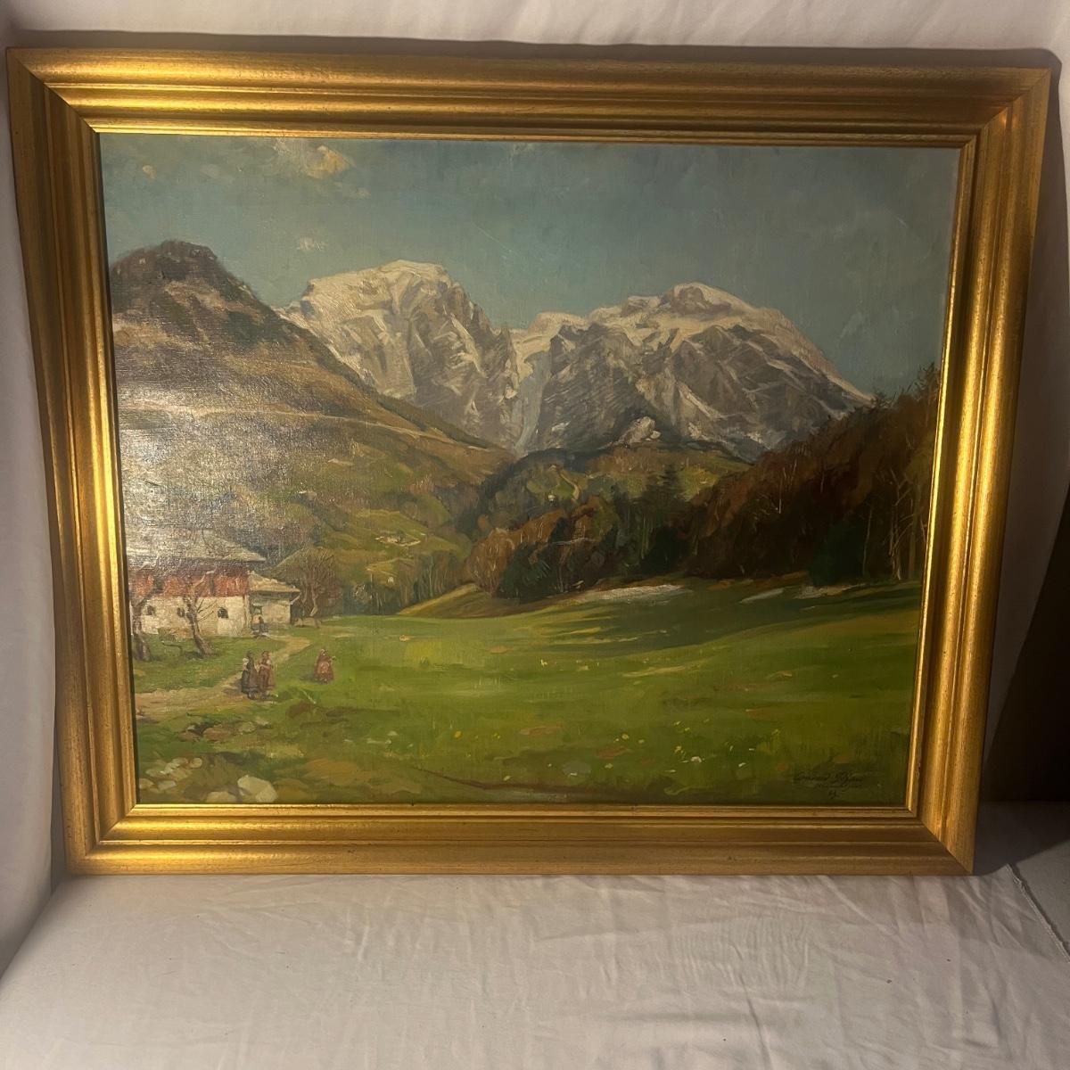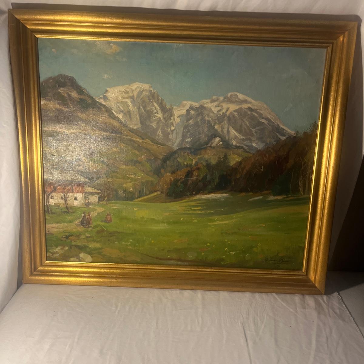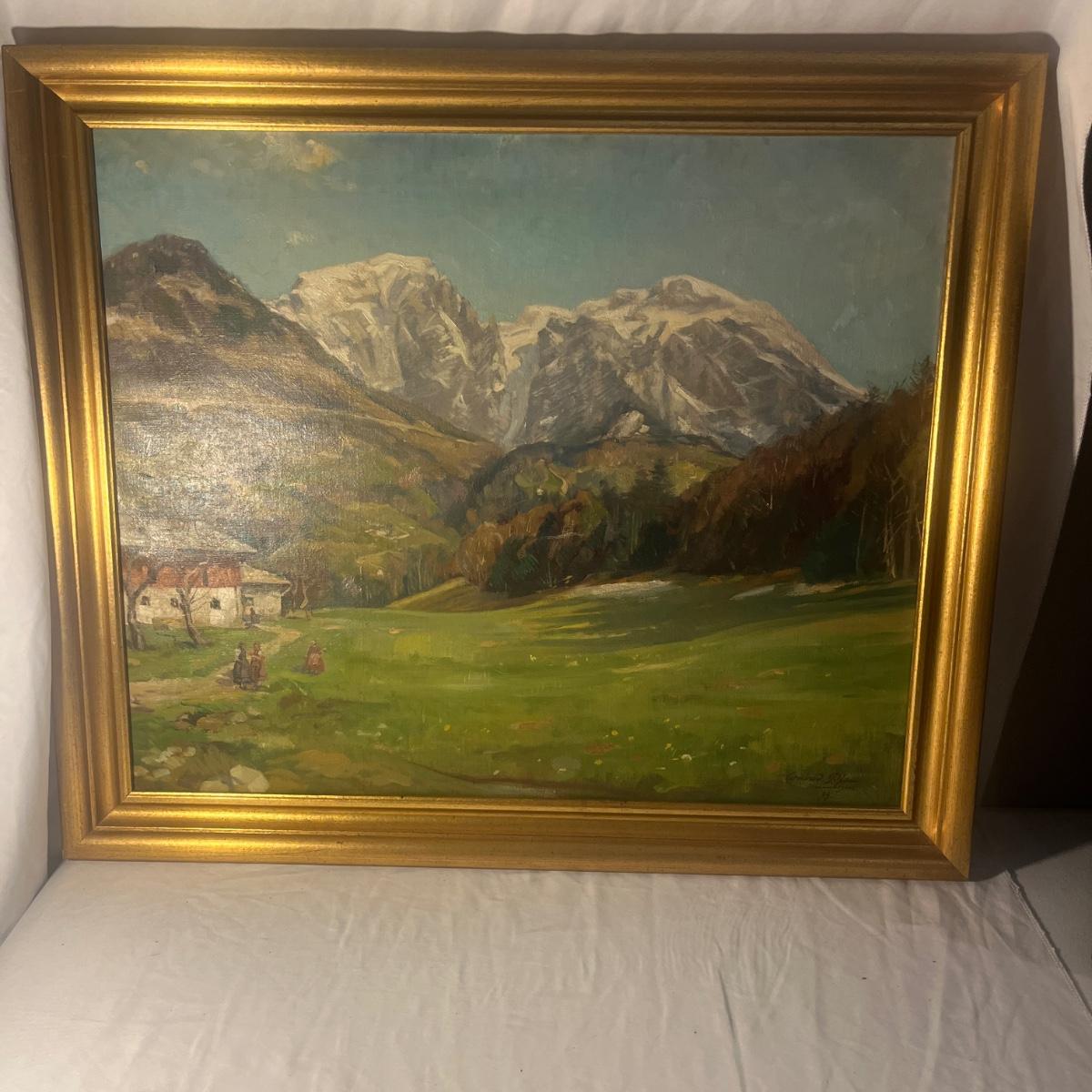 Lot includes a wooden framed & signed Mountain View oil on canvas painting that measures 29” x 25”H. Signature possibly reads Conrad PFau.