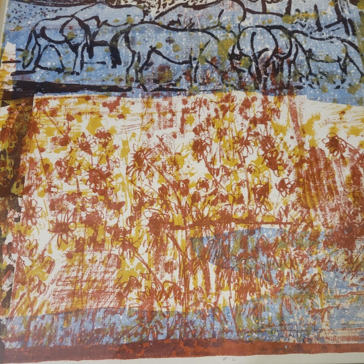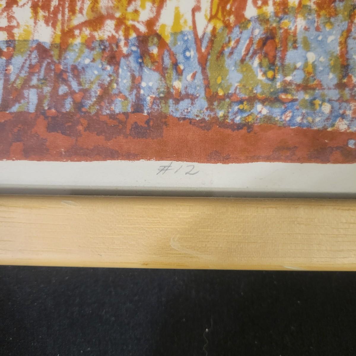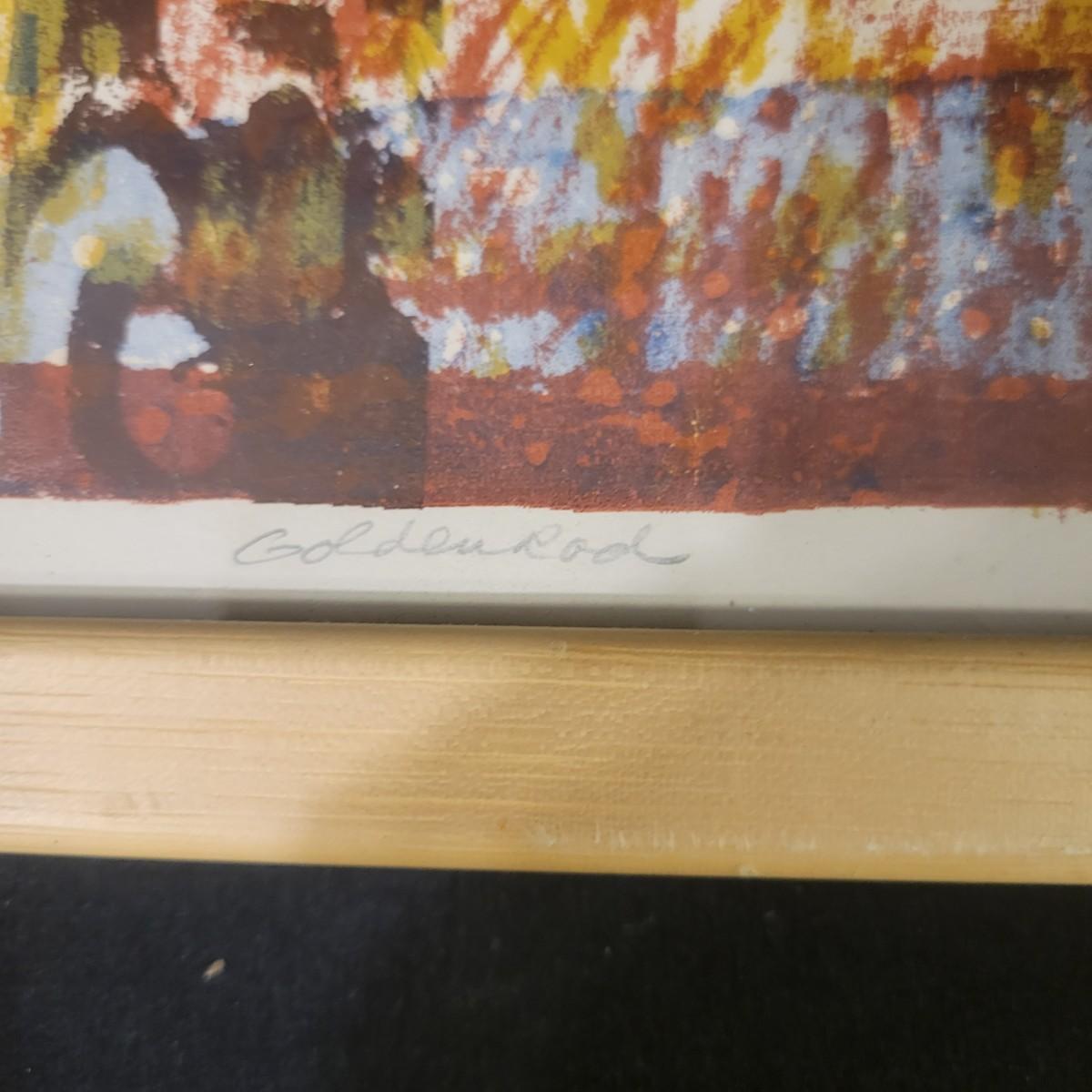A framed serigraph by Velma Steiner that is pencil signed and marked "#12". The name of the piece is "Goldenrod" and is in a wooden frame with some minor blemishes. Measures approximately 20" x 1" x 18"H. Shipping available. Shipping art can be costly. We suggest contacting our preferred local shipping provider, Postage Express, with dimensions and getting an estimate before bidding: (828) 670-5501 or postageexpress@yahoo.com.