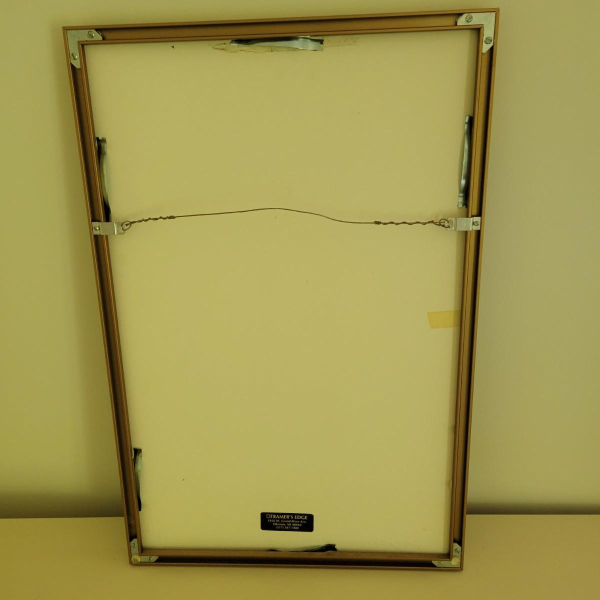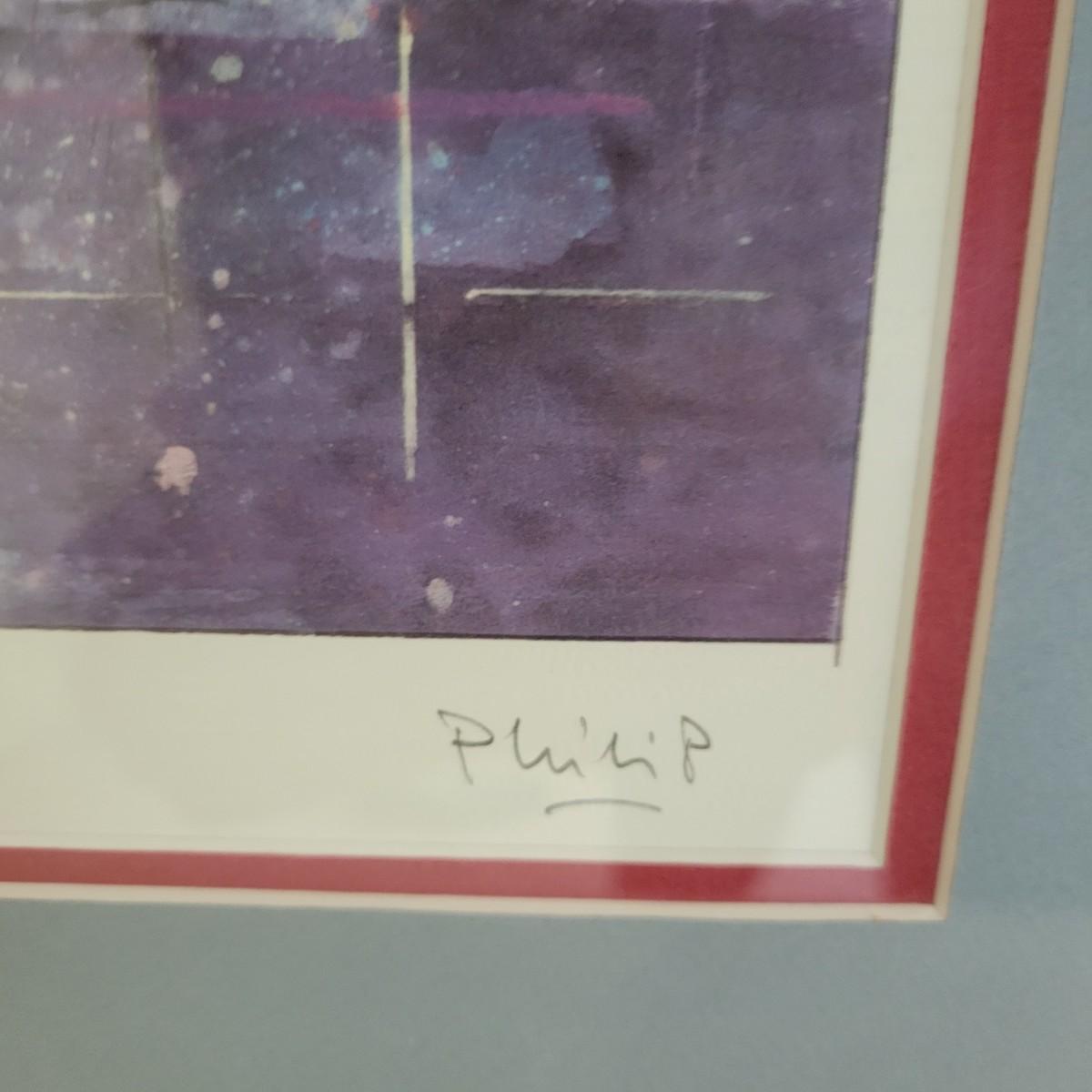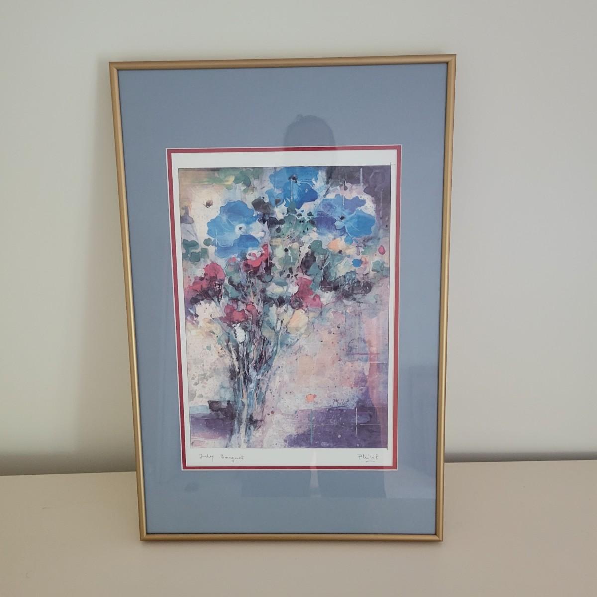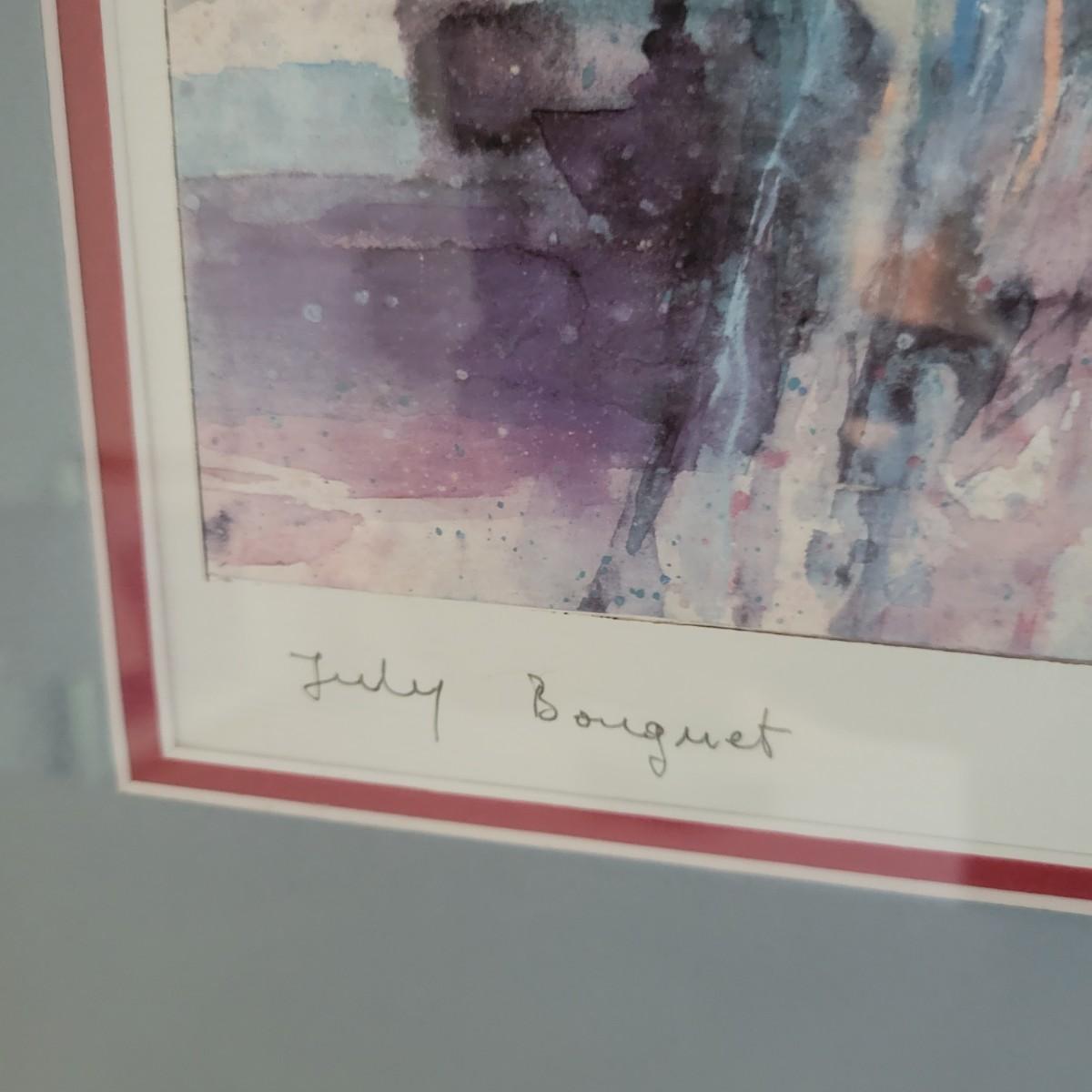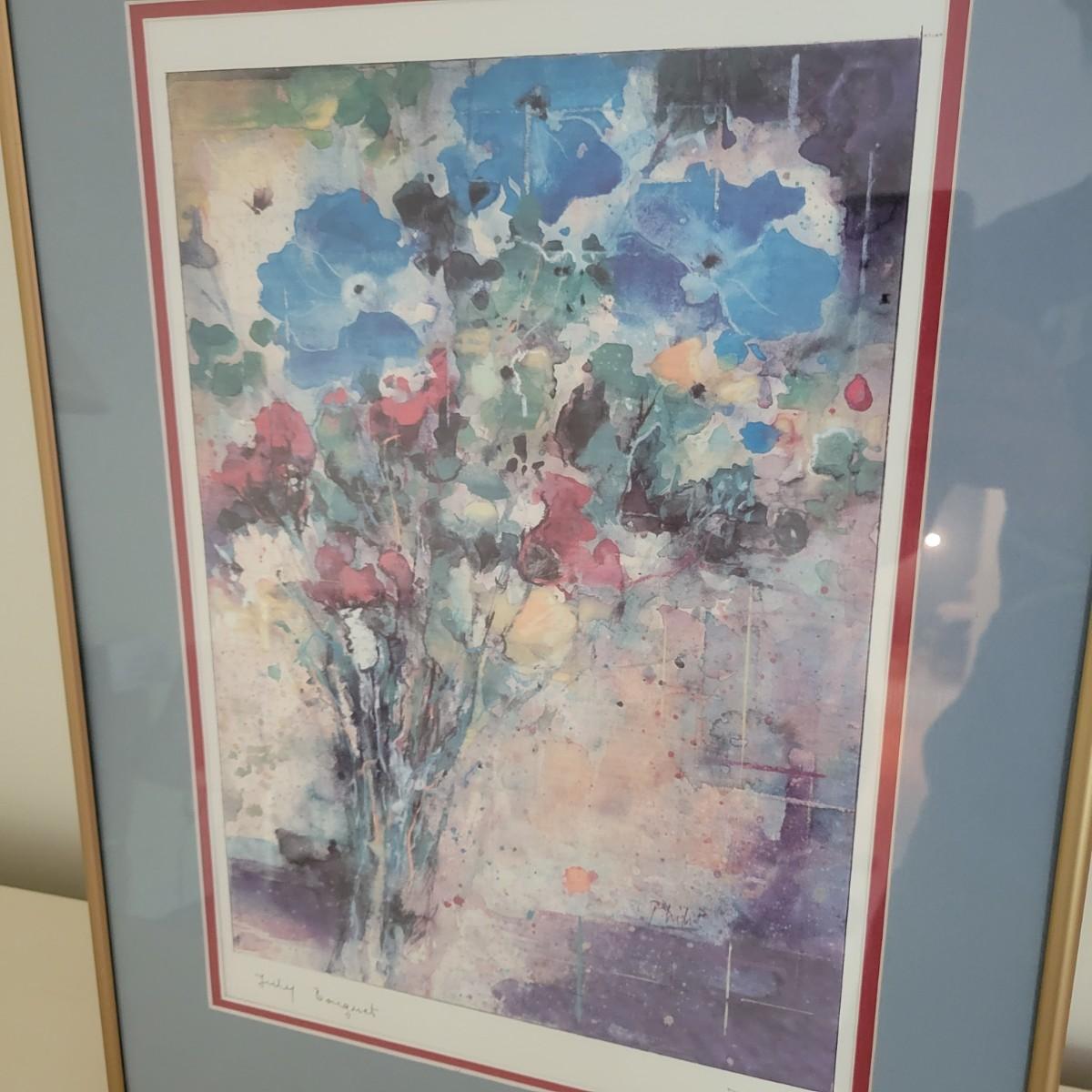 A framed print that is pencil signed and titled by "Philip". This still life is titled "July Bouquet" and is double matted with a gold colored metal frame. It measures approximately 15.5" x 1" x 24". Shipping available. Shipping art can be costly. We suggest contacting our preferred local shipping provider, Postage Express, with dimensions and getting an estimate before bidding: (828) 670-5501 or postageexpress@yahoo.com.