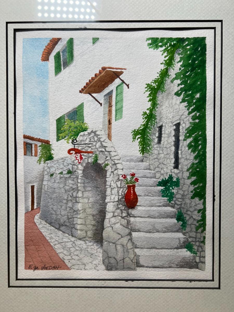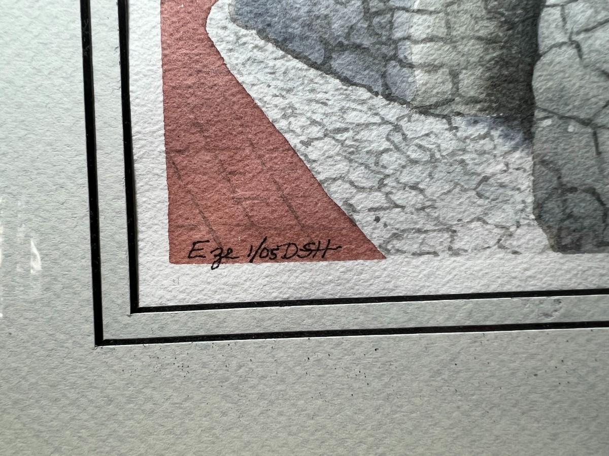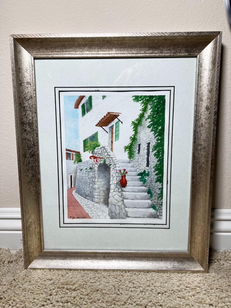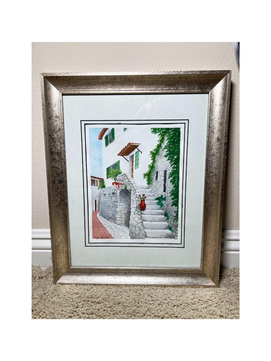Framed & Signed Watercolor Painting Foreign Spain Cobblestone Building Scenery