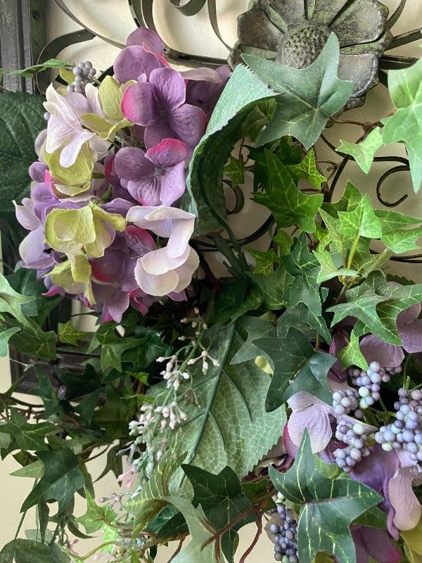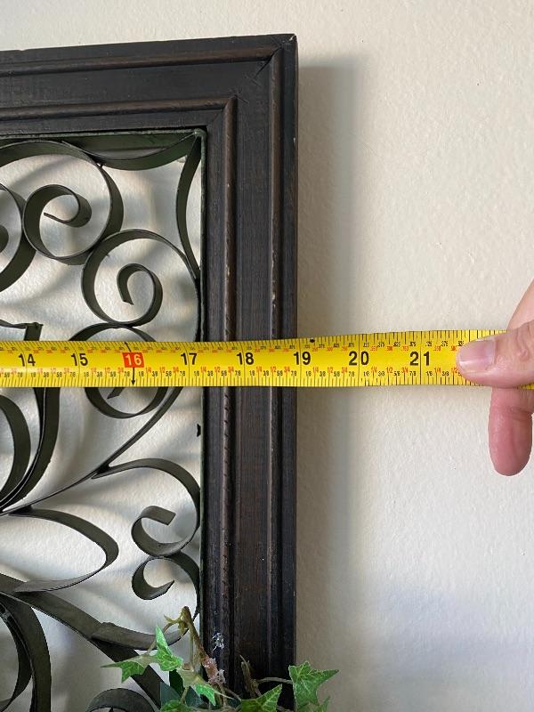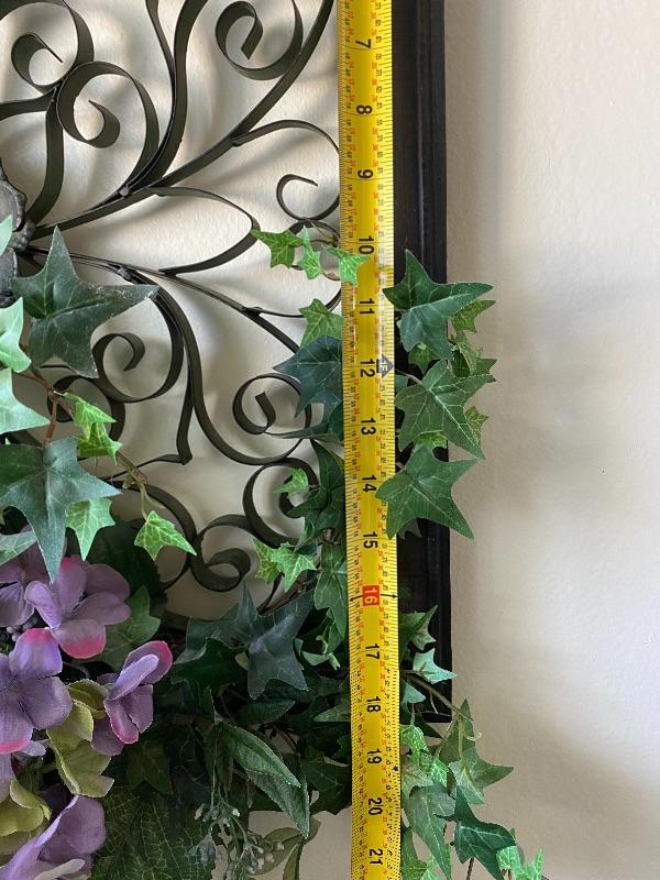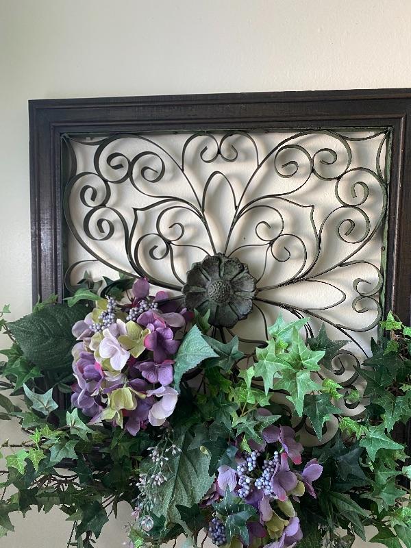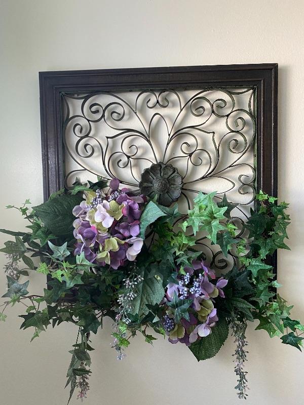 Framed metal art. Square metal flower with faux greenery and flowers attached. About 19" size.