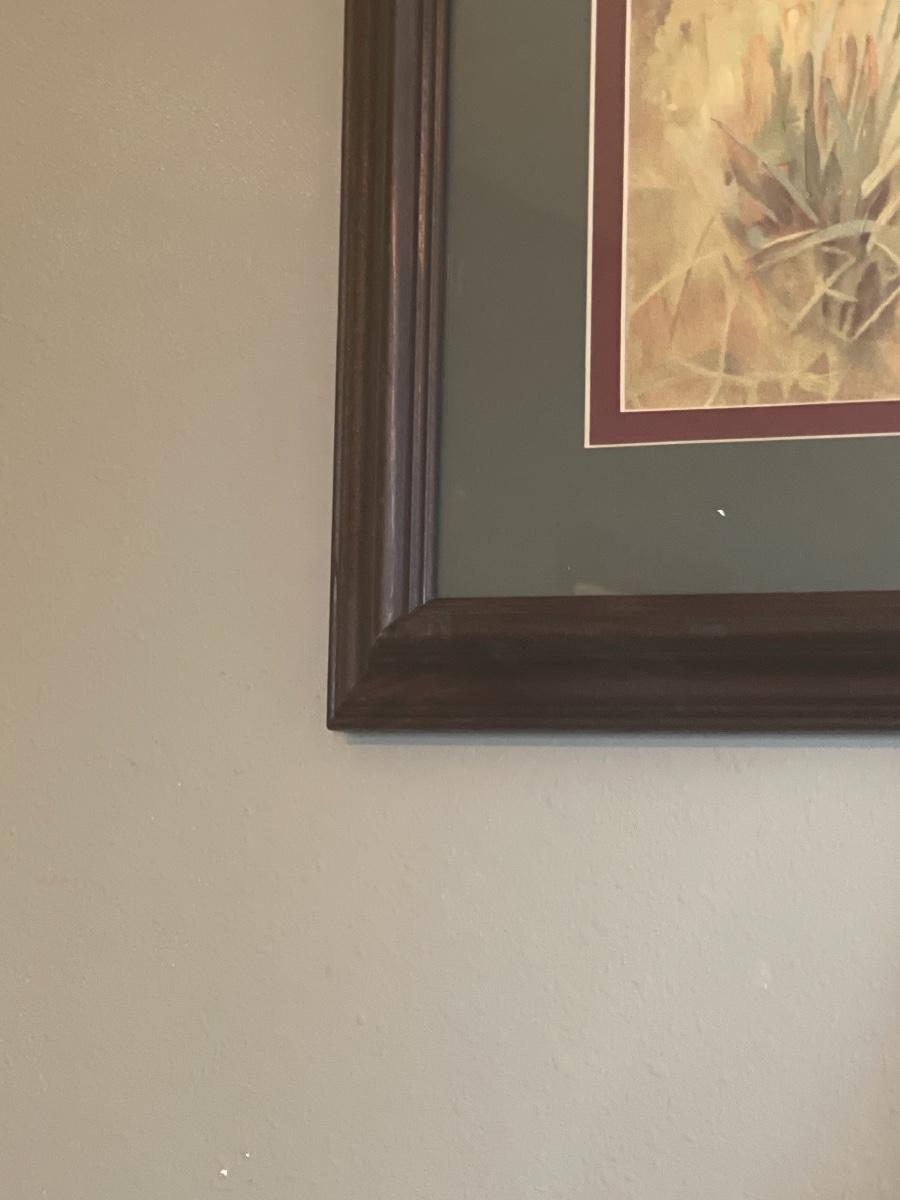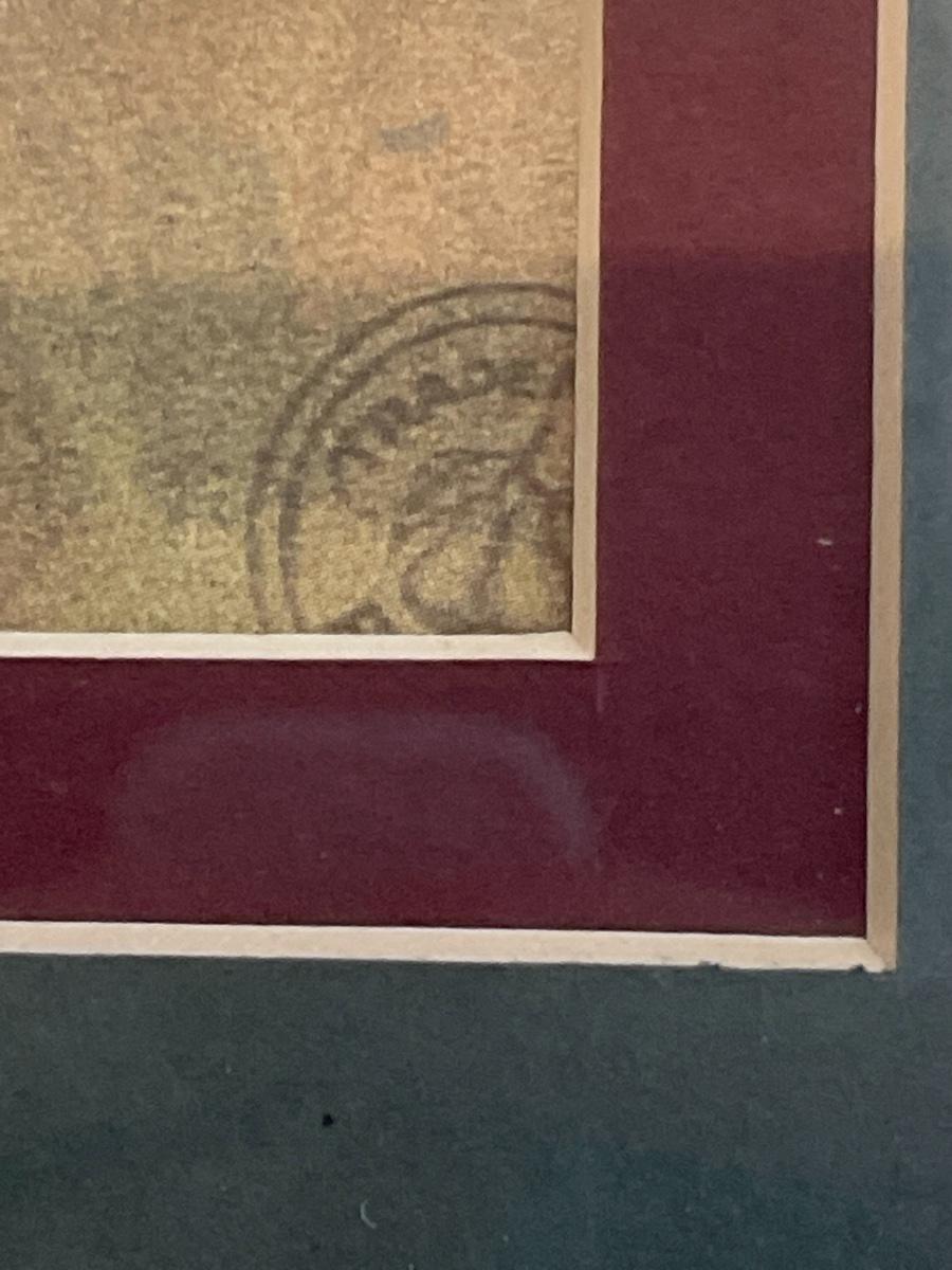 Dark wood frames and matted in green and burgundy. 30-1/2”H x 24”W