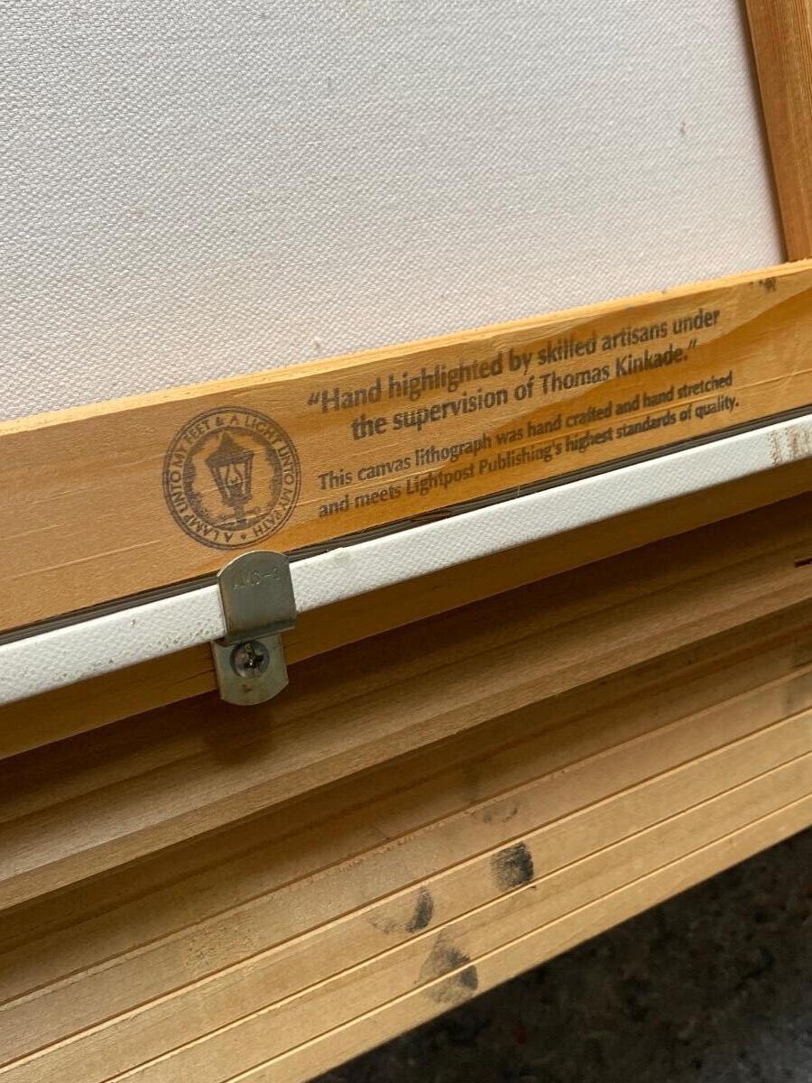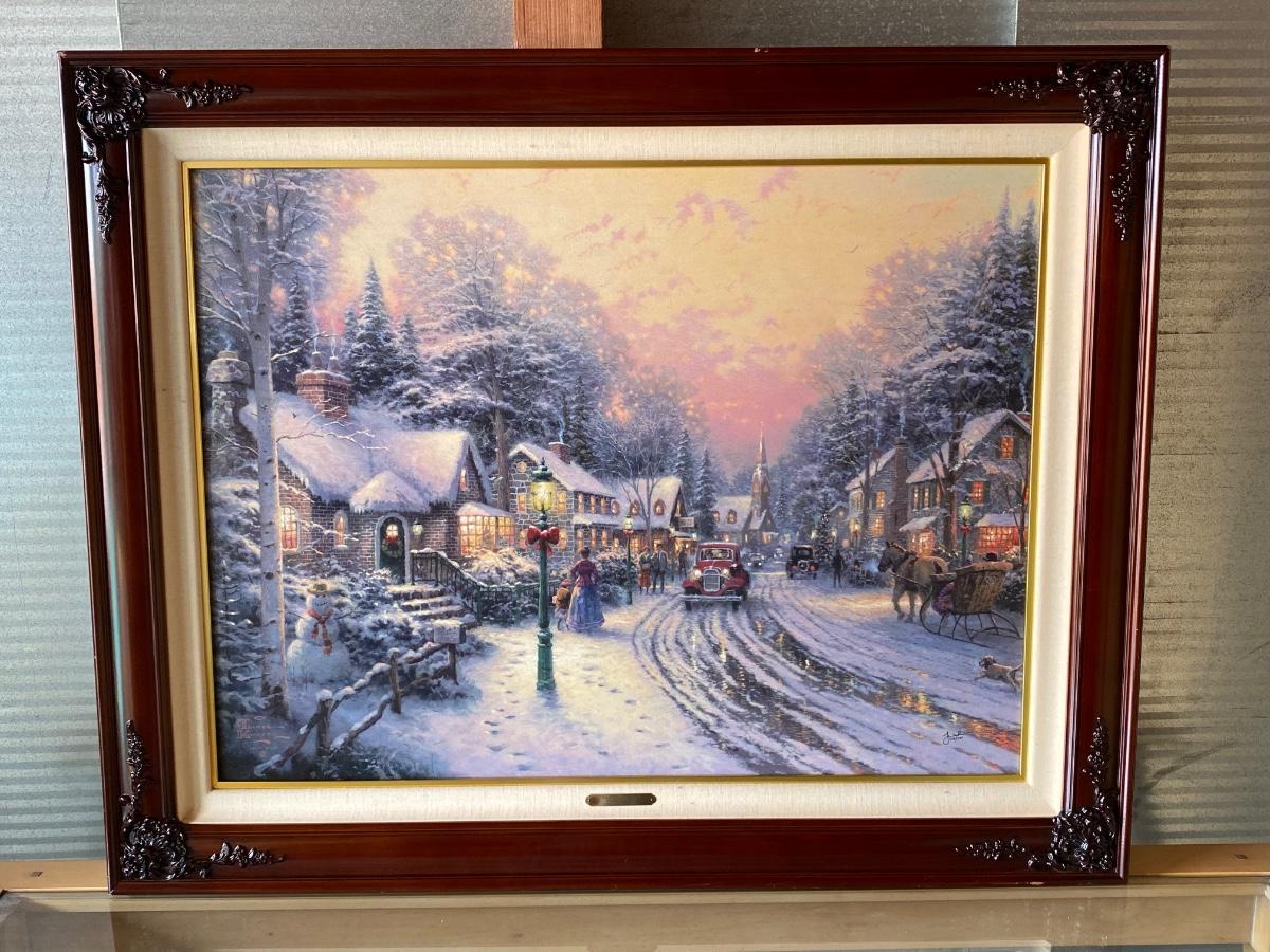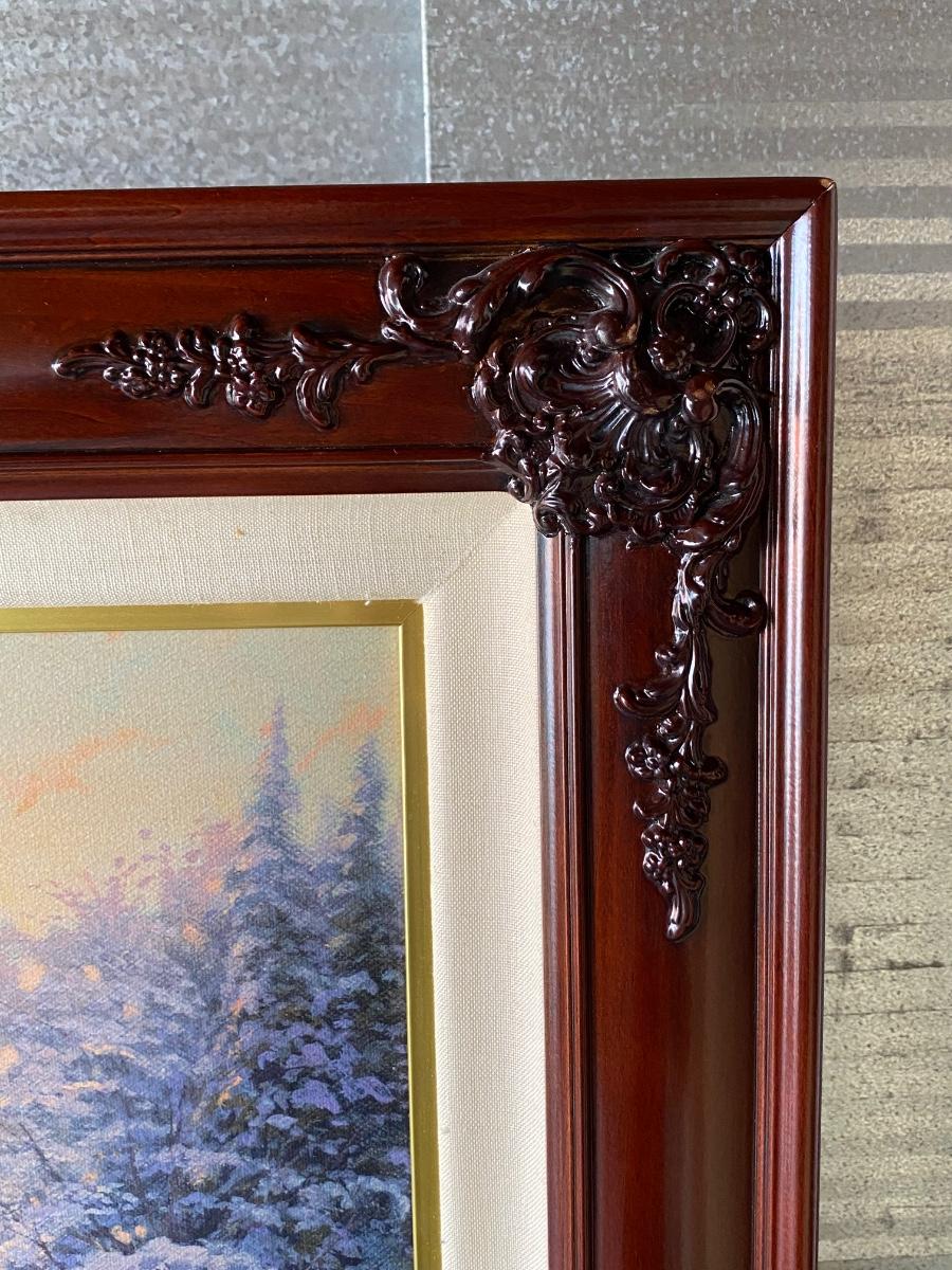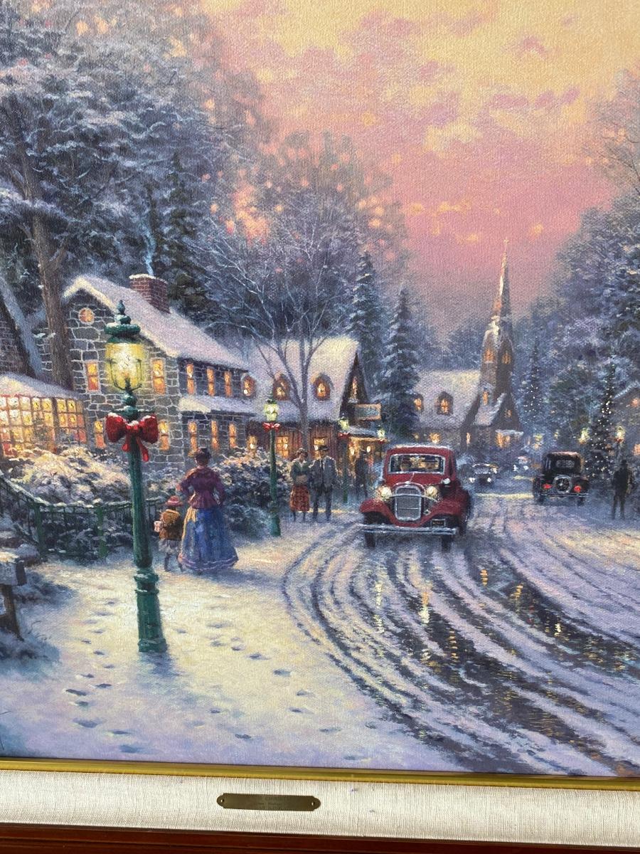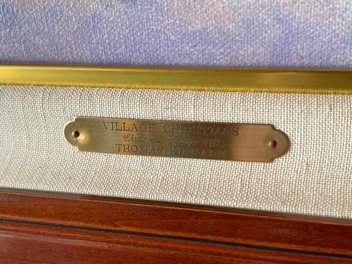 Framed Thomas Kinkade Lithograph Village Christmas Cottage VIII. In good condition. Certified and stamped on back of canvas. About 42"x34" size.