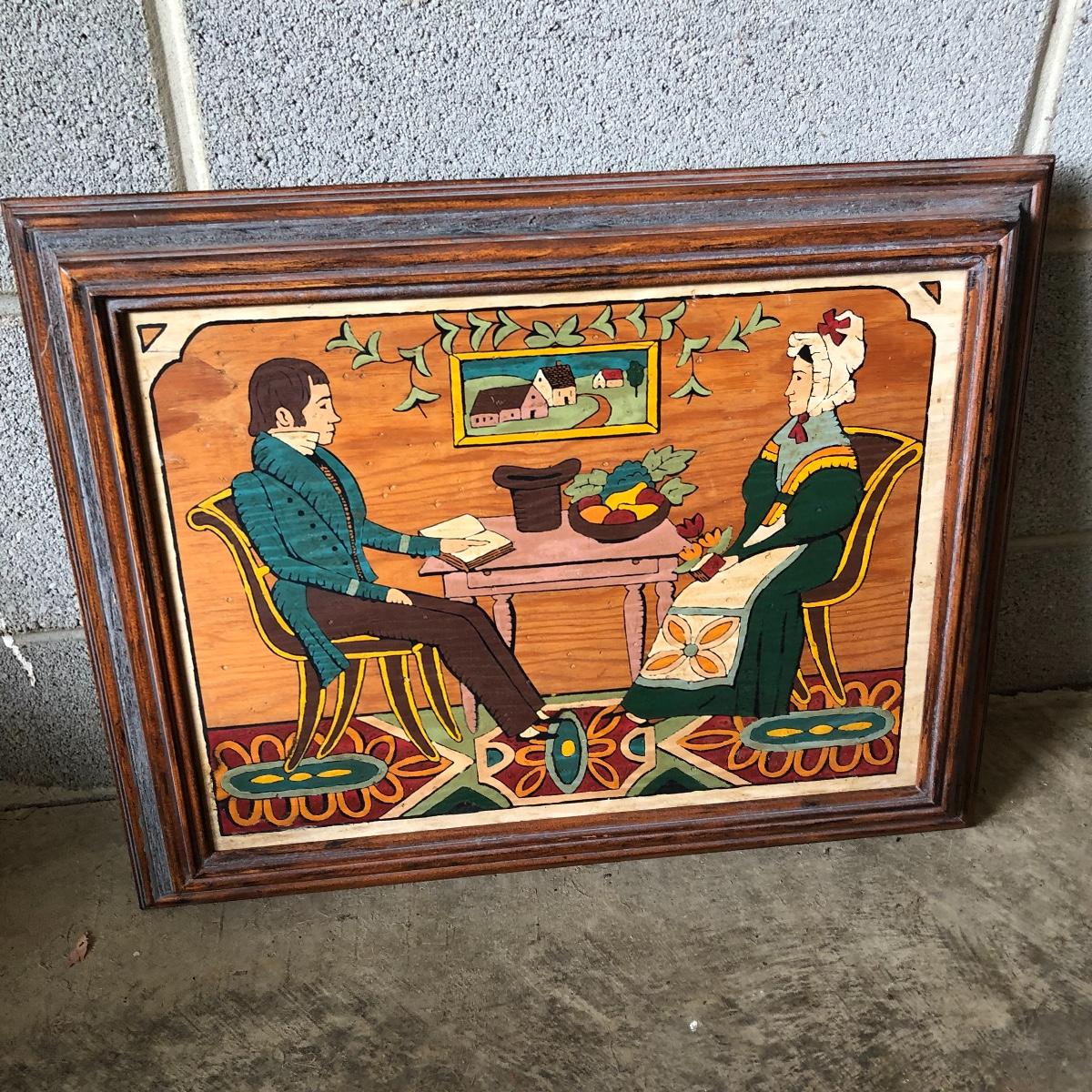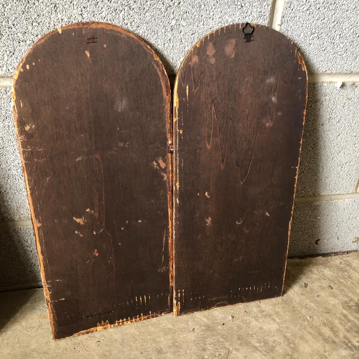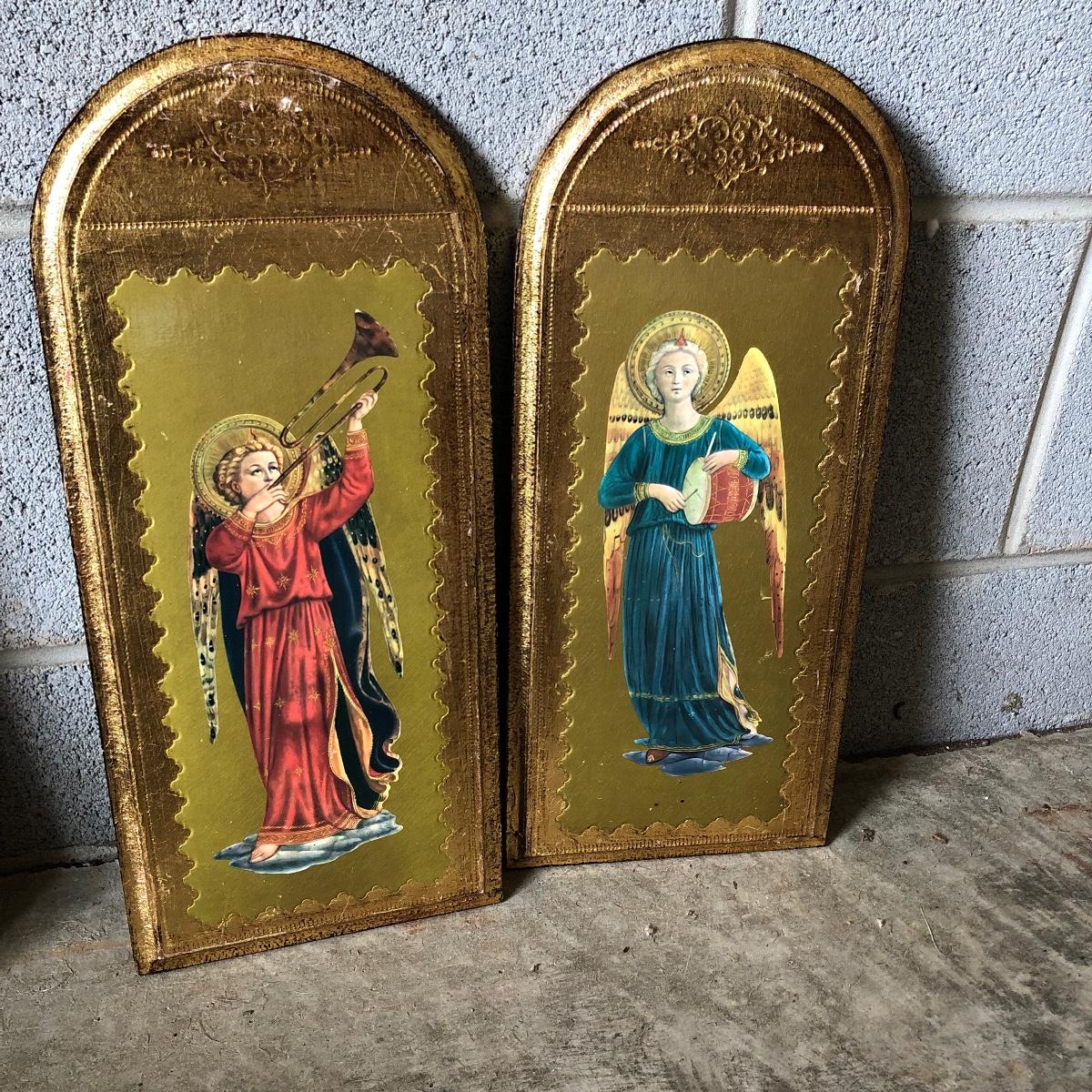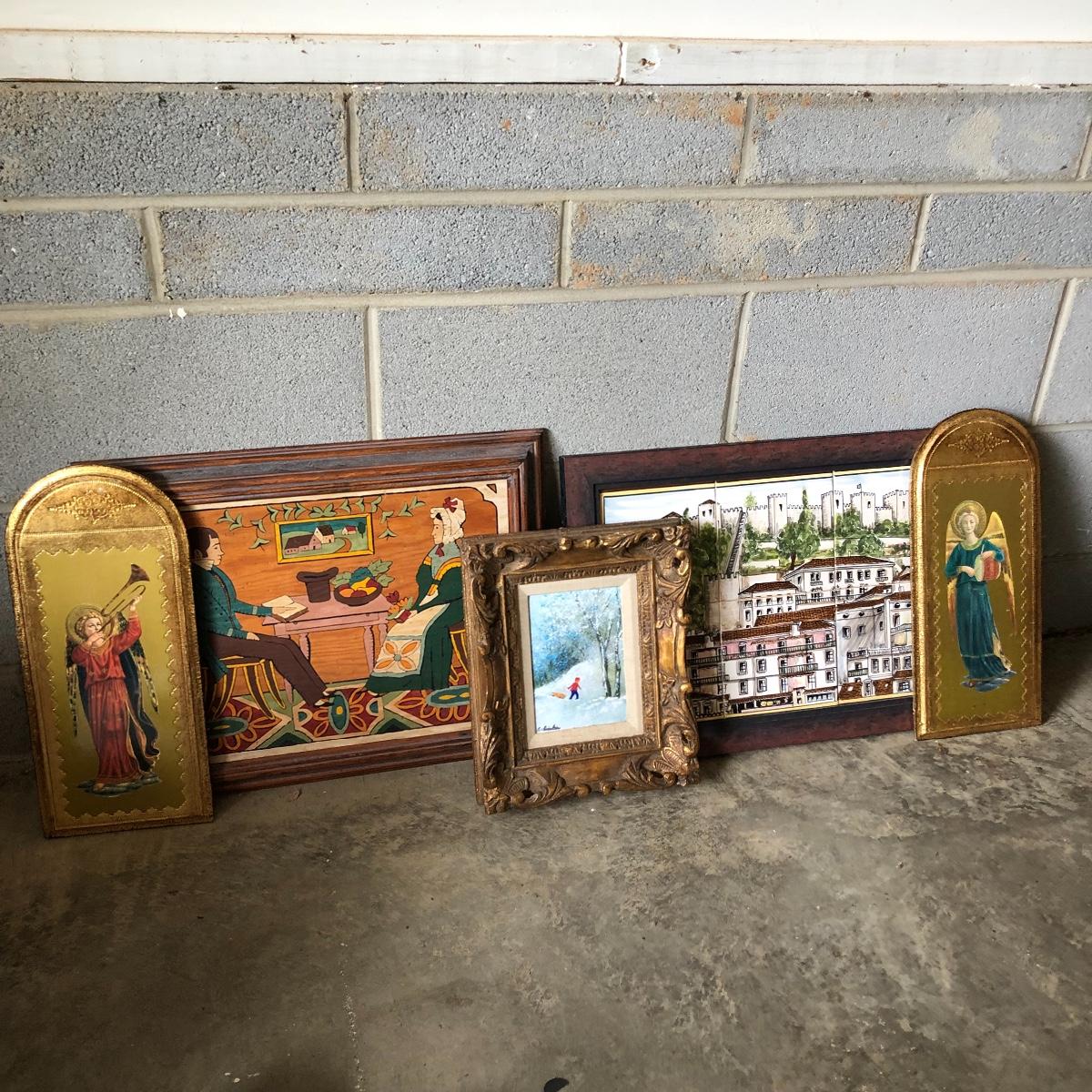 Lot includes framed painted tile, intricately carved wooden frame with artwork on metal, framed painted wooden artwork and two wooden artwork with angels. Largest frame measures 14.5” x 20.5”.