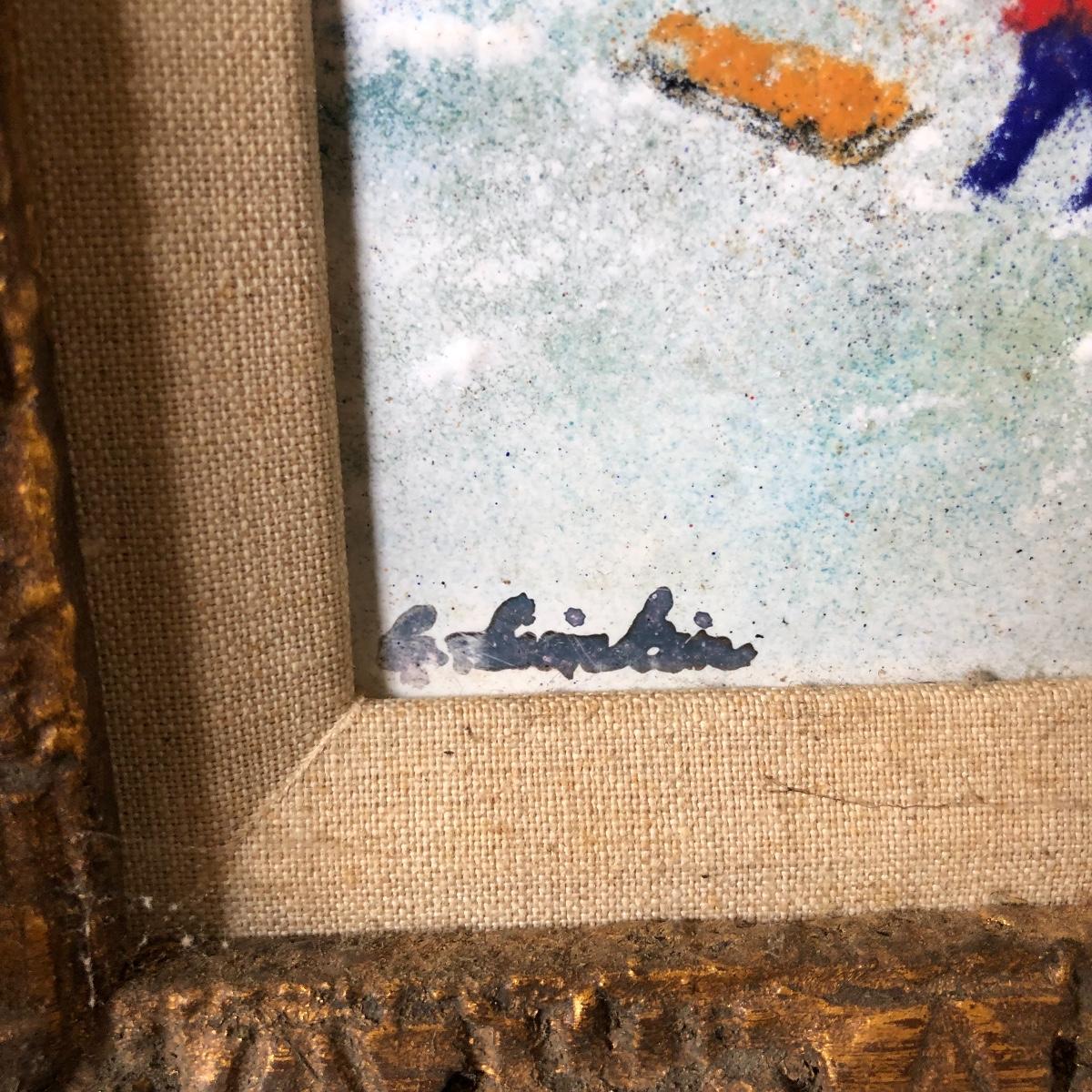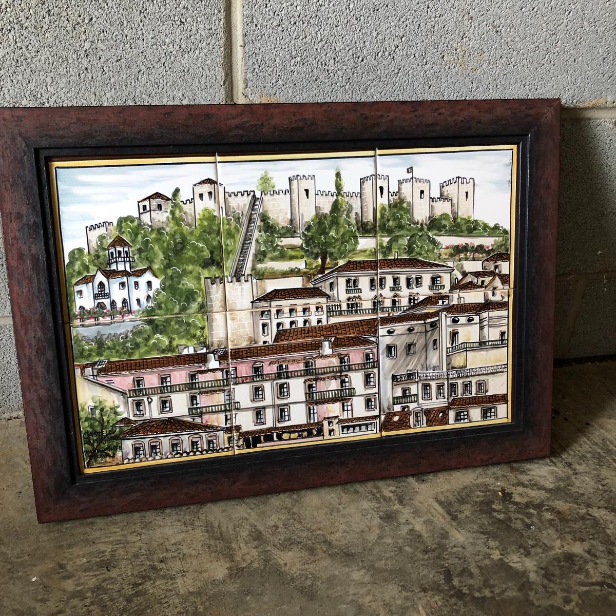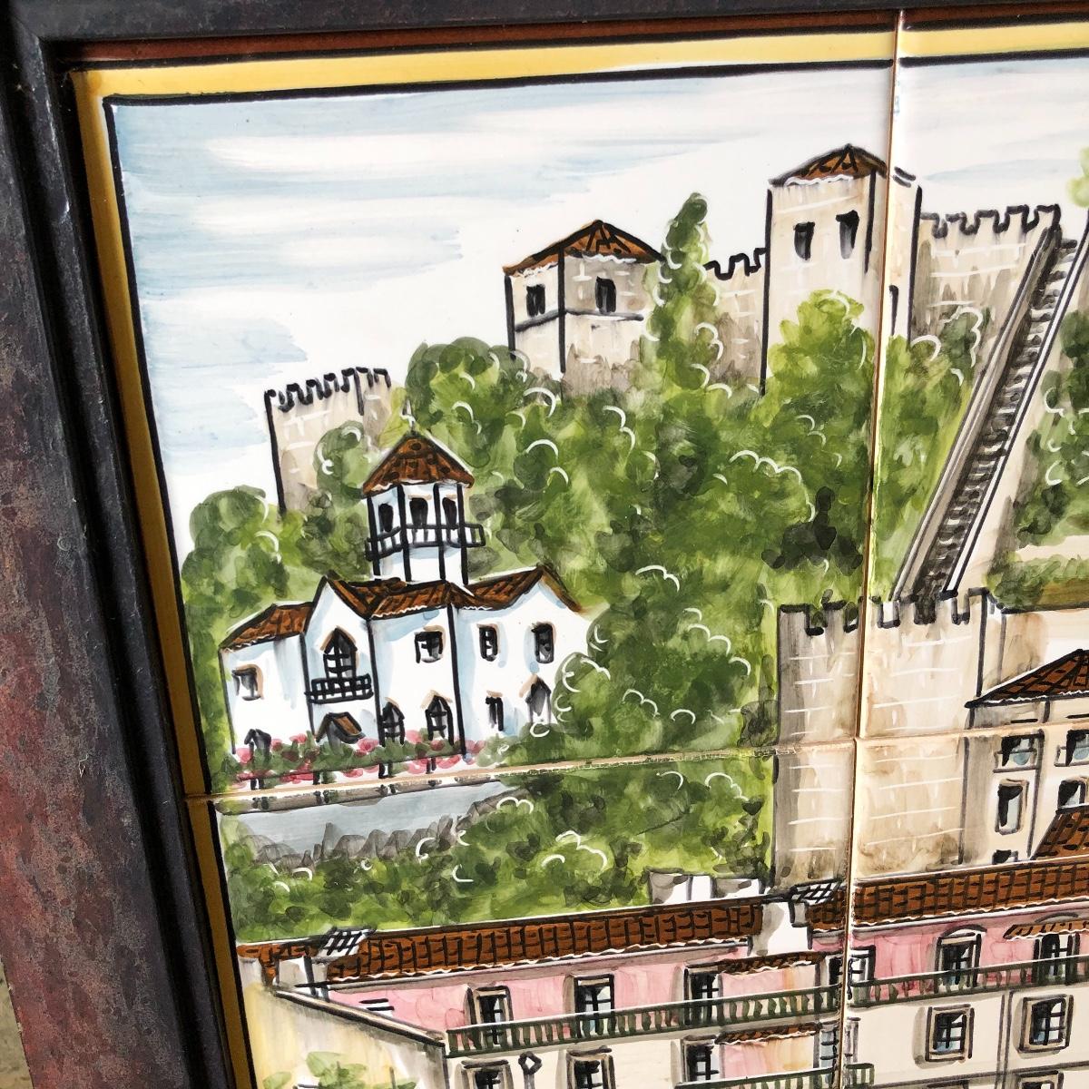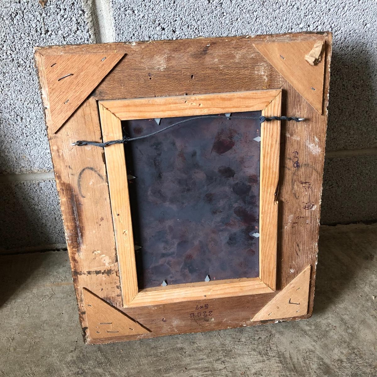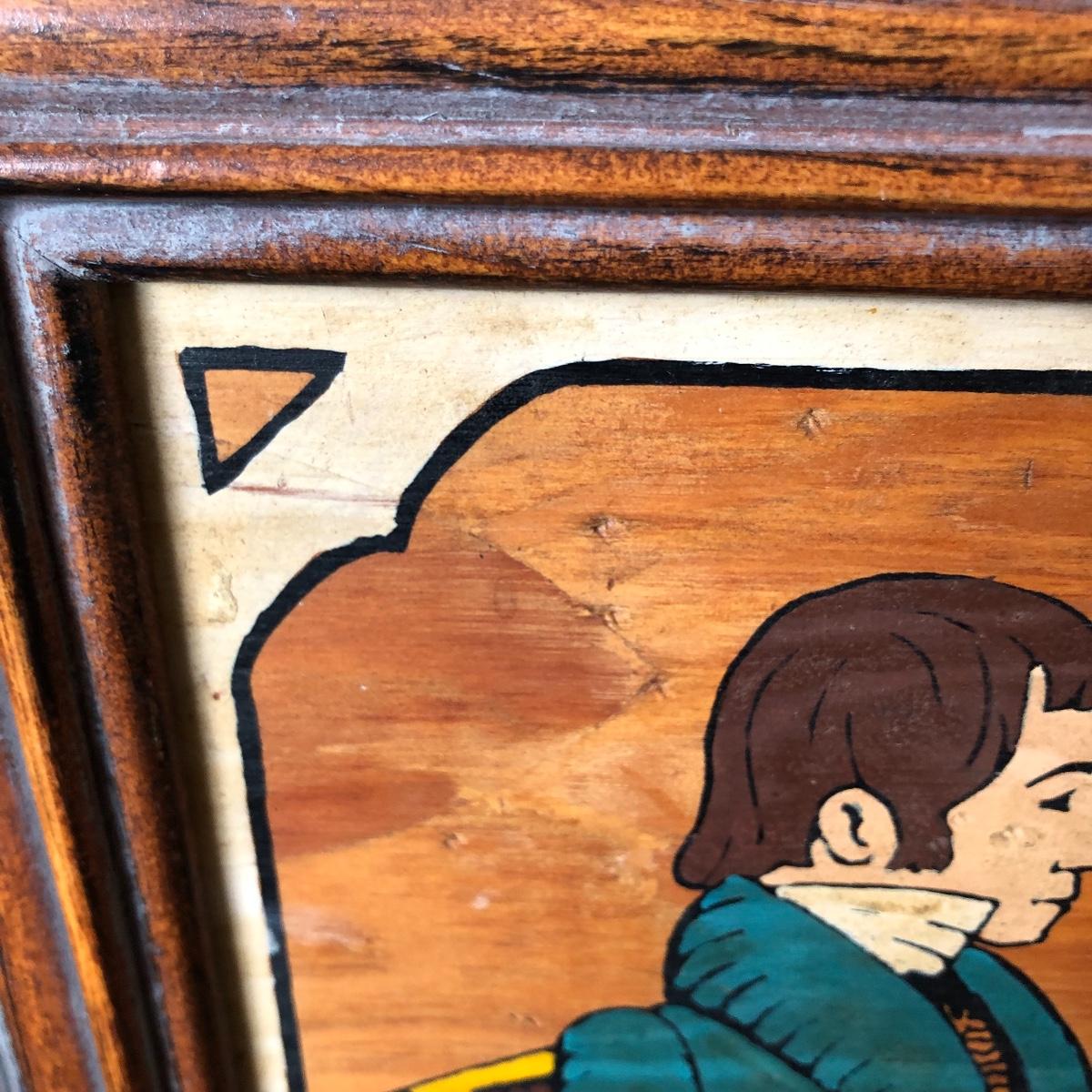 Lot includes framed painted tile, intricately carved wooden frame with artwork on metal, framed painted wooden artwork and two wooden artwork with angels. Largest frame measures 14.5” x 20.5”.