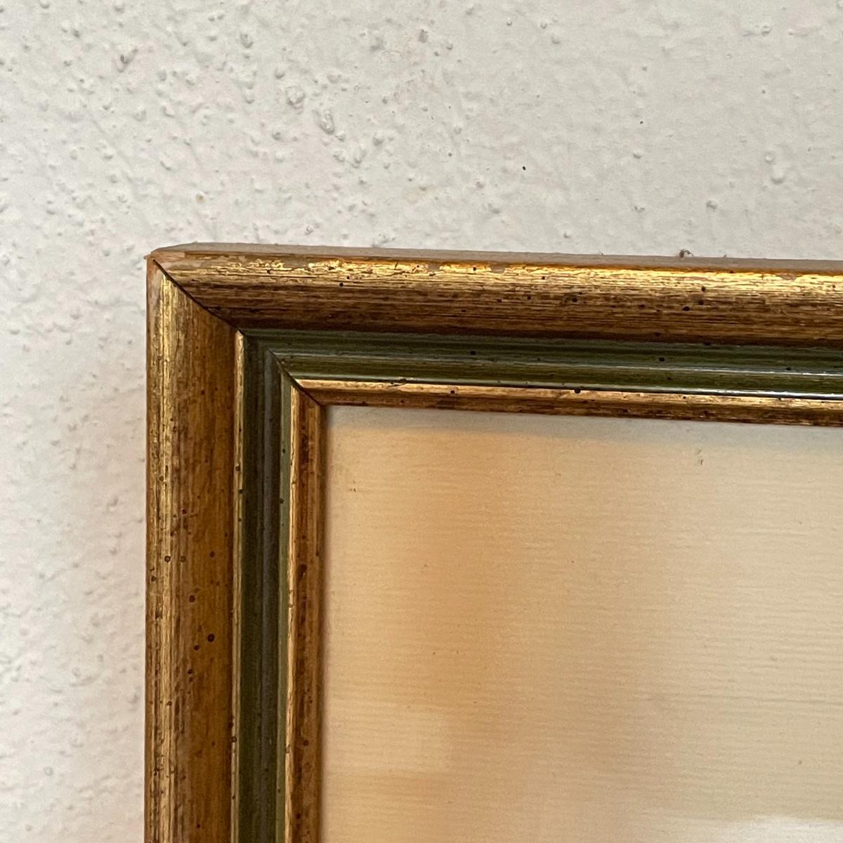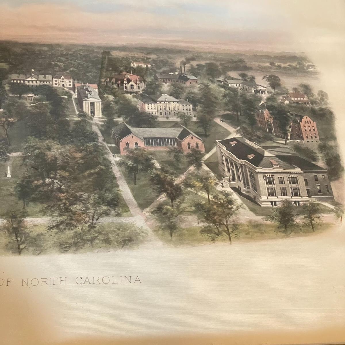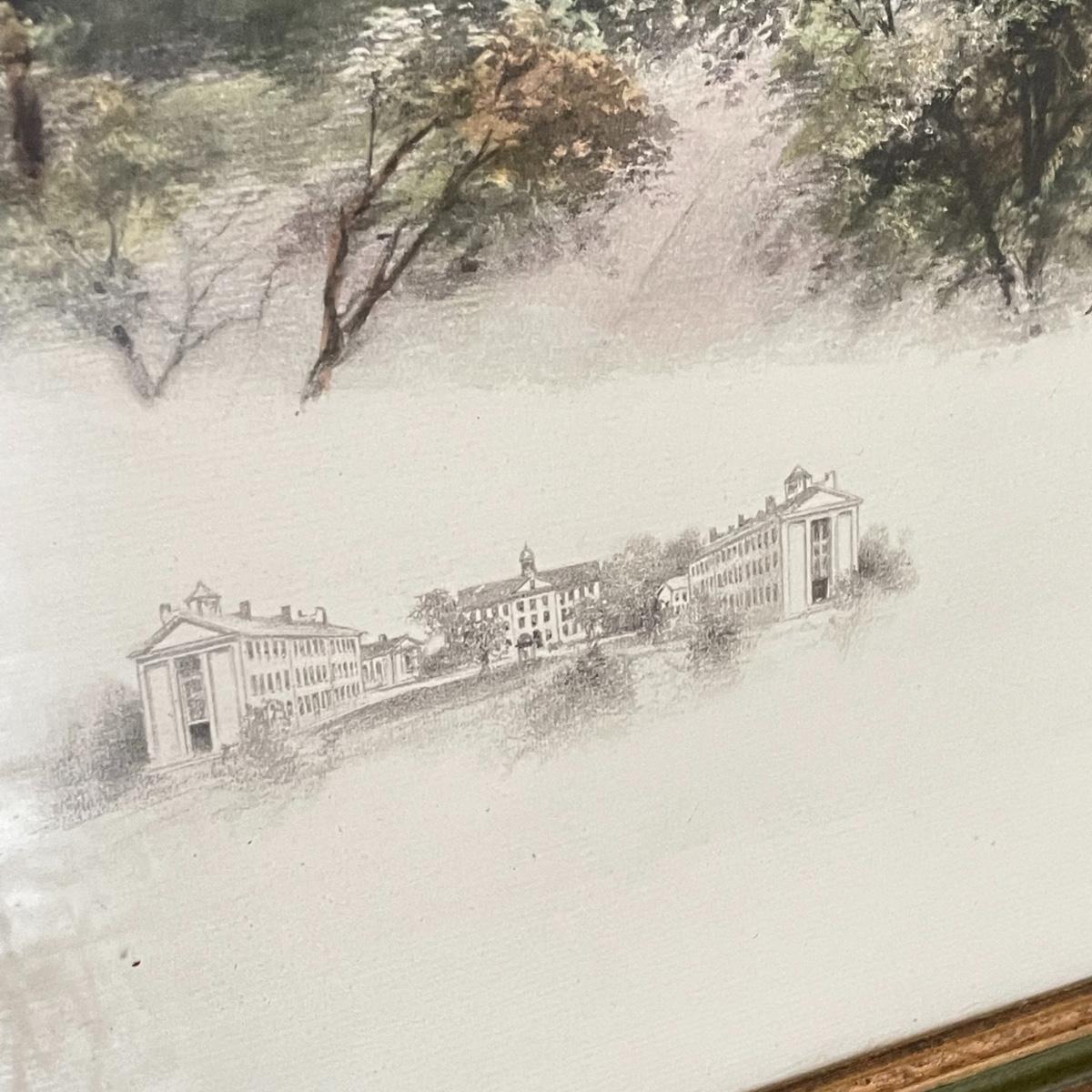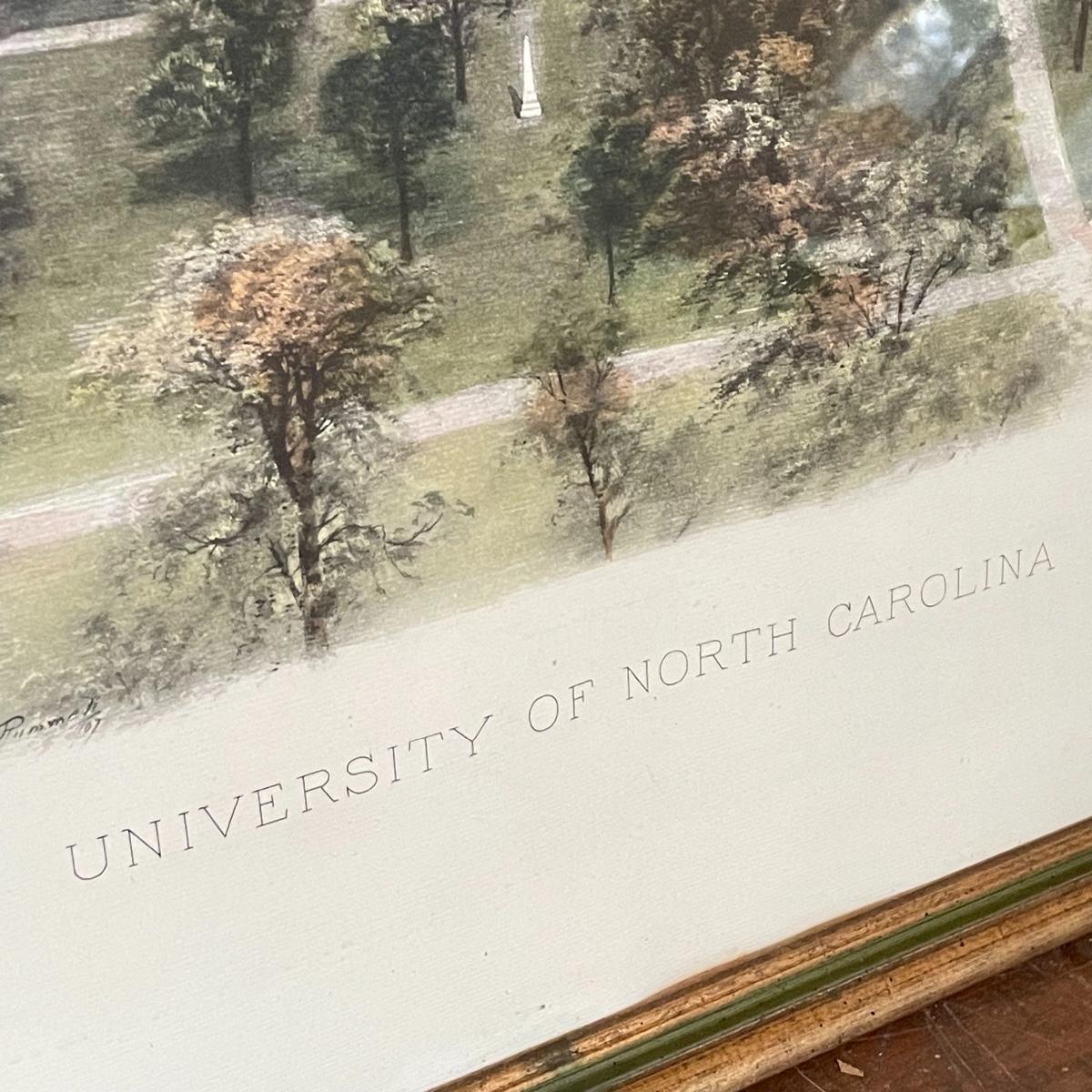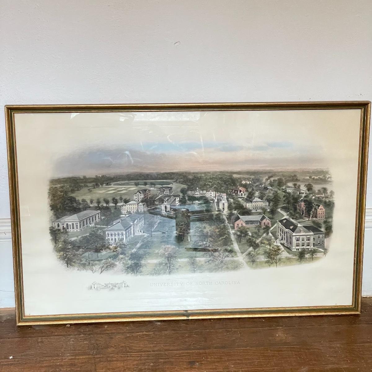 UNC campus print behind glass in a gold and green painted wooden frame. Frame measures 33.5” x 21”. Shipping available. Please call UPS with dimensions at 828-252-6930 for a shipping quote prior to bidding.