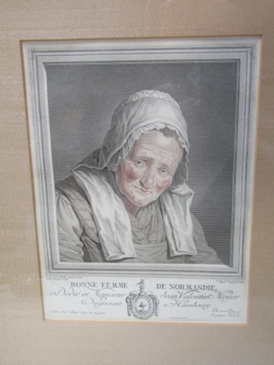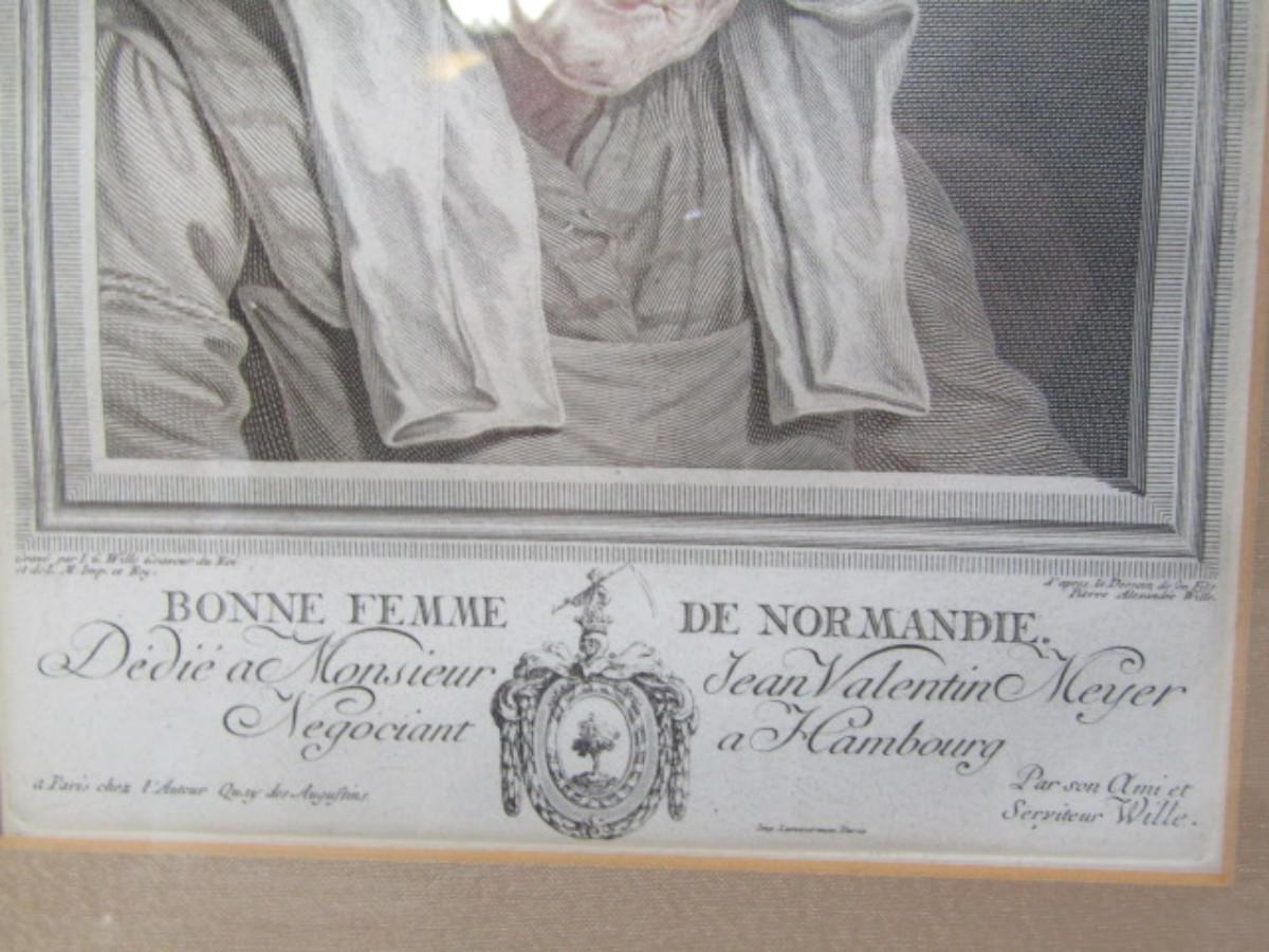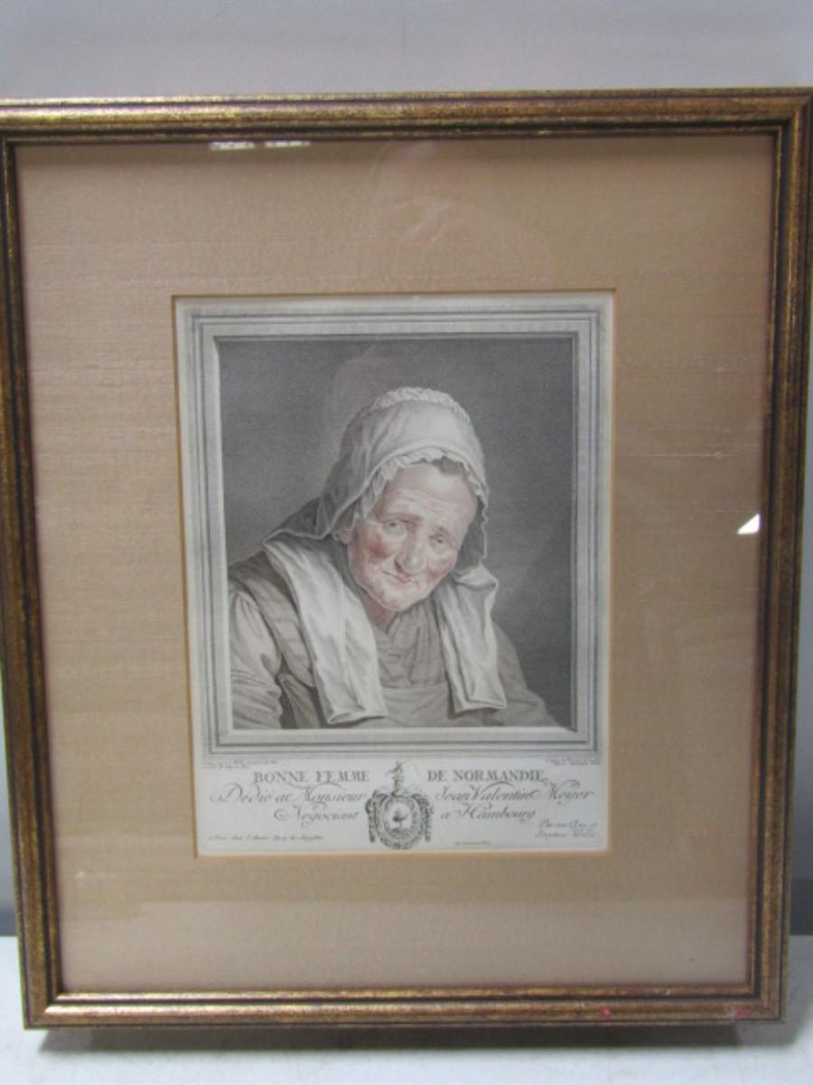 Framed Under Glass-'Bonne Femme de Normandie' French Engraved Print- Approx 14" x 16 1/2"