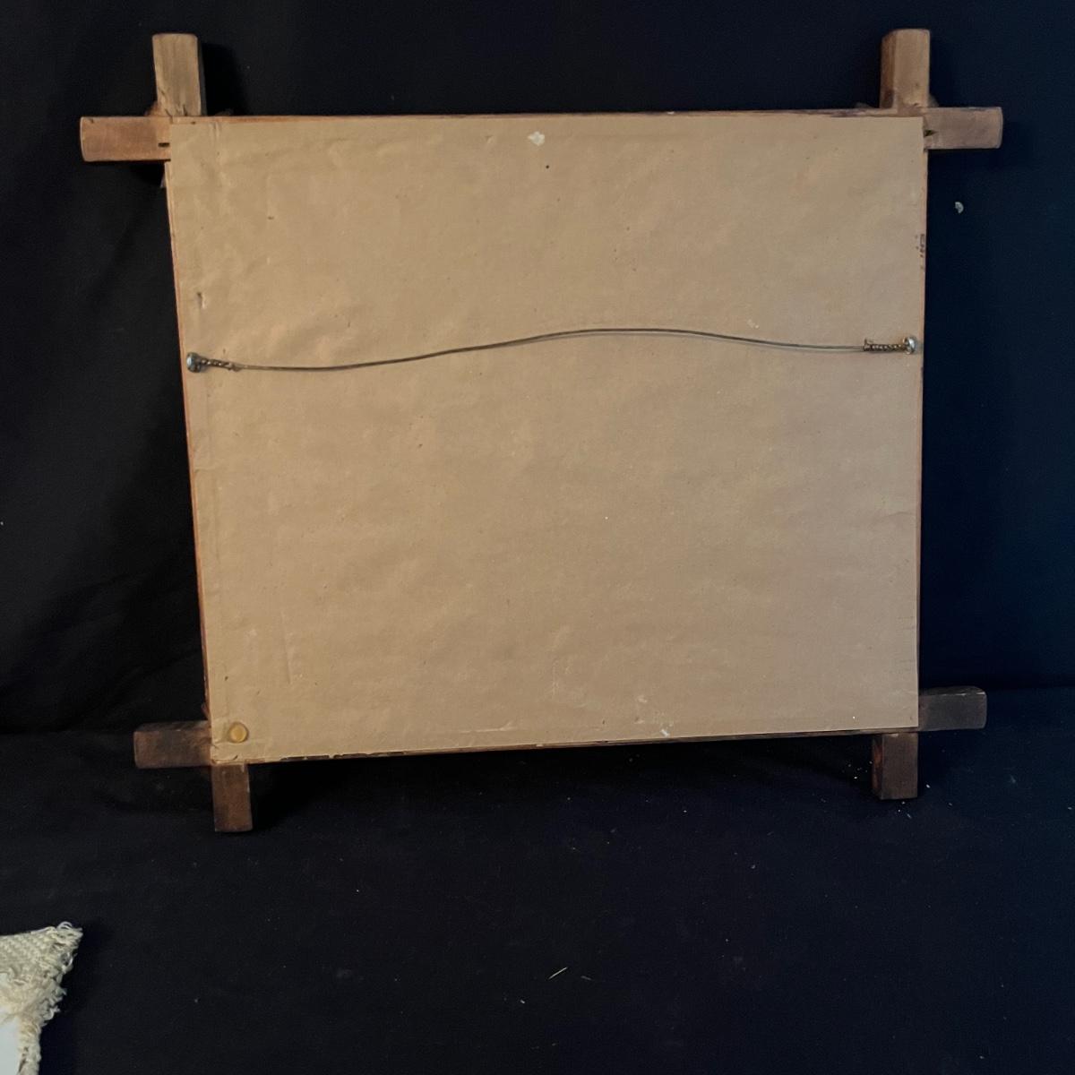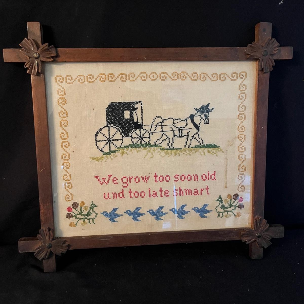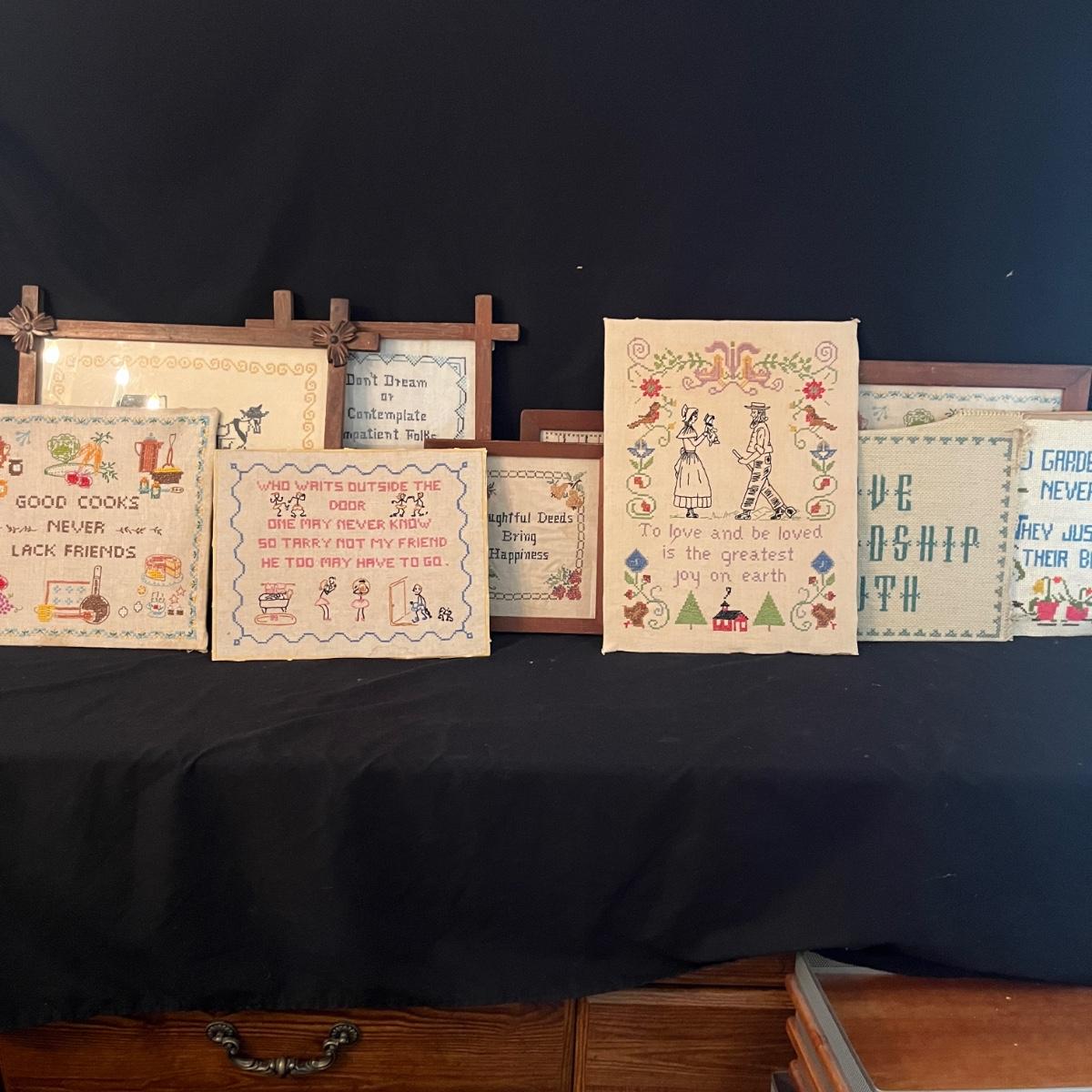 Lot includes five unframed pieces of cross stitch and six wooden framed pieces of cross stitch under glass. Largest frame measures 19” x .5” x 17”H.