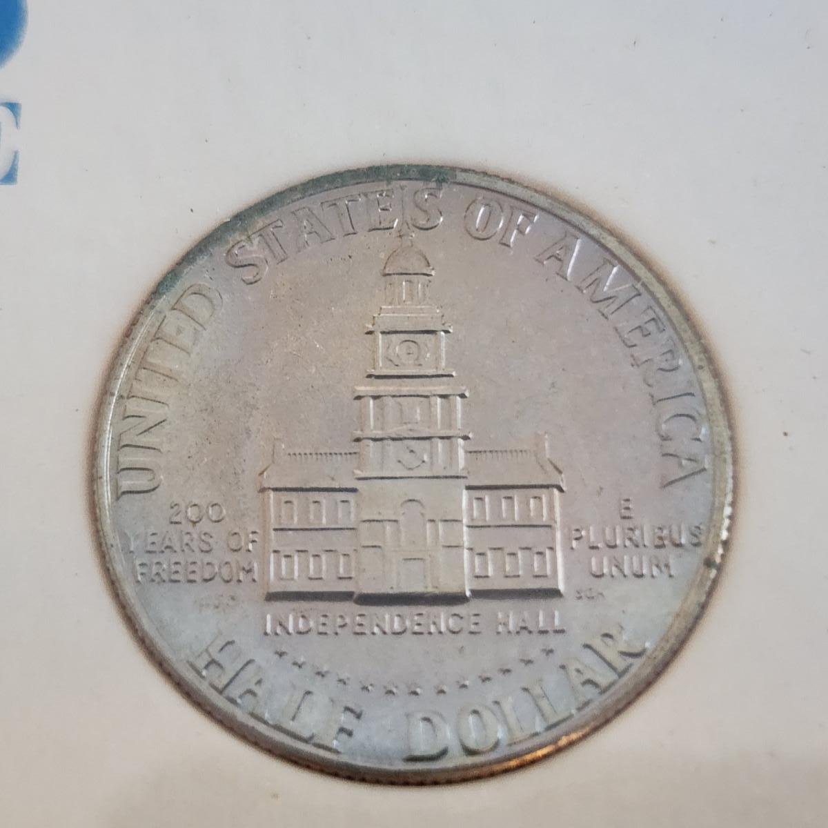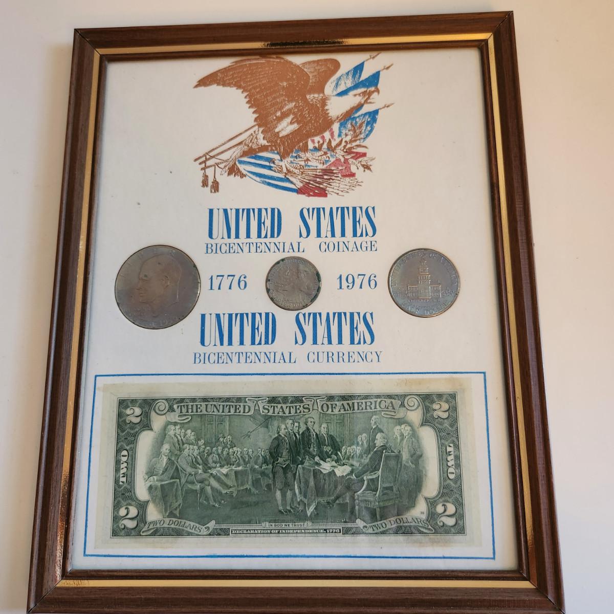 This auction lot is for a Framed United States Bicentennial Coin and Bill Tribute, The display contains an Eisenhower Bicentennial Silver Dollar, a Bicentennial Quarter, Half Dollar Coin and a $2 Bill showing the verso only - the framed piece has not been dismantled to view the front of the bill or any of the coins. Buying as is. This item is KY sales tax-exempt.