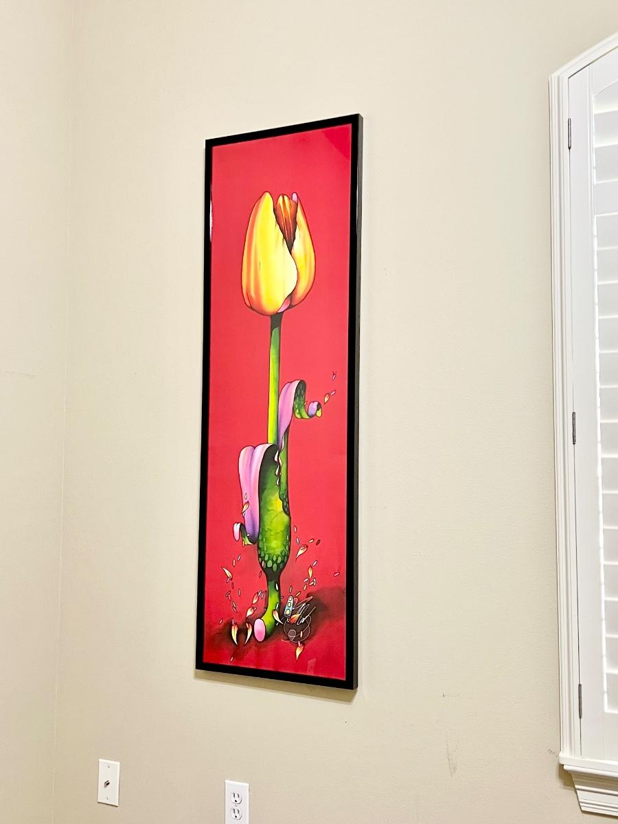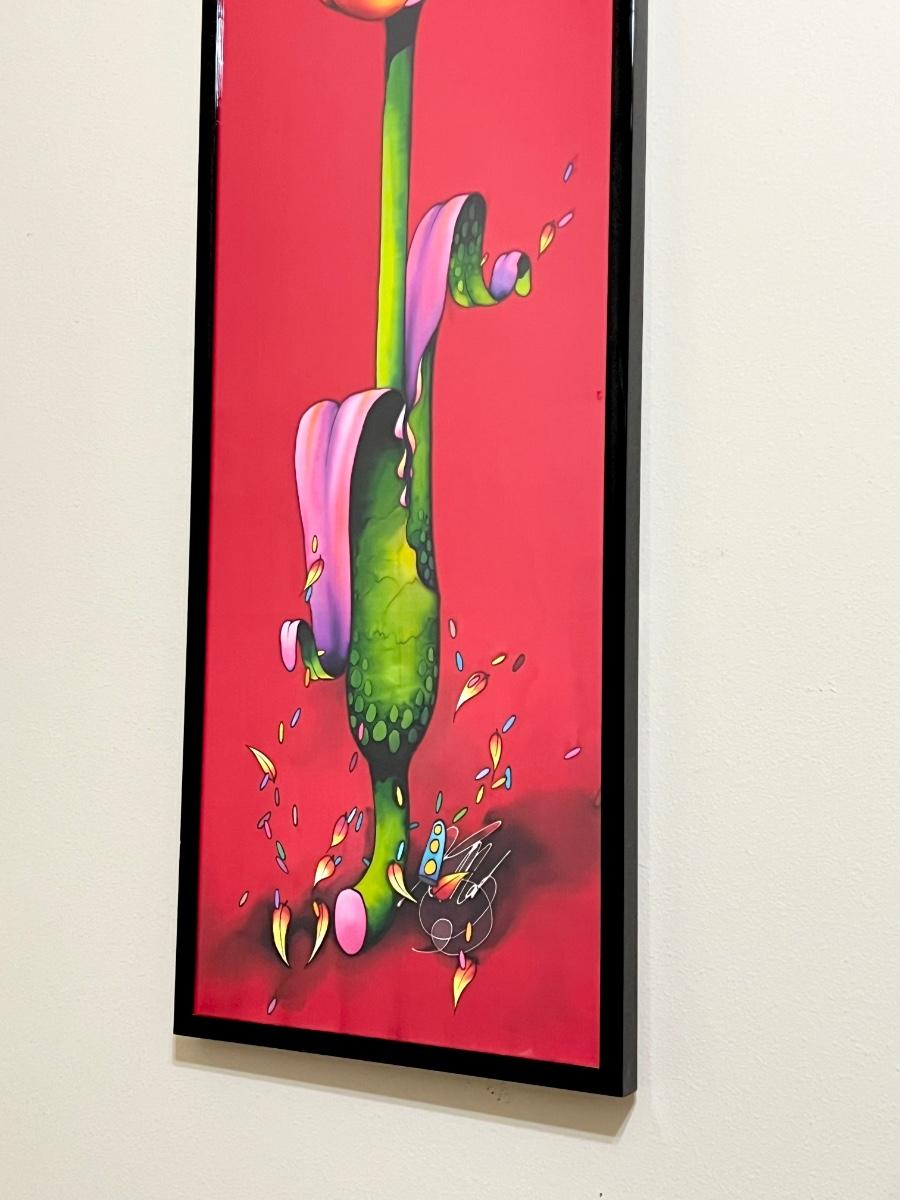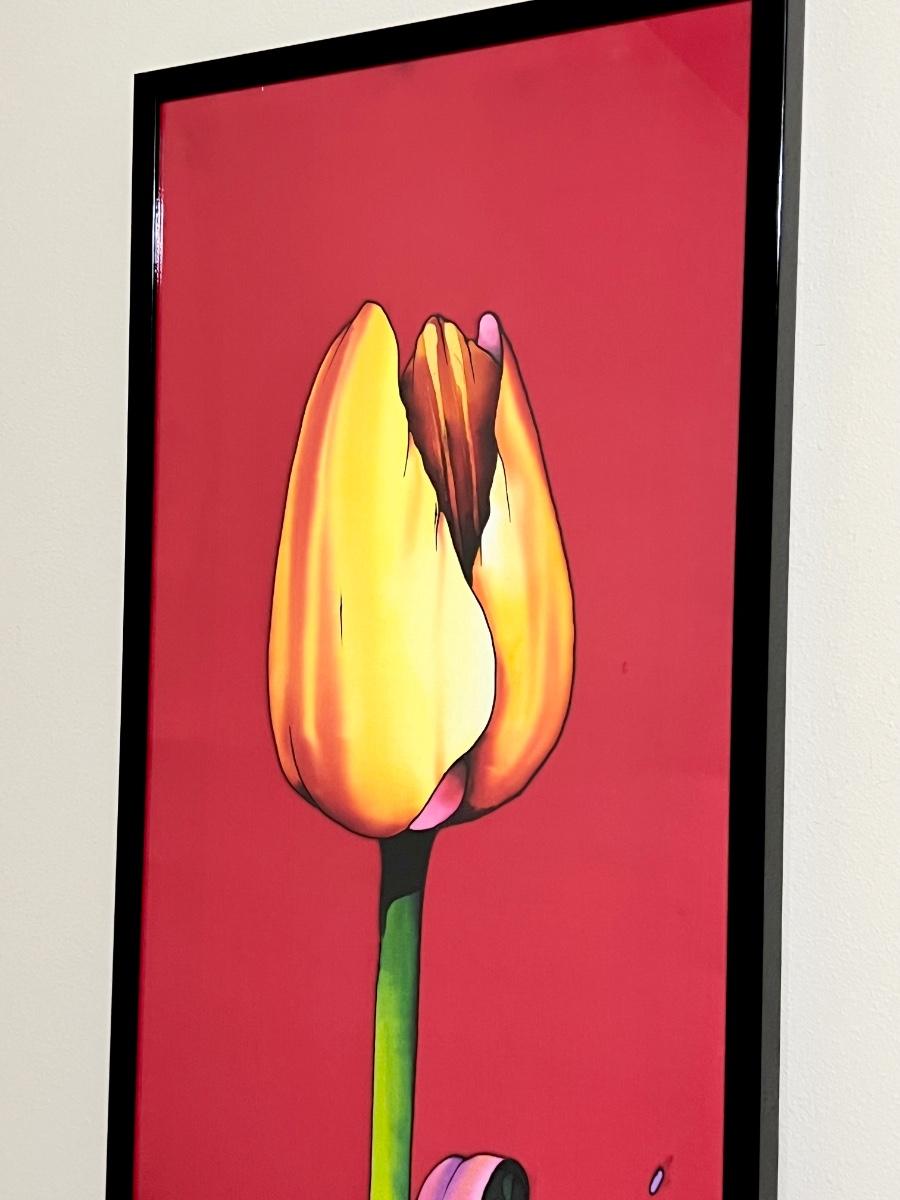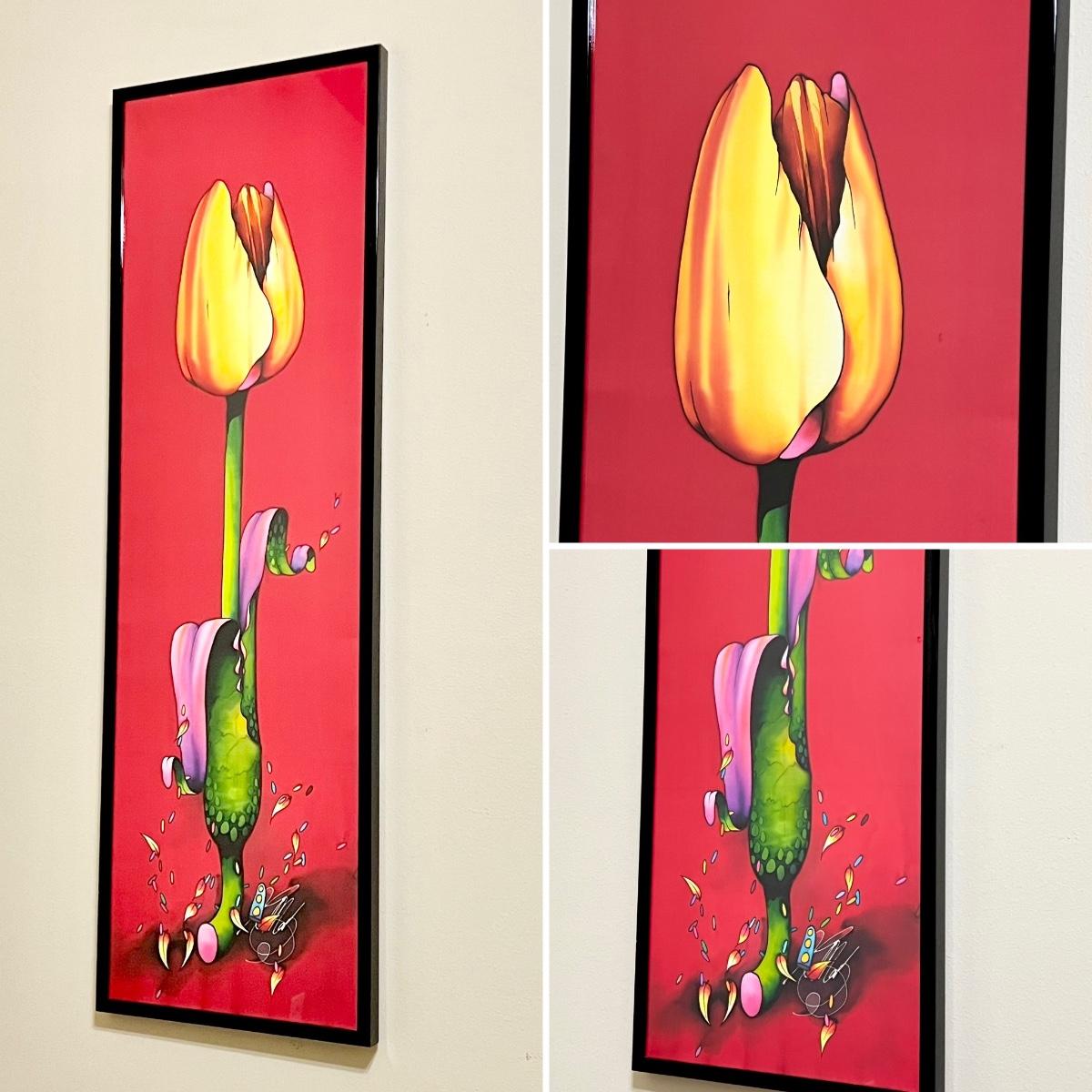 HENK MAK ~ Framed Vibrant Original Painted Tulip Silk Scarf Behind Acrylic