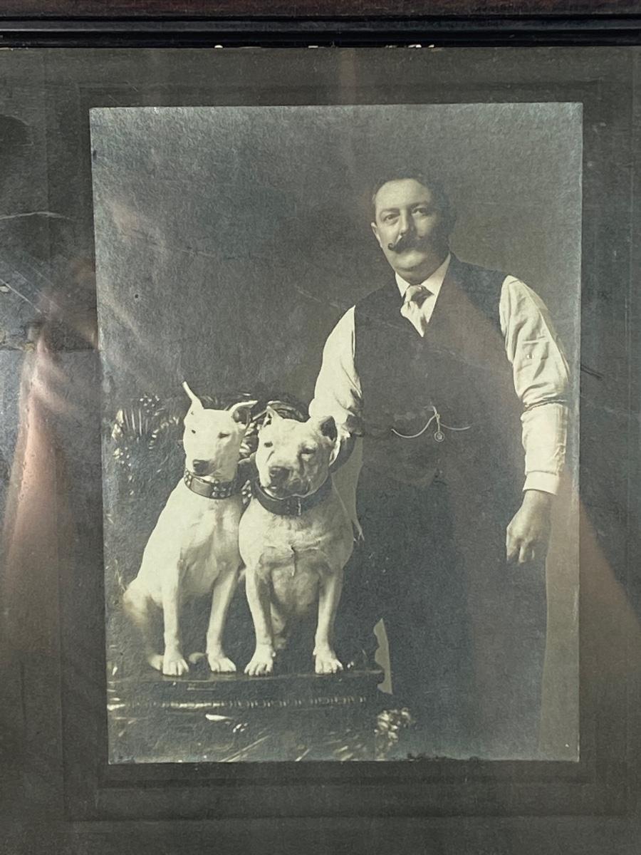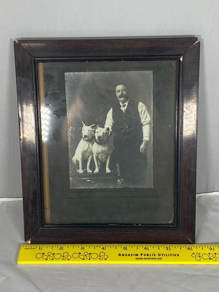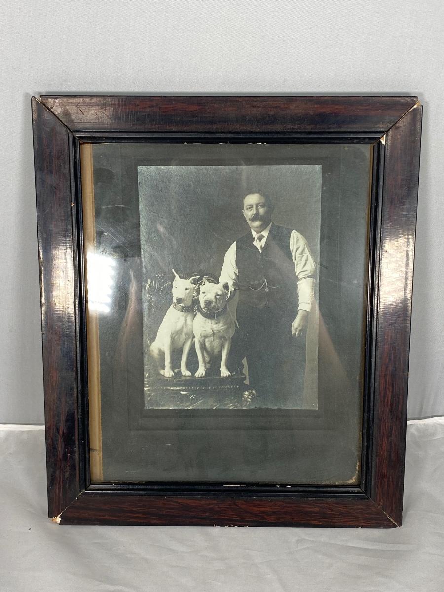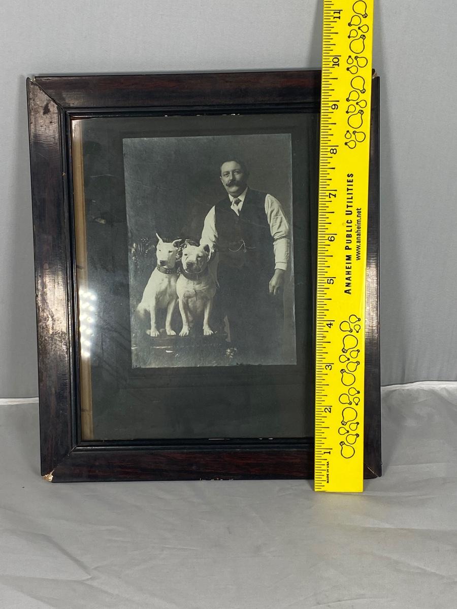 Framed Victorian Era Man with his Two White Bull Terrier Dogs Photograph